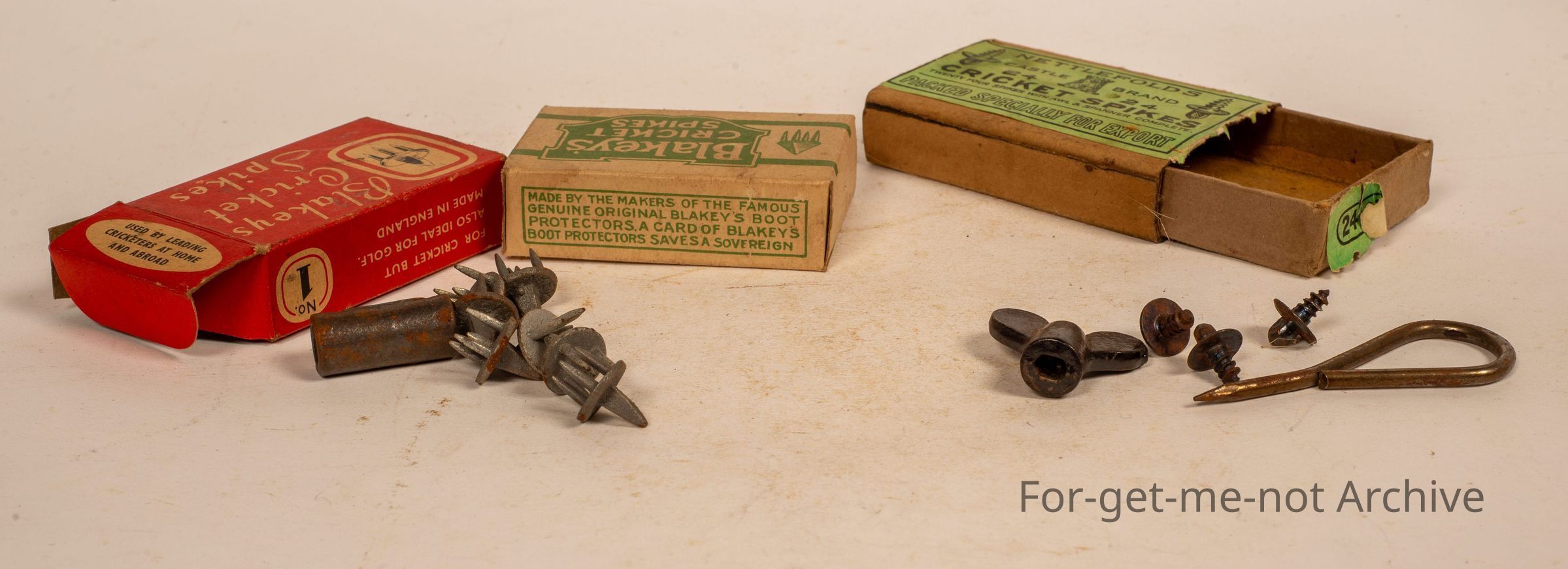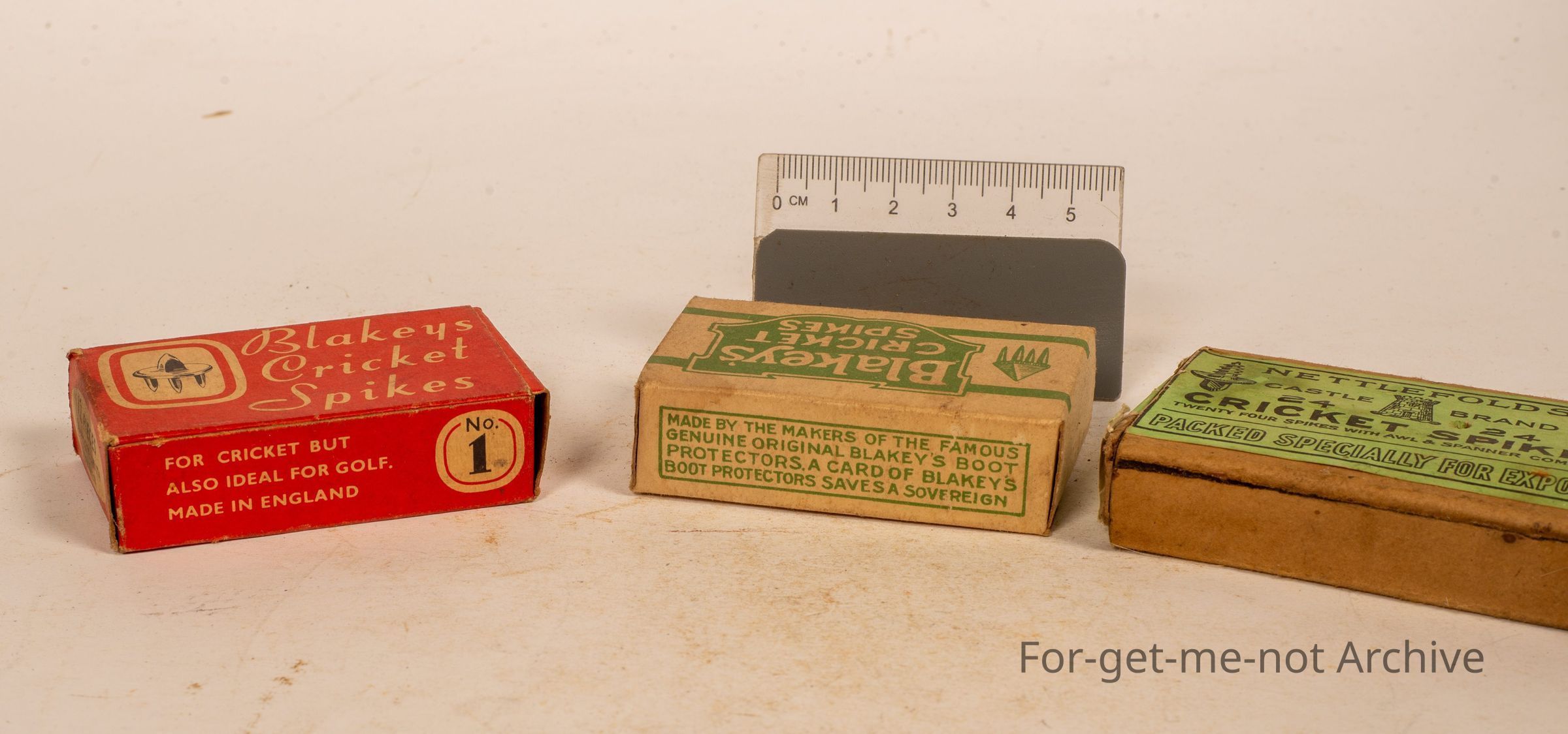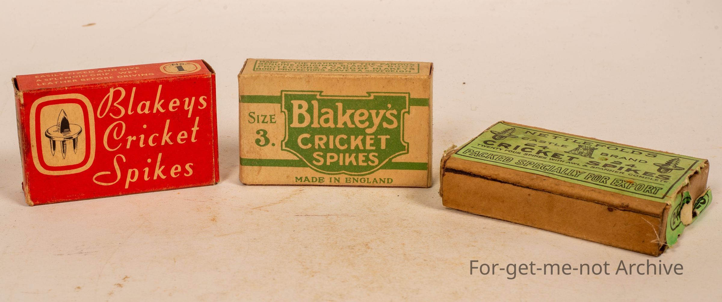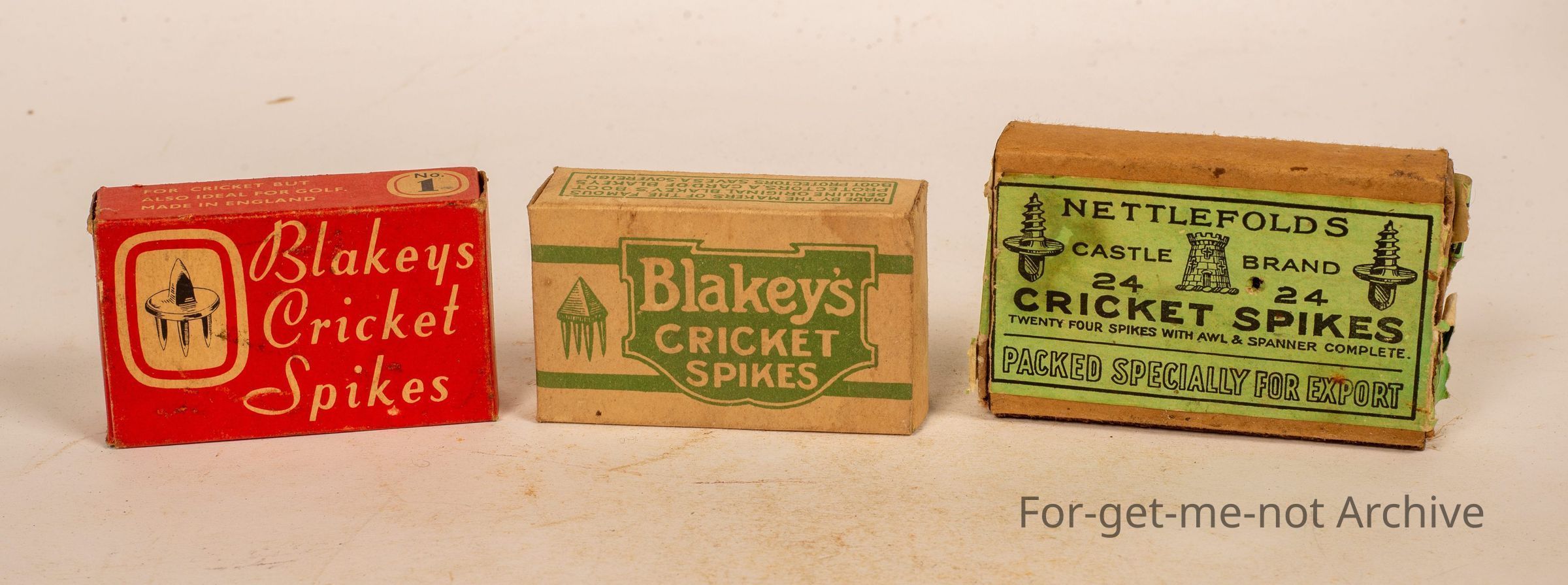 3 boxes, all cricket related, Blakey's cricket spikes and Netlford's Cricket Spikes, the group of 3 cardboard boxes, green, one red, Netlford's green as well, packed especially for export.Collection