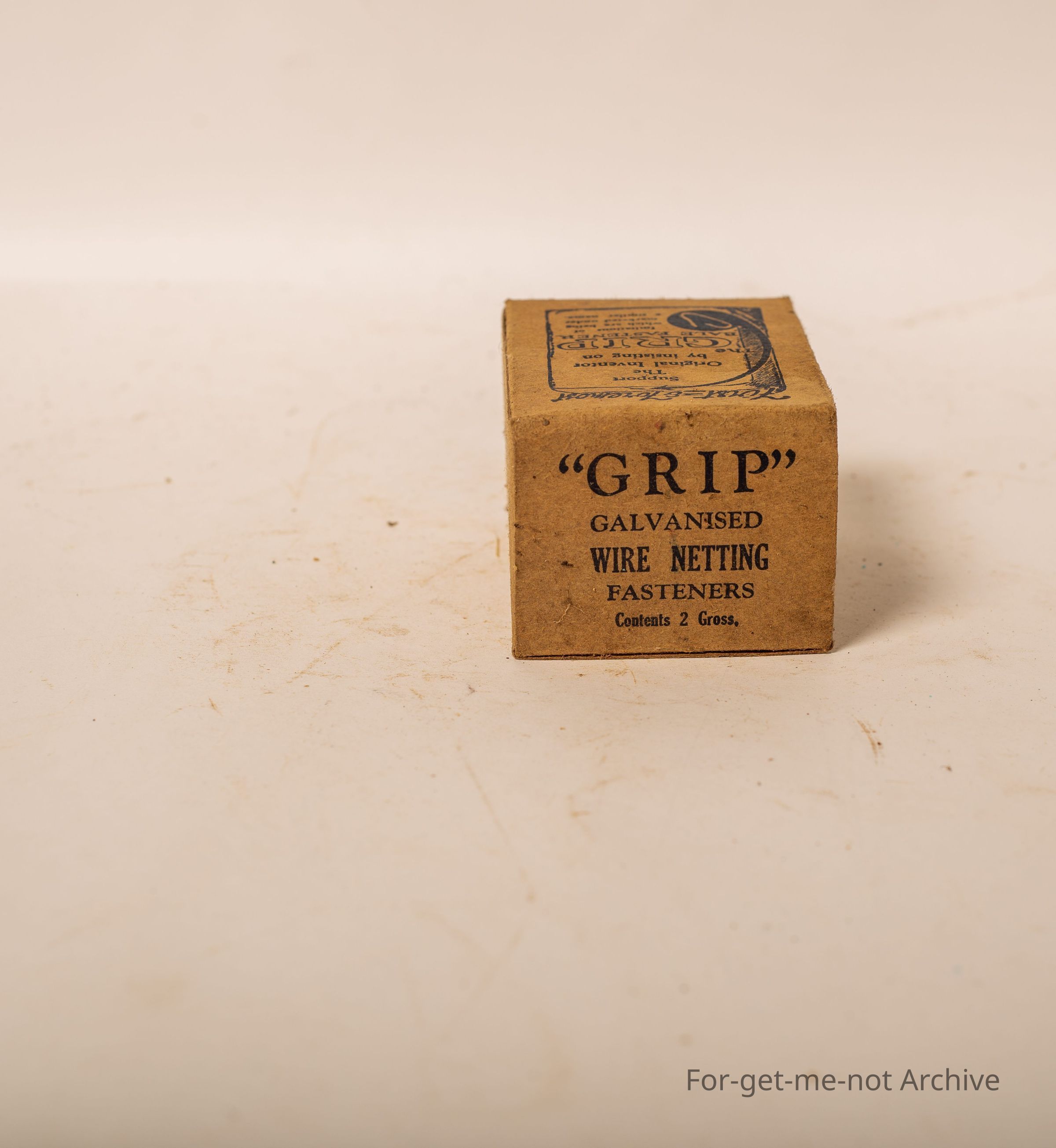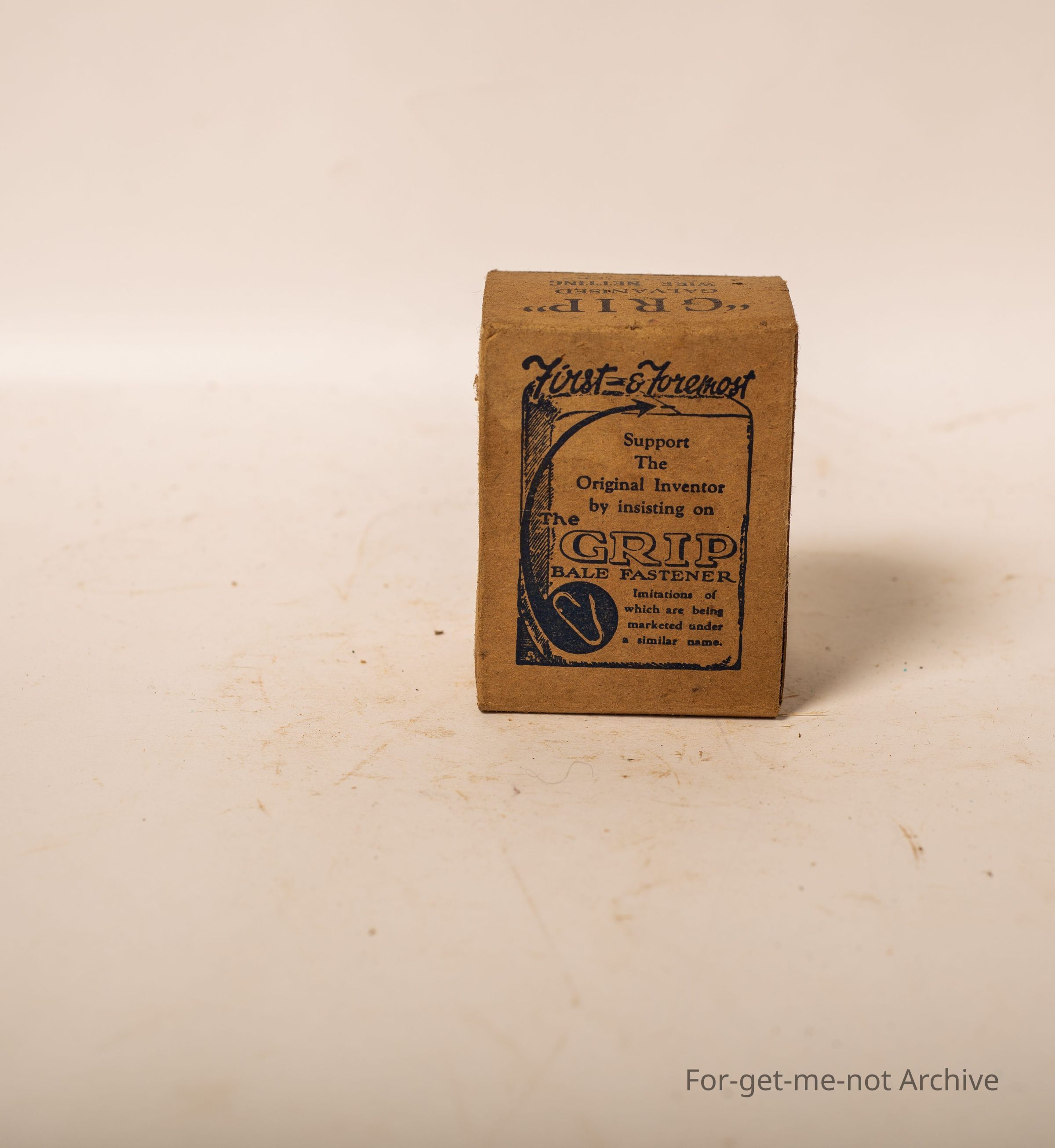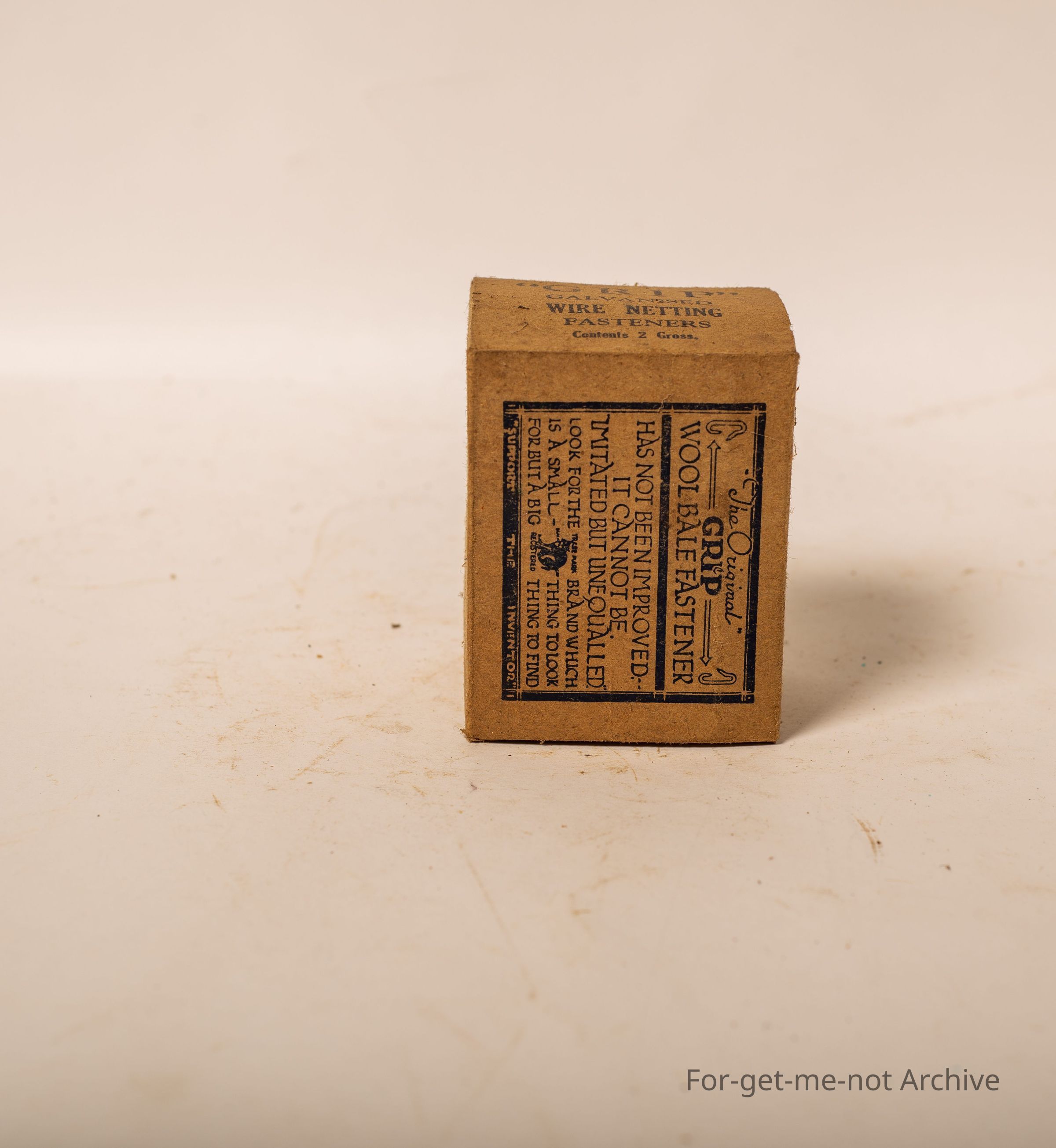Is a cardboard box. Of Grip galvanized netting fasteners. Contents, 2 gross. Also advertising the wool bail clips on the box manufactured by Hurst and Hughes Geelong Victoria.