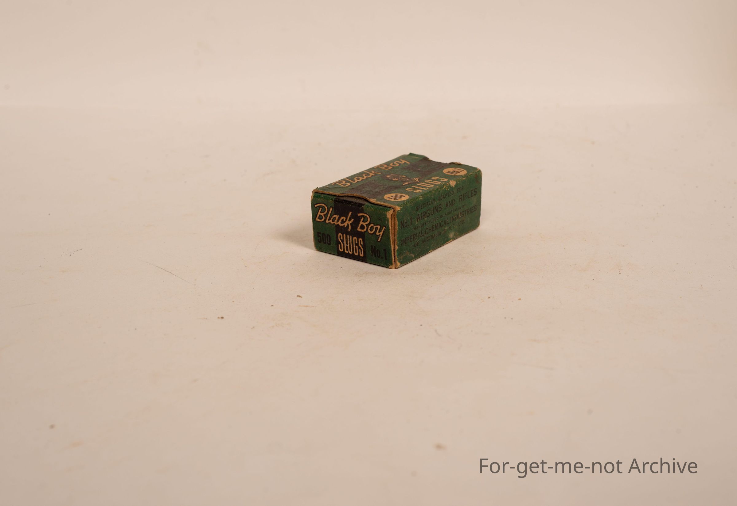 Cardboard box of blackberry slugs for air rifles. 500 in the box. Quite a rare box to find these days.