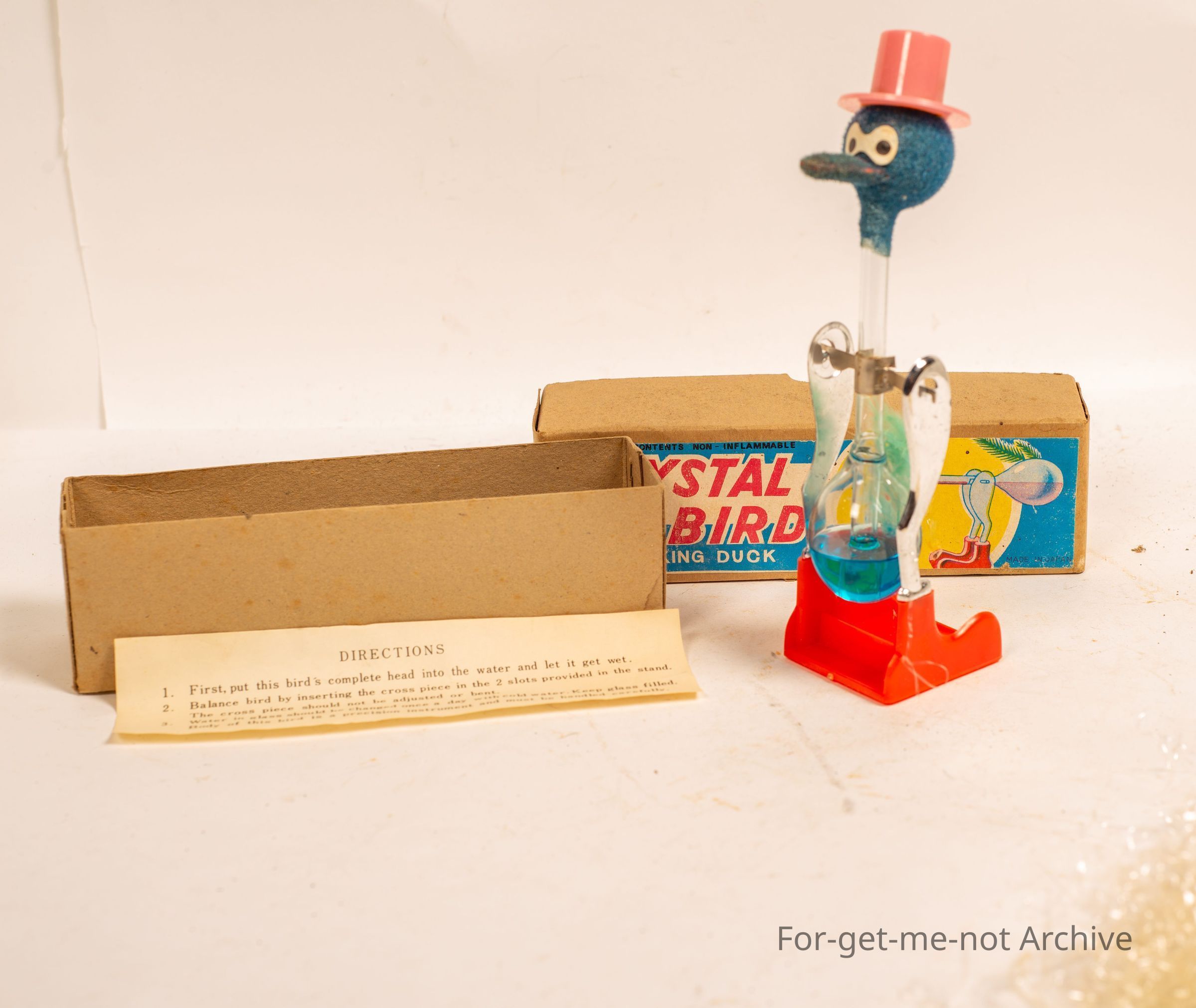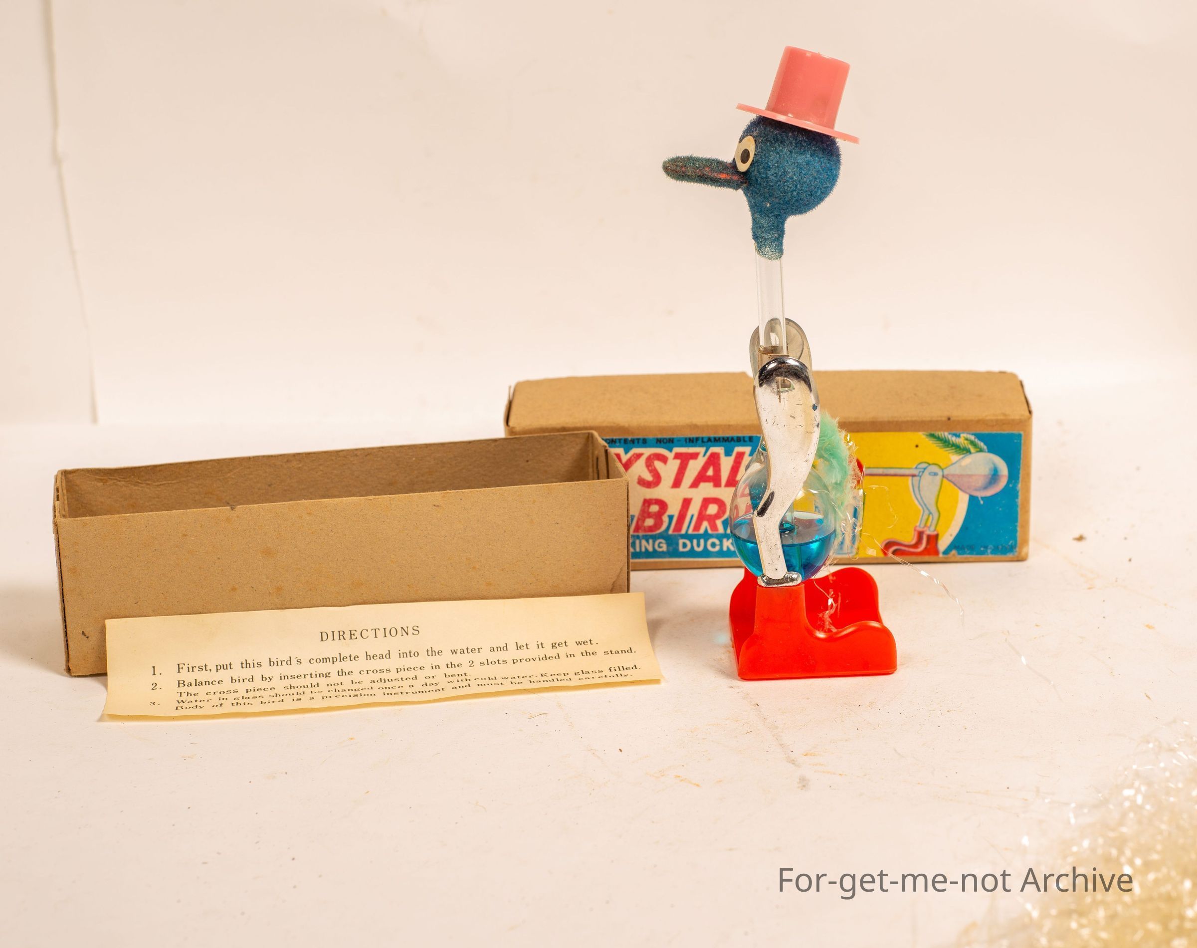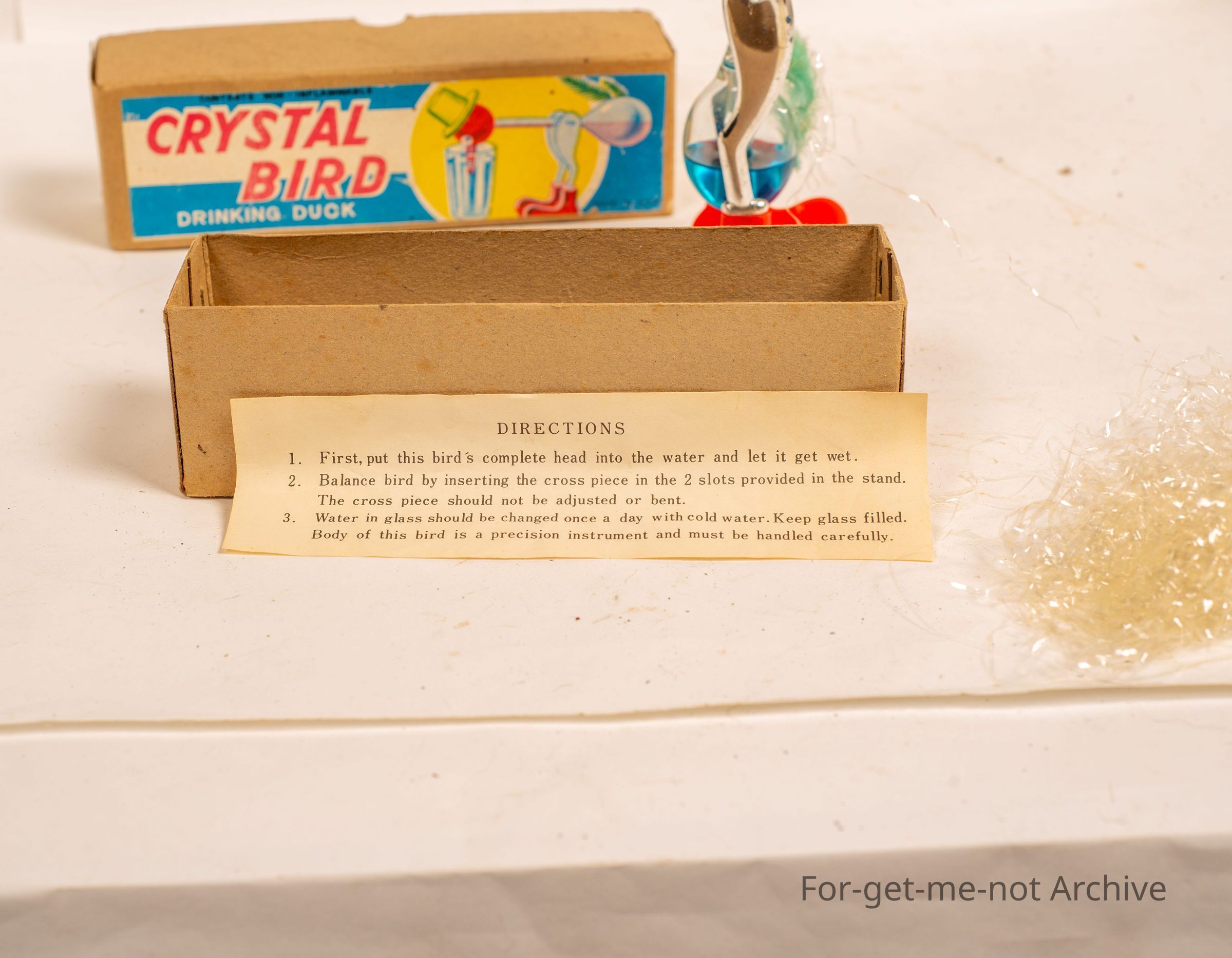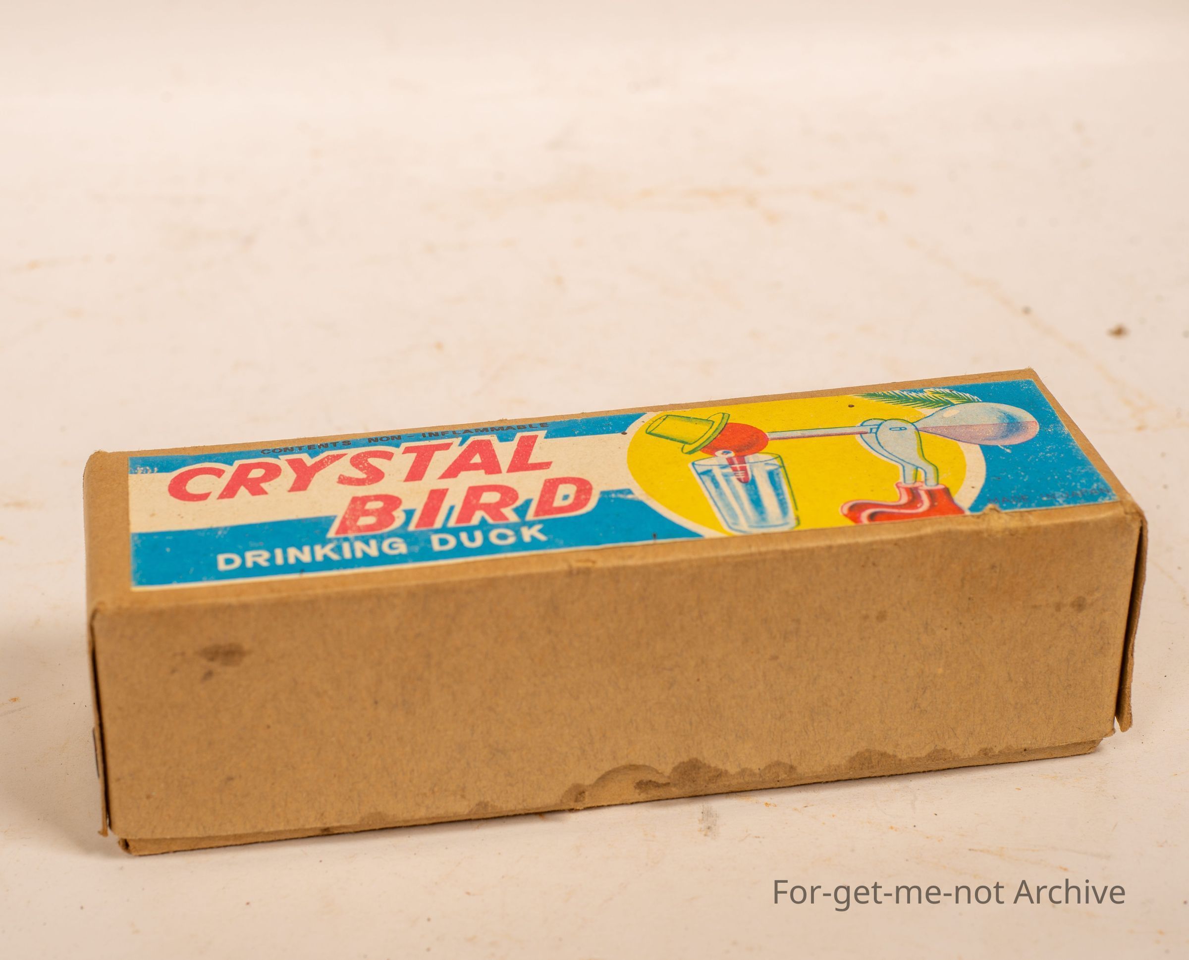 Is a, cardboard box with a crystal bird drinking duck, which is intact inside