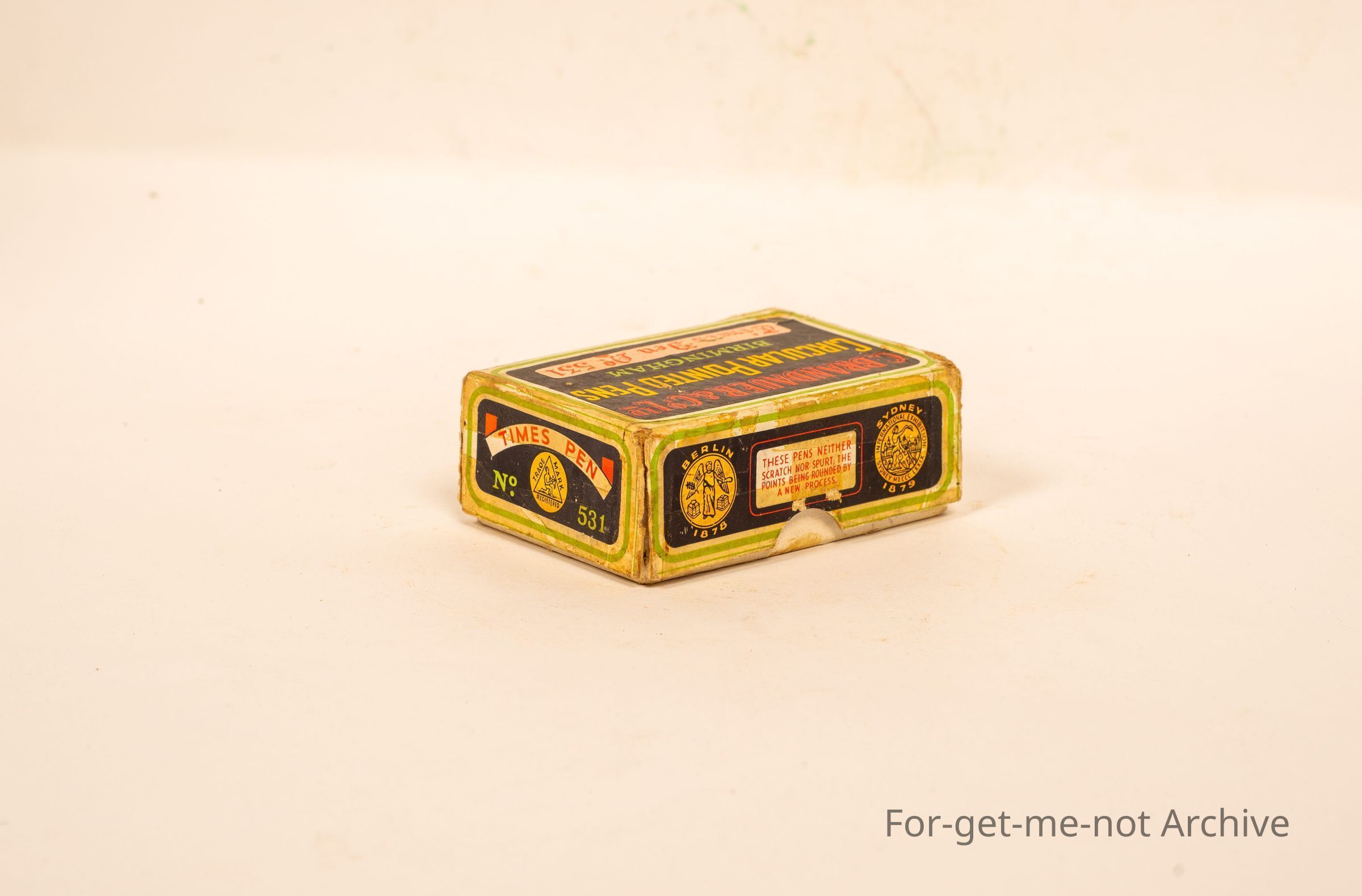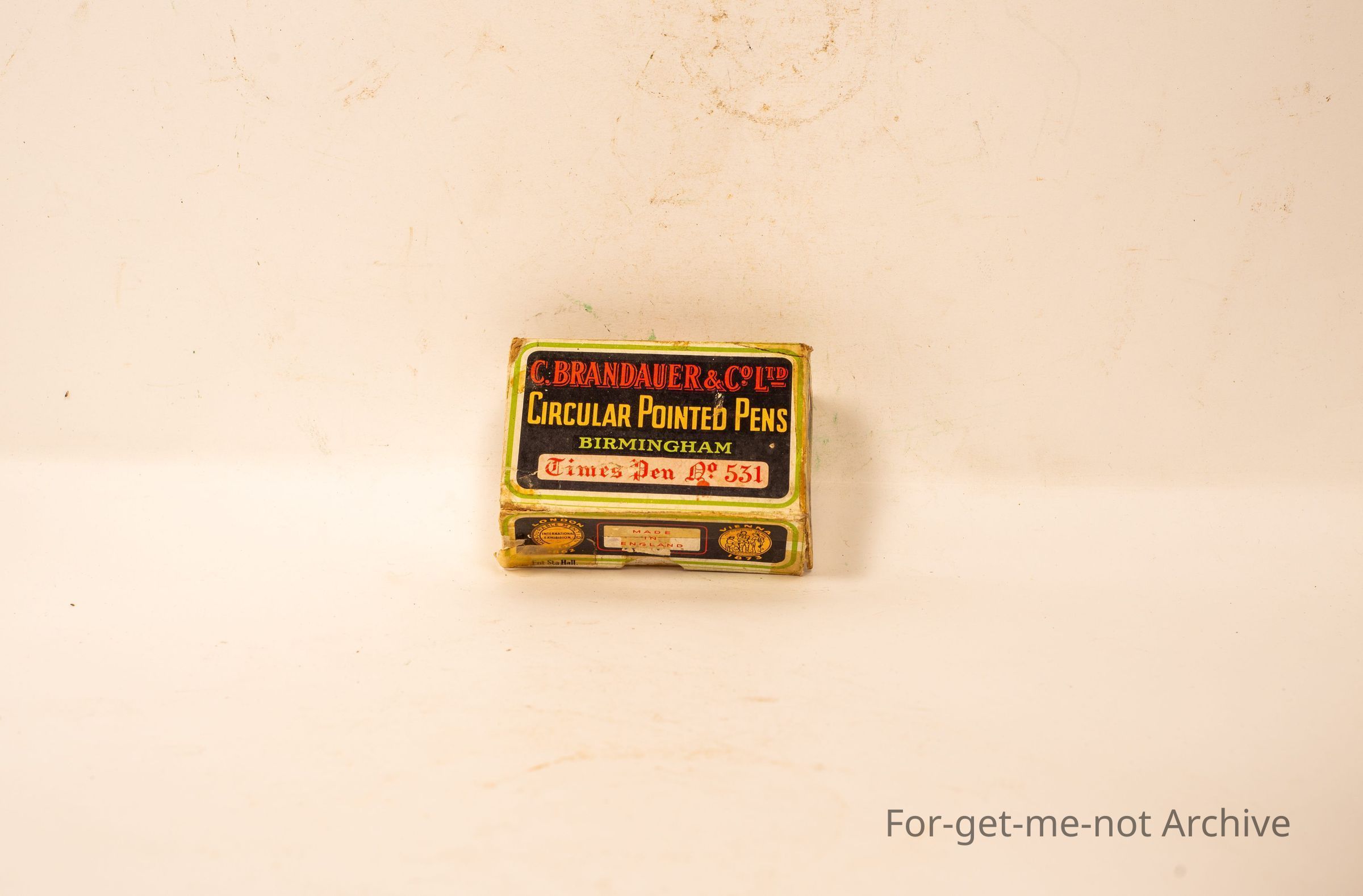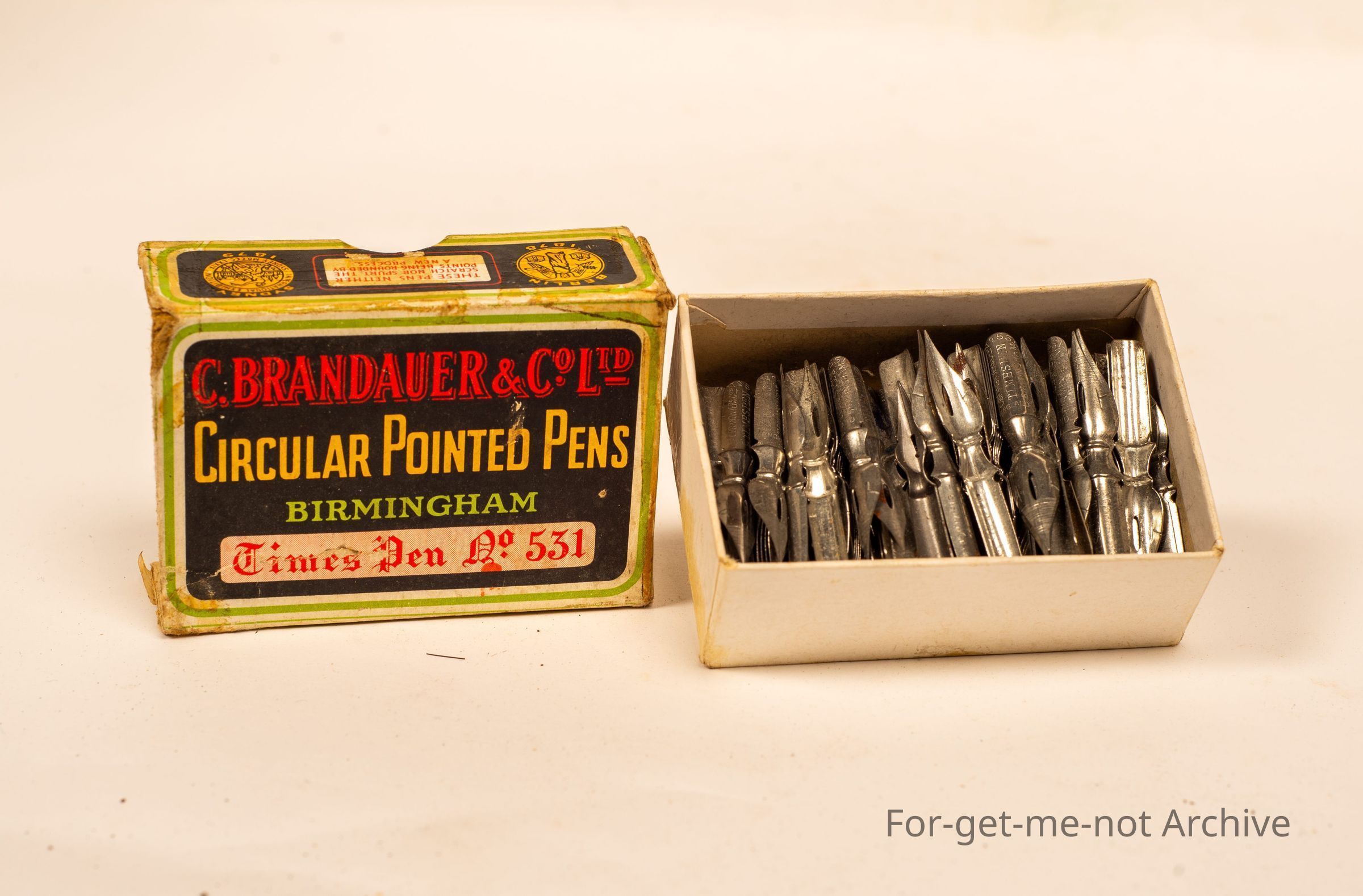 Cardboard box of circular pointed pens, Birmingham, with context contents of nibs.
