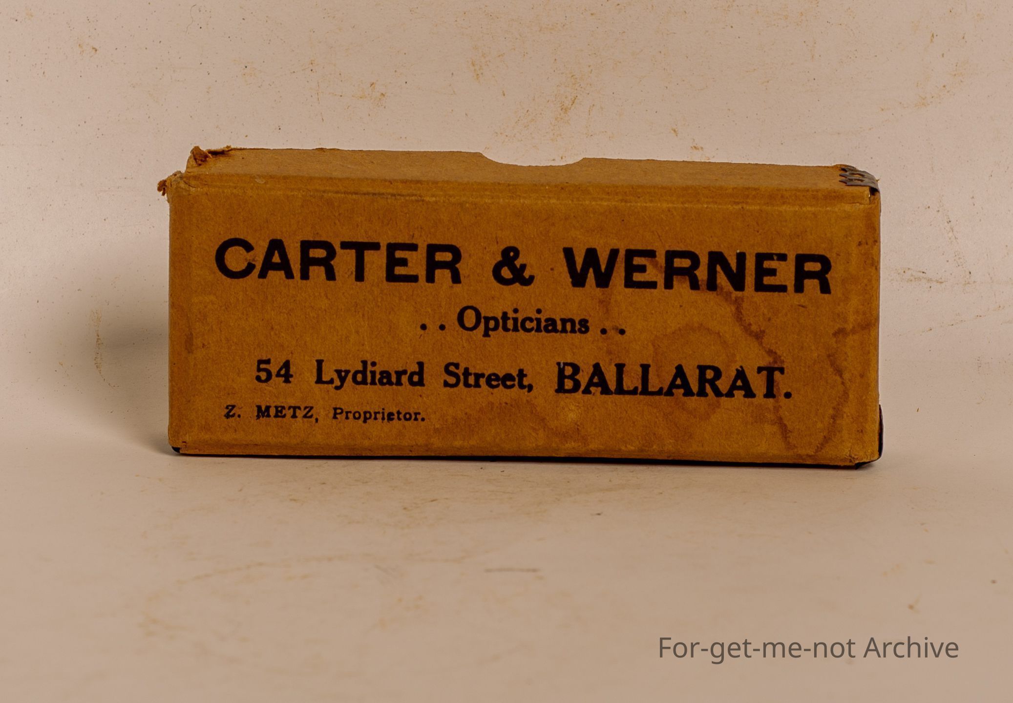Cardboard box from Optician Ballarat, Carter and Werner, 54 Lydiard Street, proprietor Z Metz