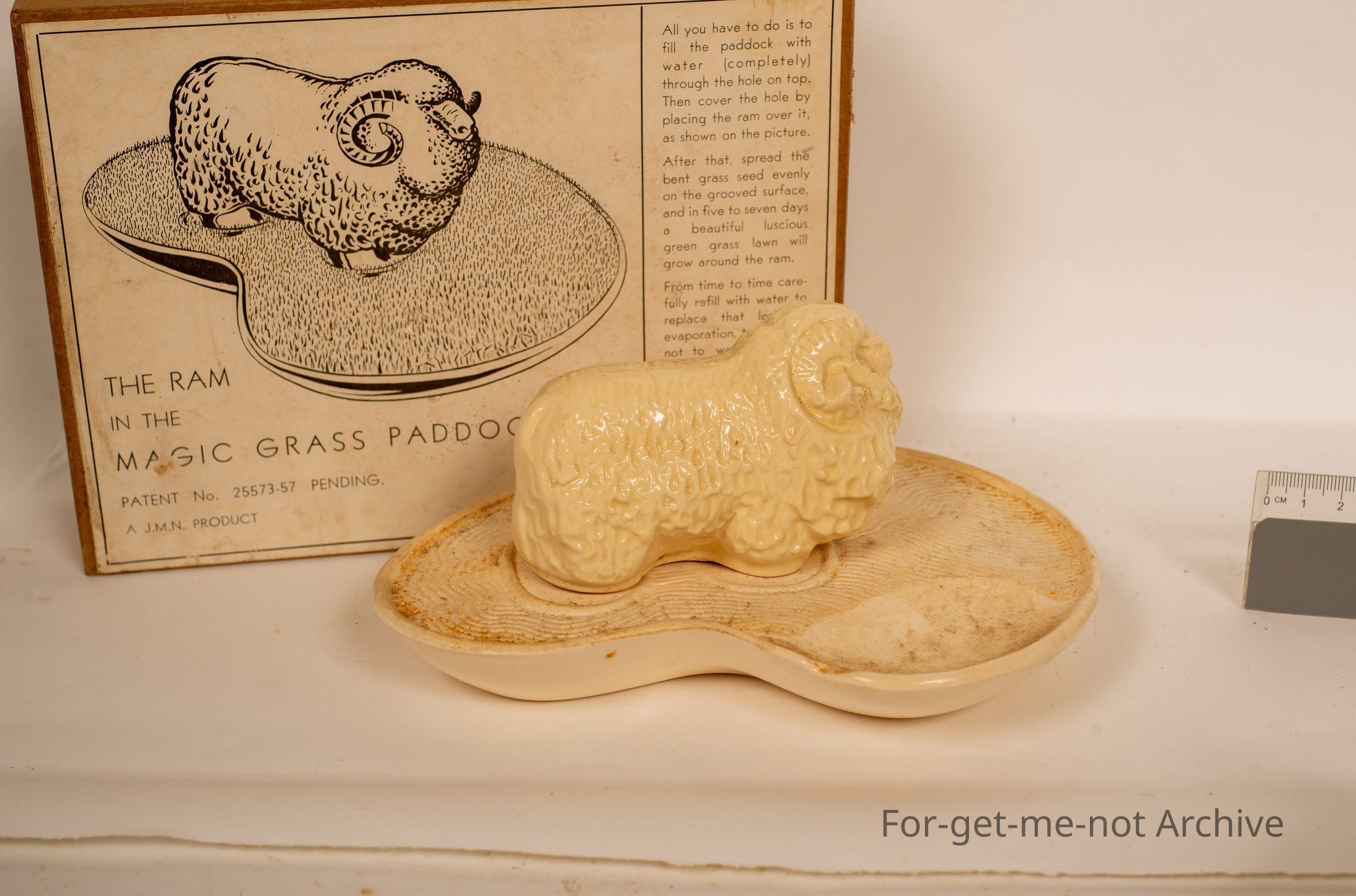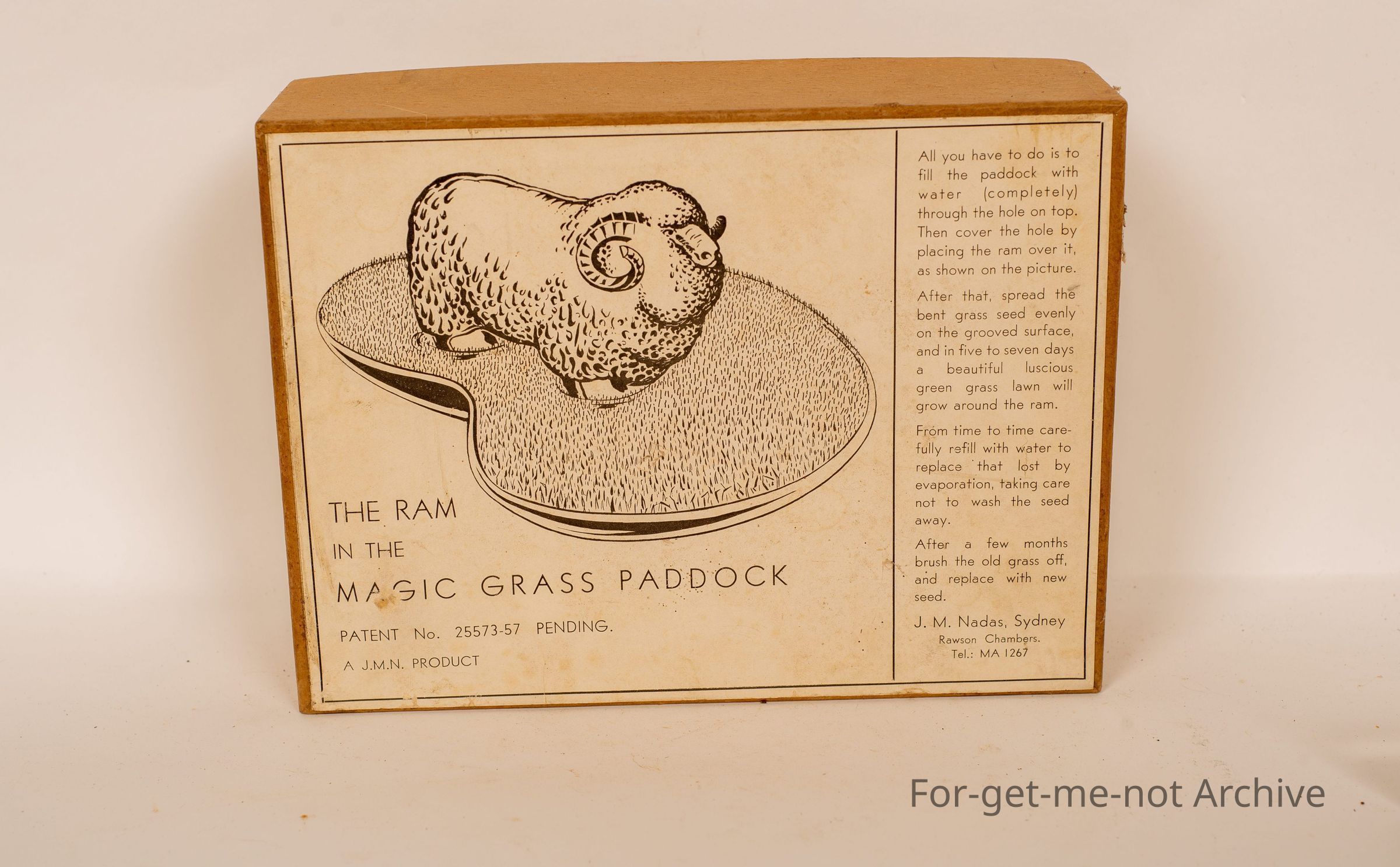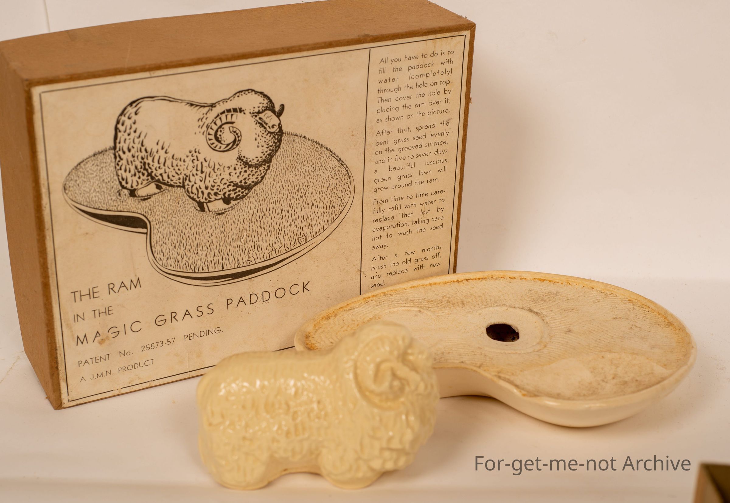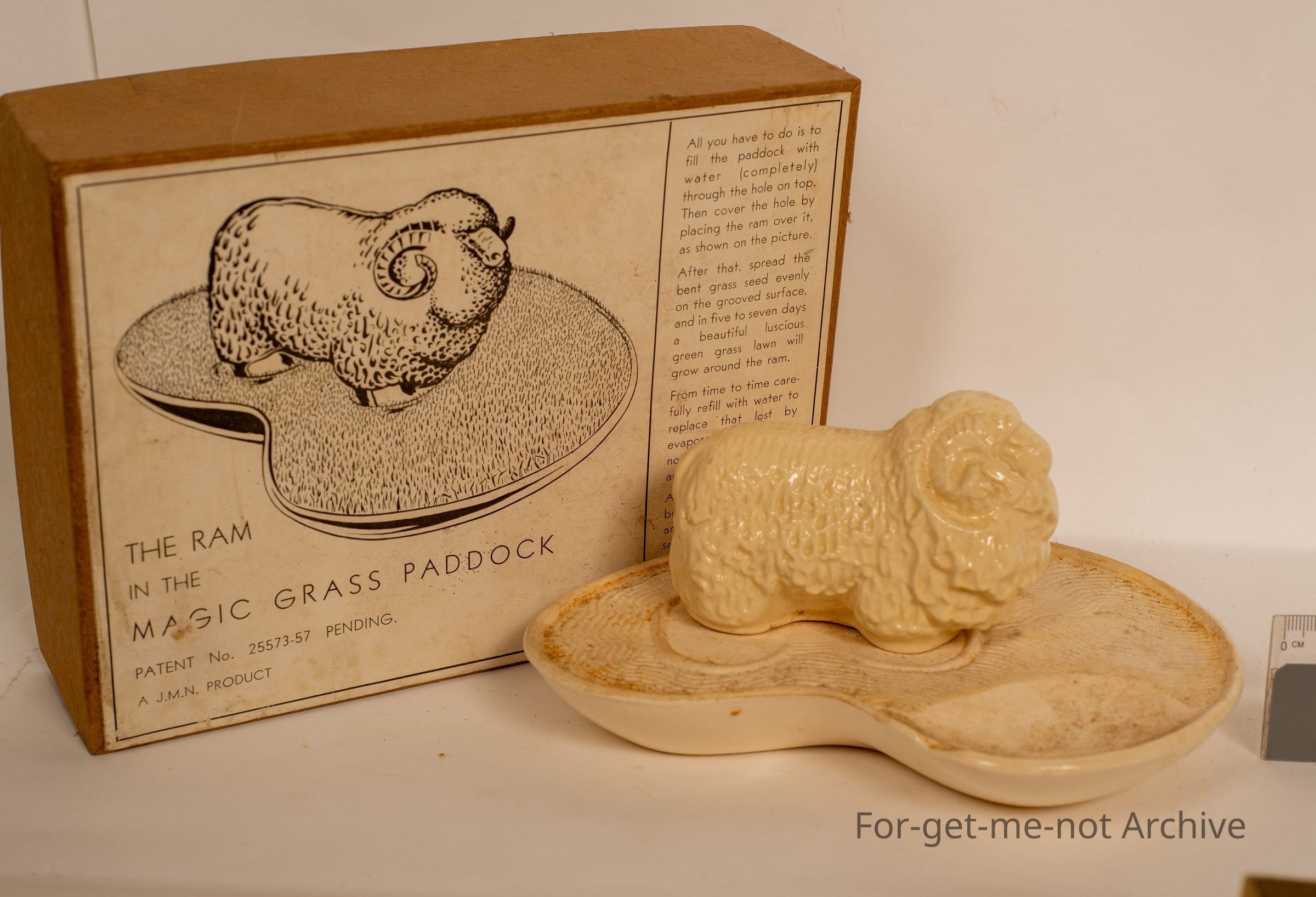 Cardboard box and contents of a kid's, magic grass paddock with a ram and grass seed to put in the grooves in the paddock so that it comes up green. A rare toy
