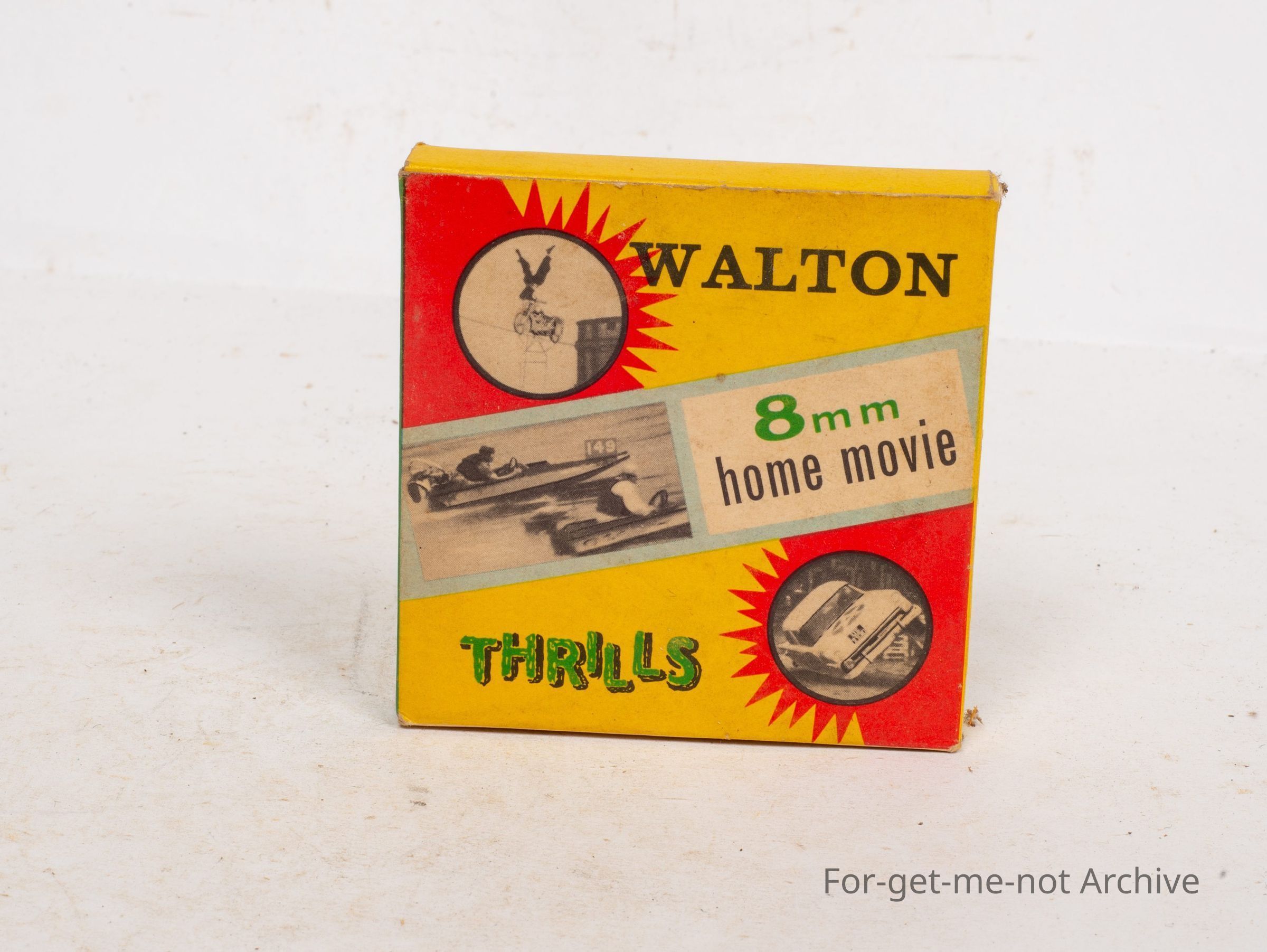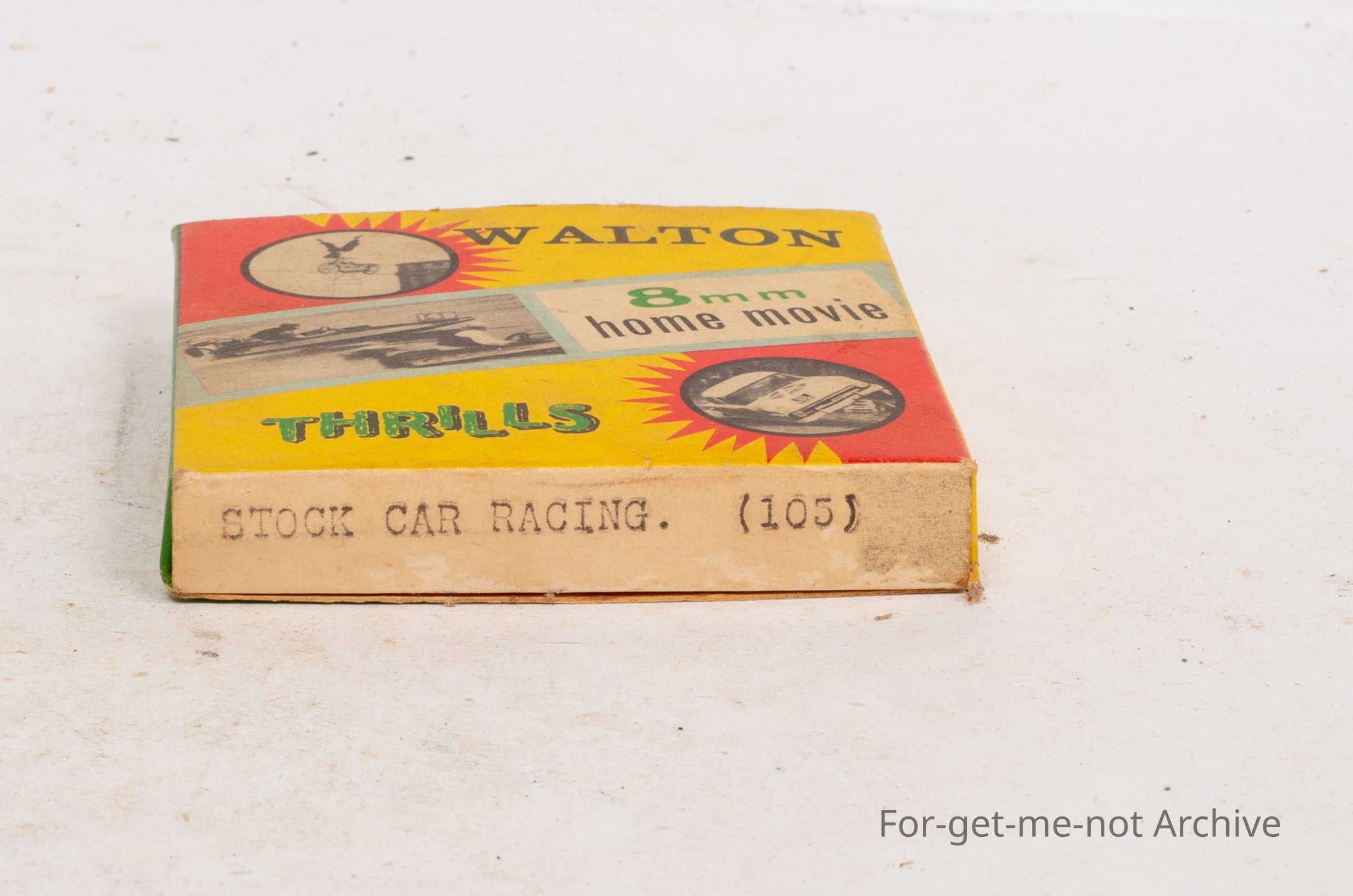 Is a little cardboard container of Walton 8 mm Home Movie thrills, pictorial of car racing and speedboat racing. This one is stock car racing. Looks to be in very good, condition with the details of how to use it in black and white or colourCollection