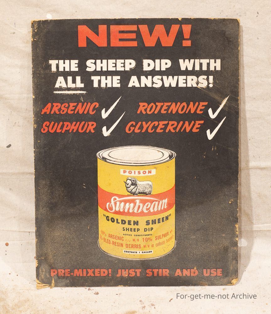 Cardboard sign advertising Sunbeam Gold Machine Sheep Dip. The new sheep dip with all the answers. Arsenic, Rotatone, Sulphur, Glycerine, Picture of a tin. Good order