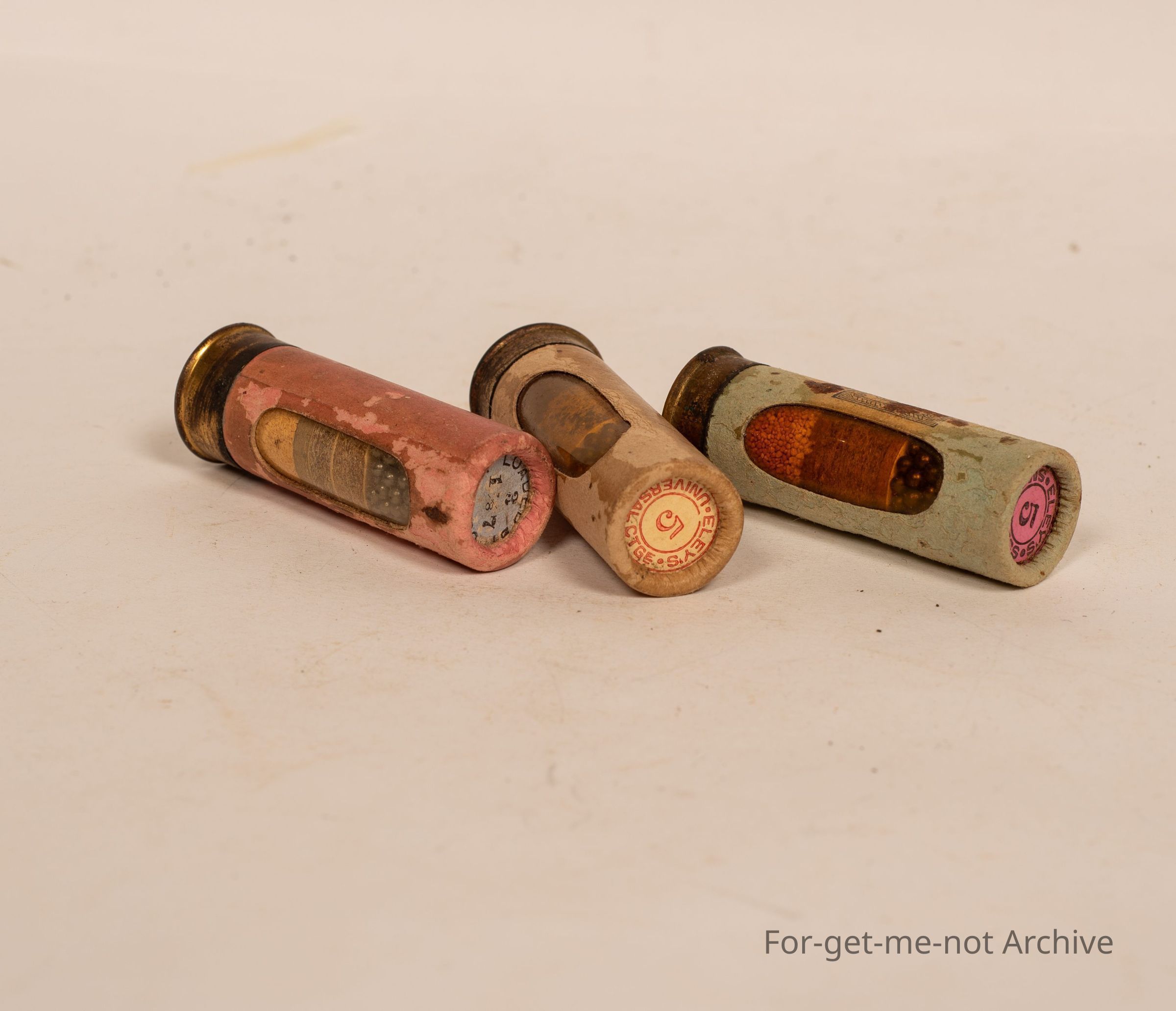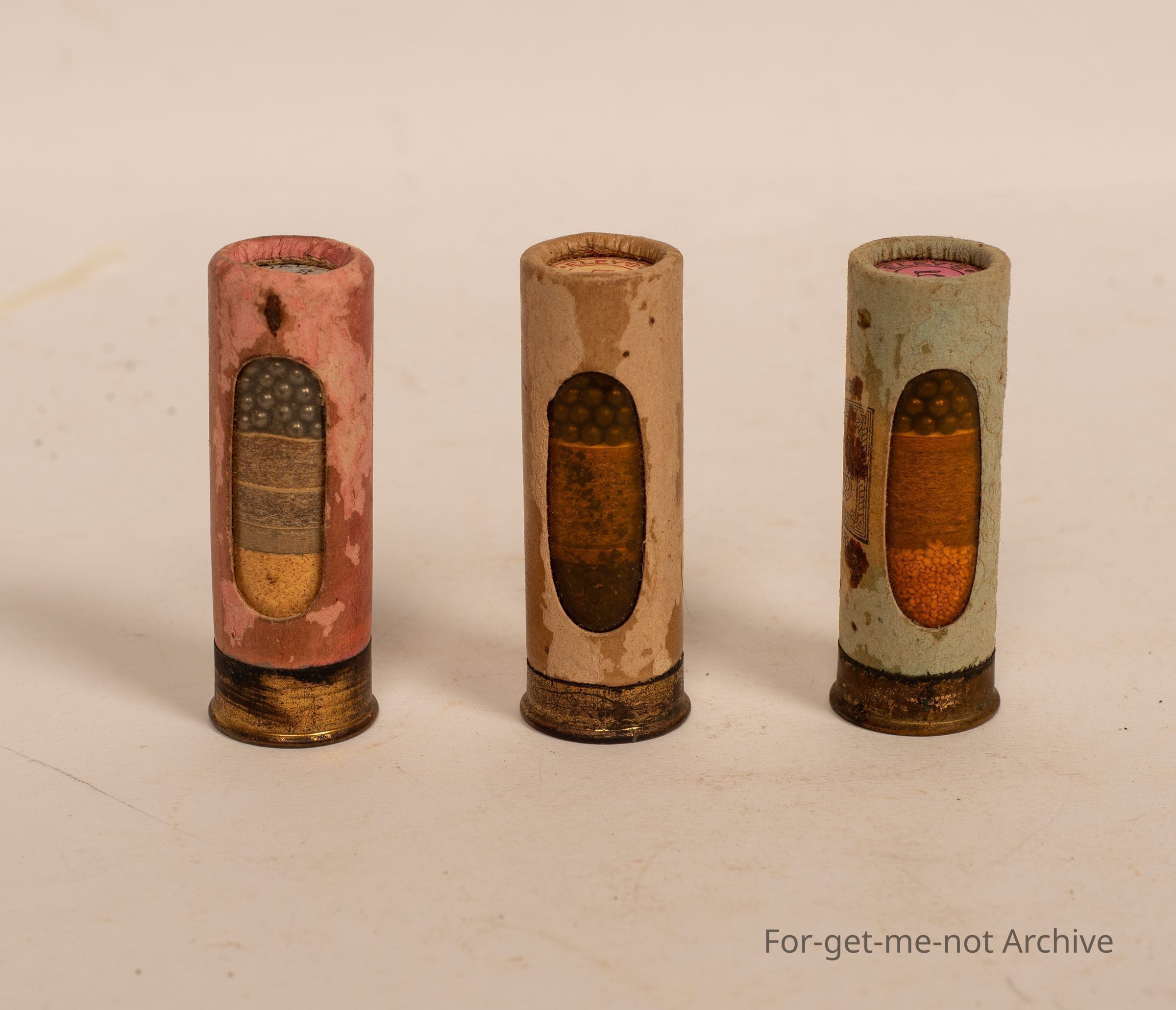 3 cartridges as samples with an exposed window in the cartridge to show the amount of shot, the wadding, and the amount of powder. These came from John Coors' sample Collection and donated to the collection.Collection