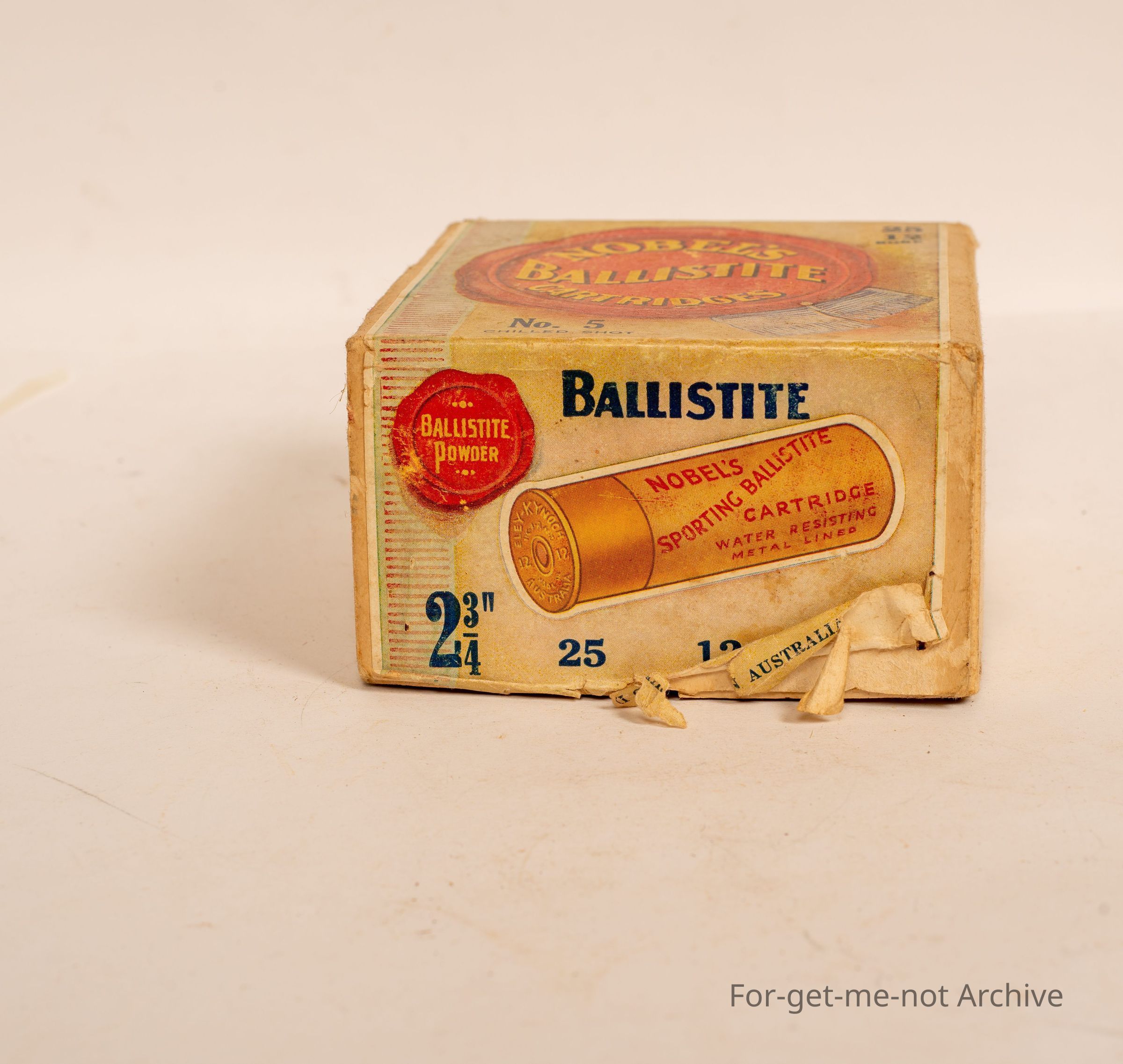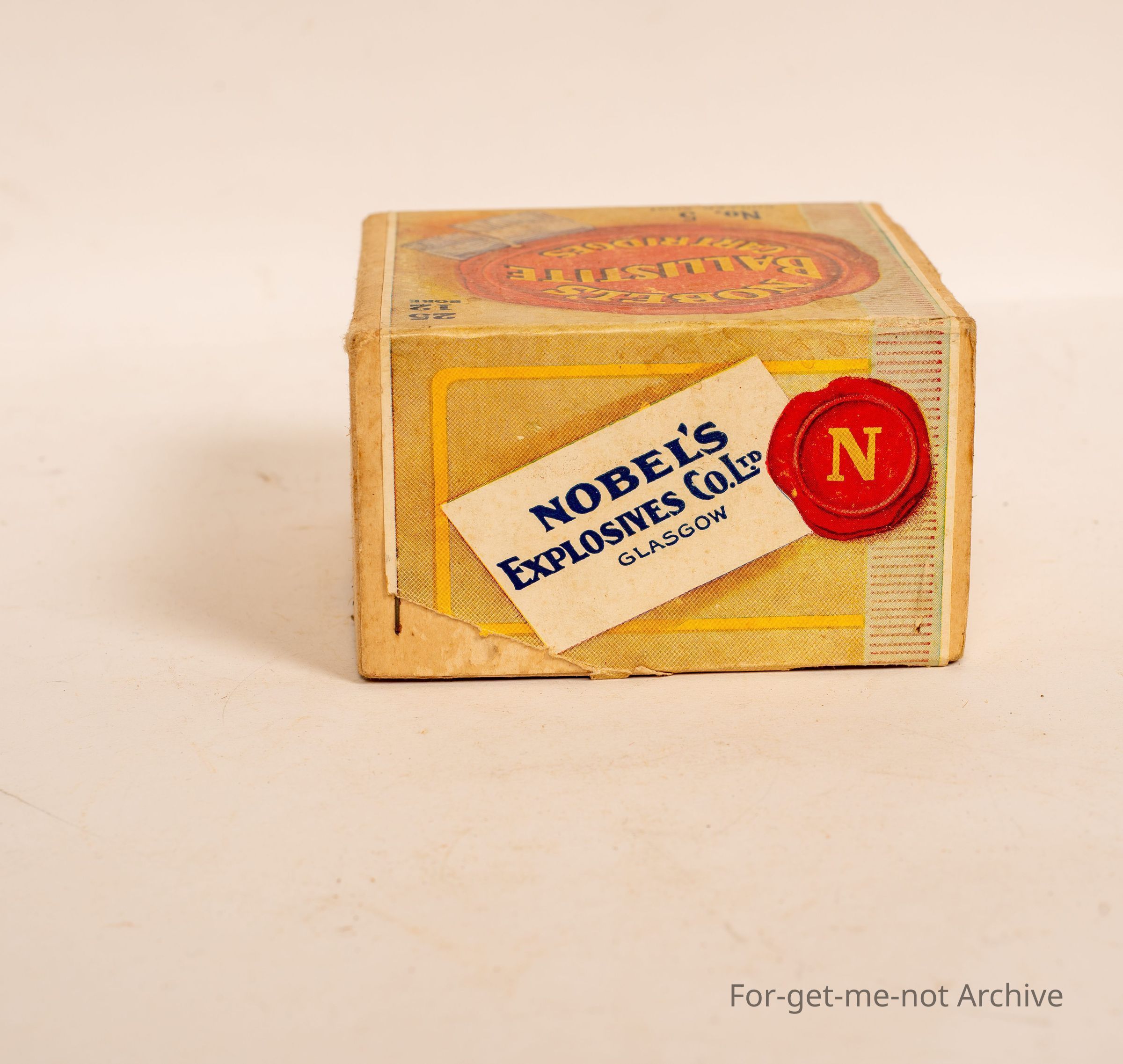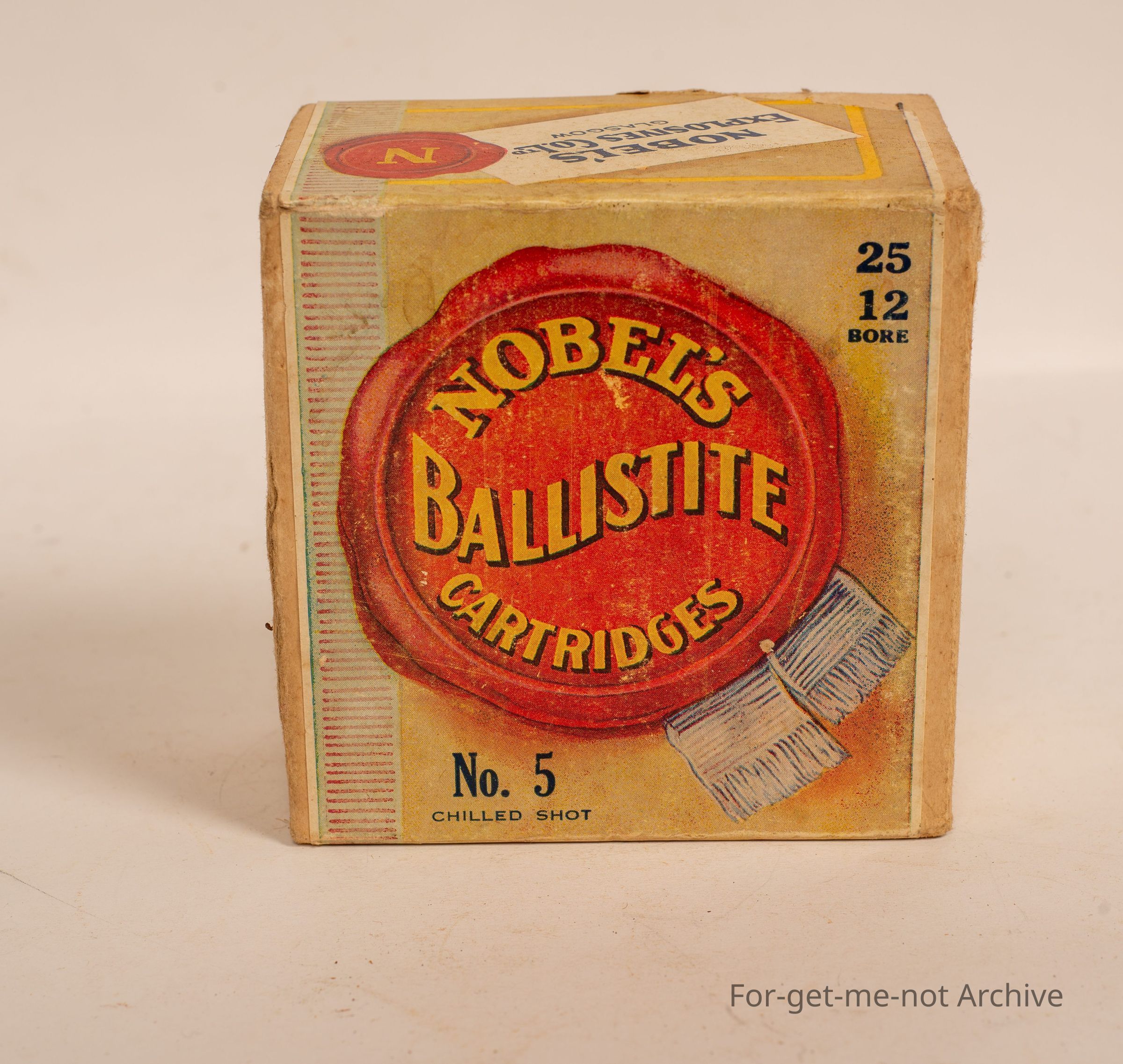 Cardboard, 12 gauge cartridge box called Nobles Ballistite Cartridges.