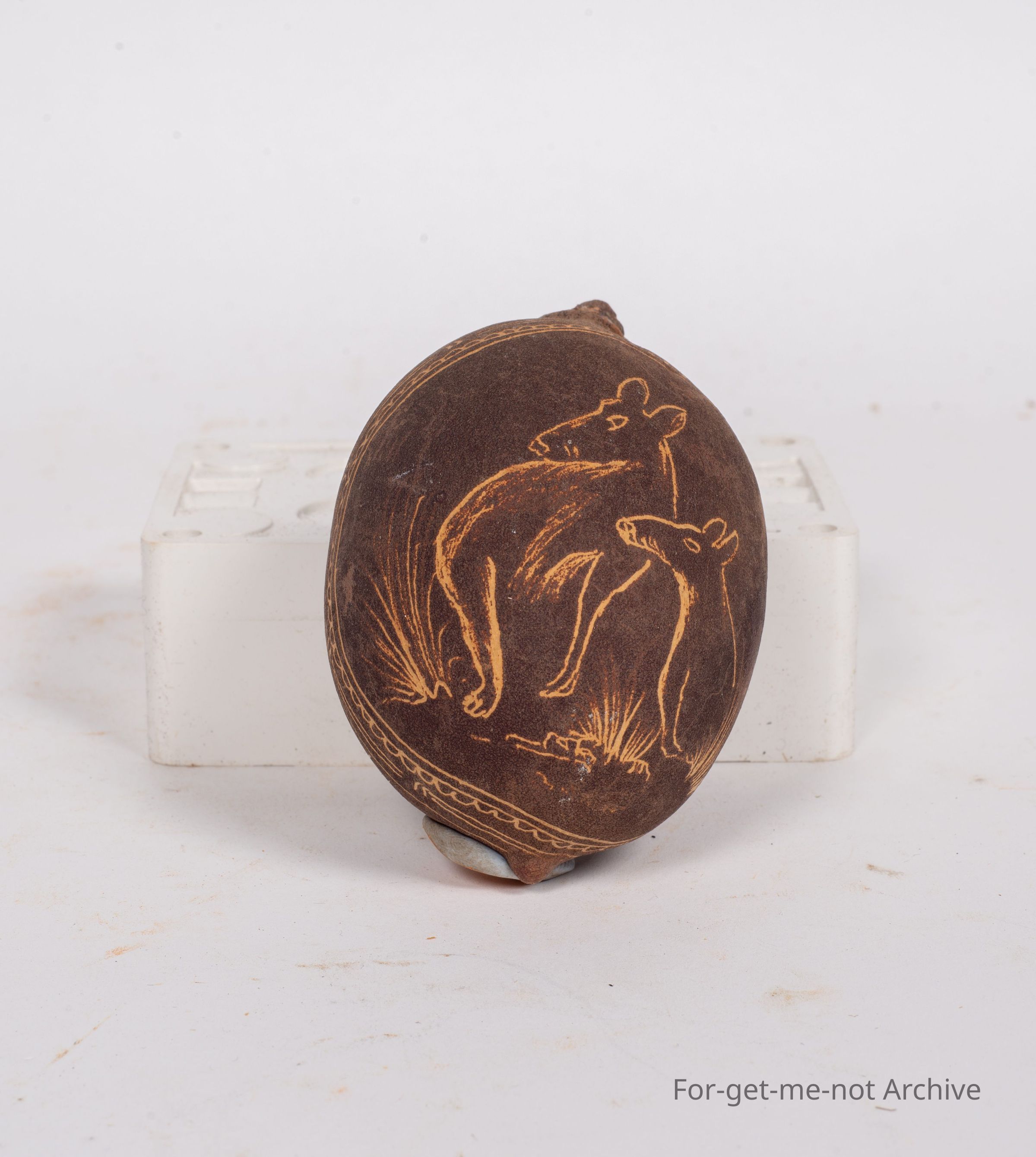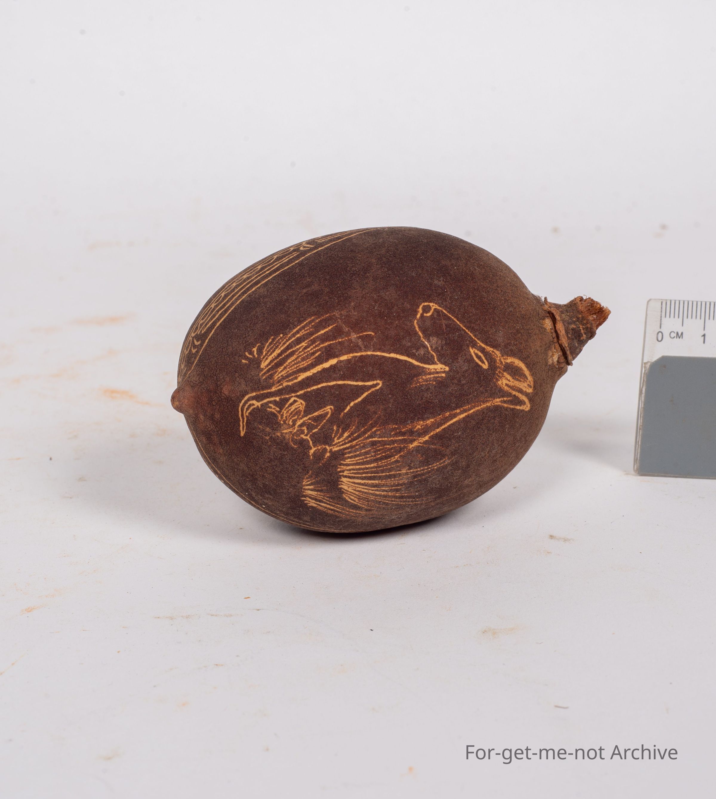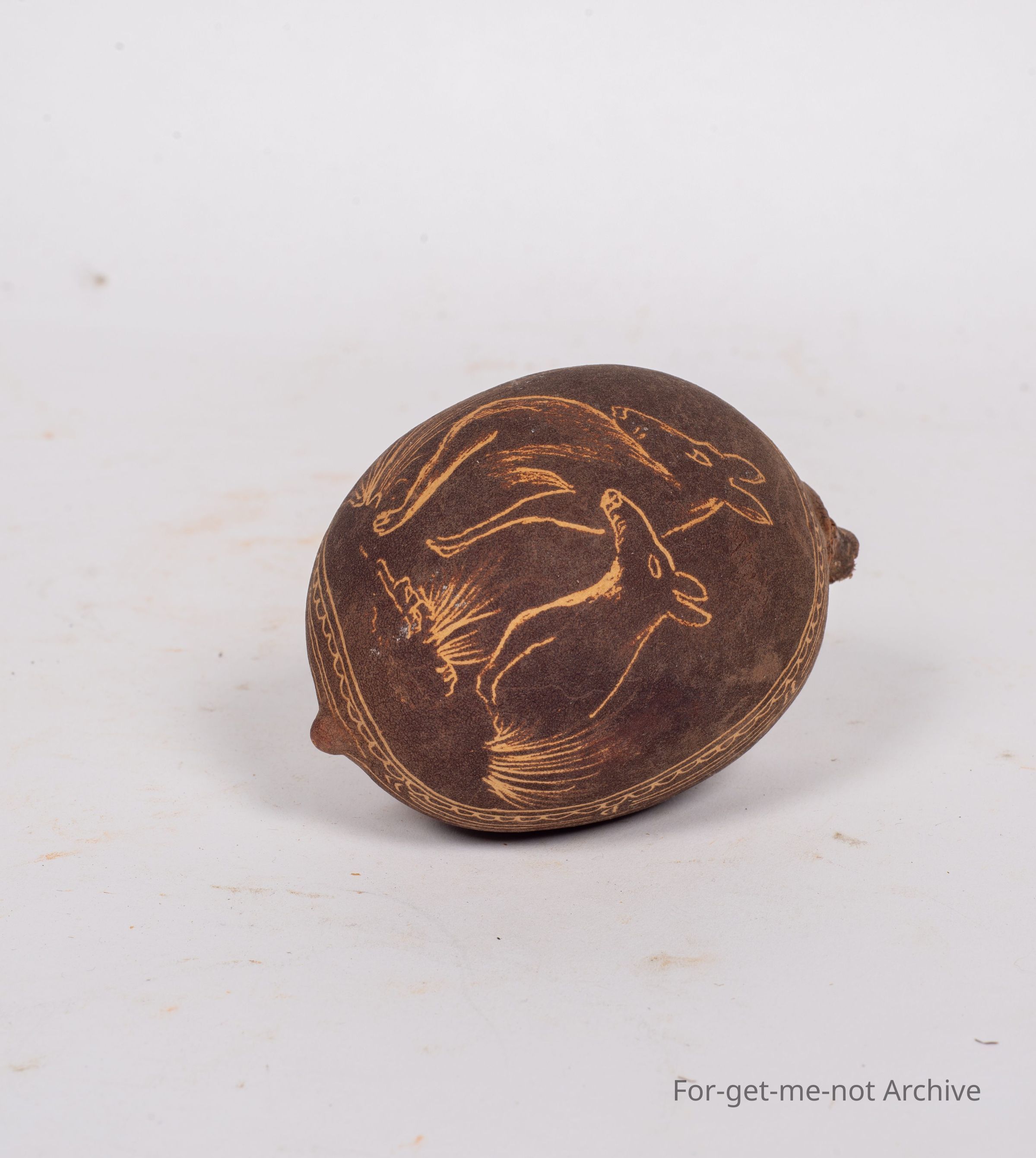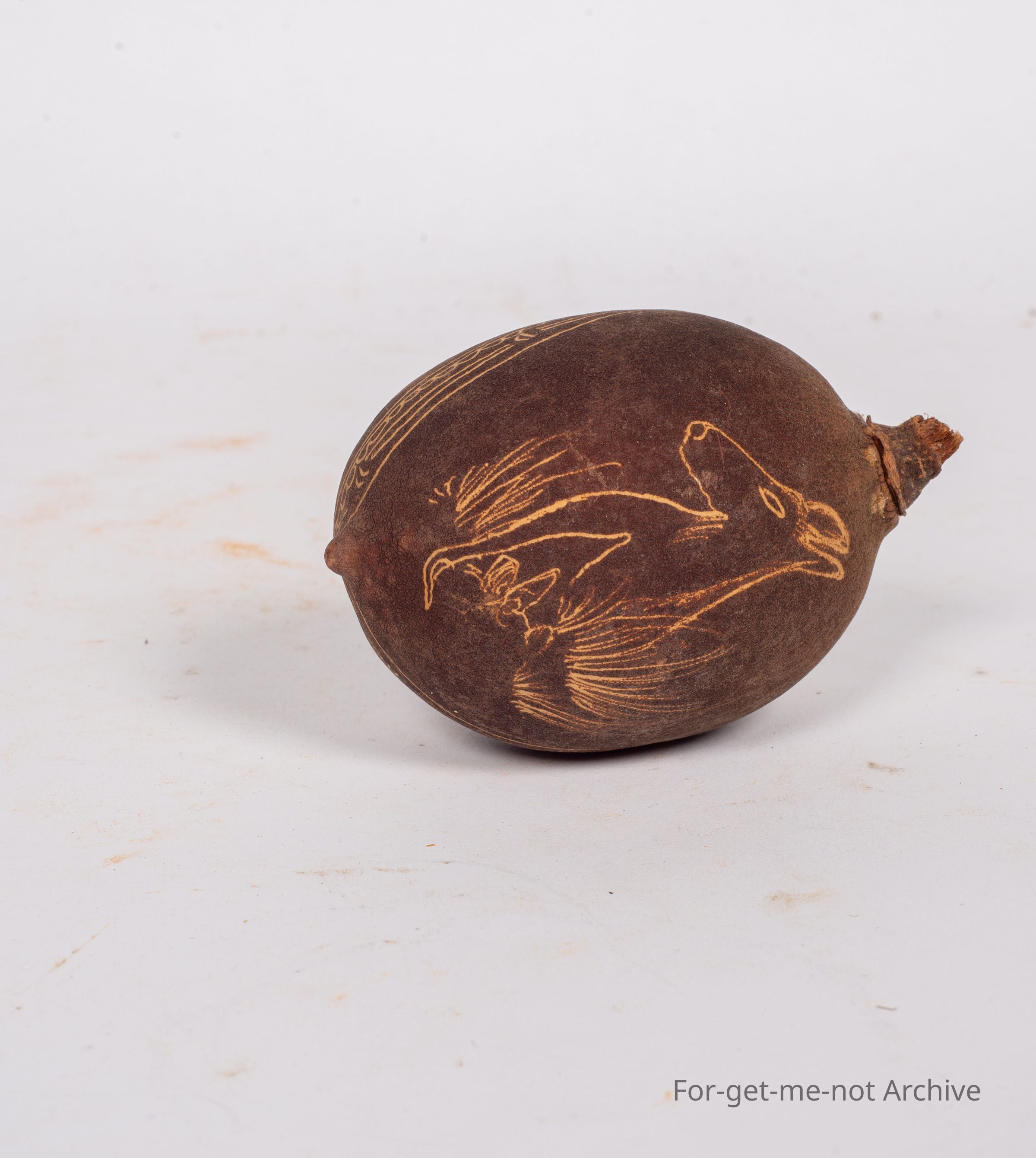 Is another BOAB nut, only a small one. This has been carved with pictorials of kangaroos and grass.