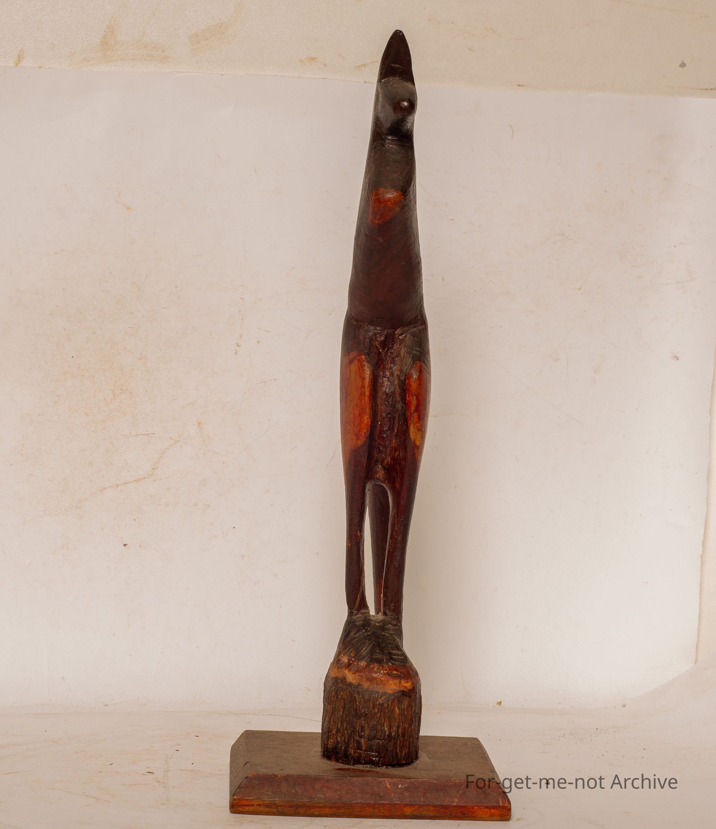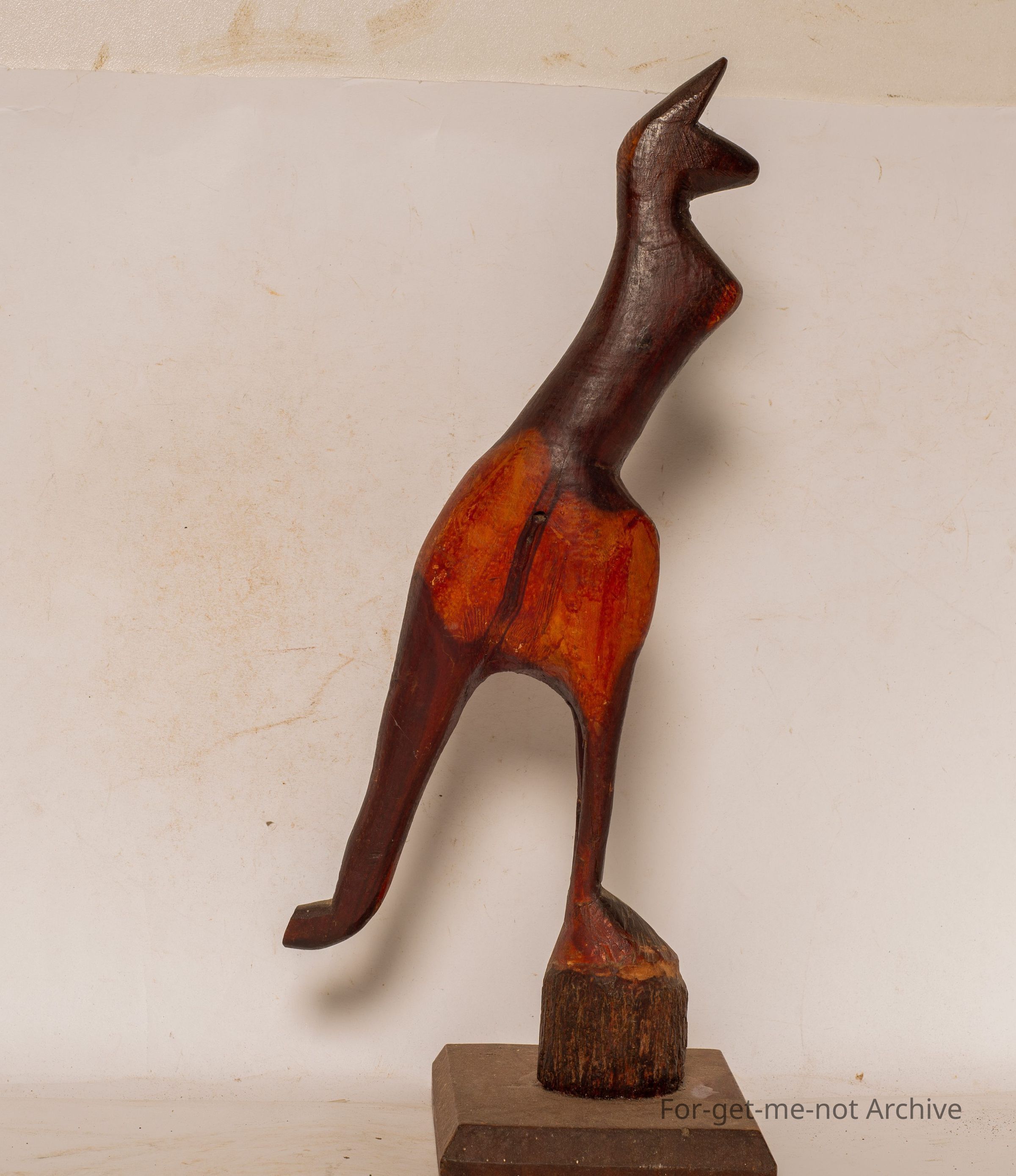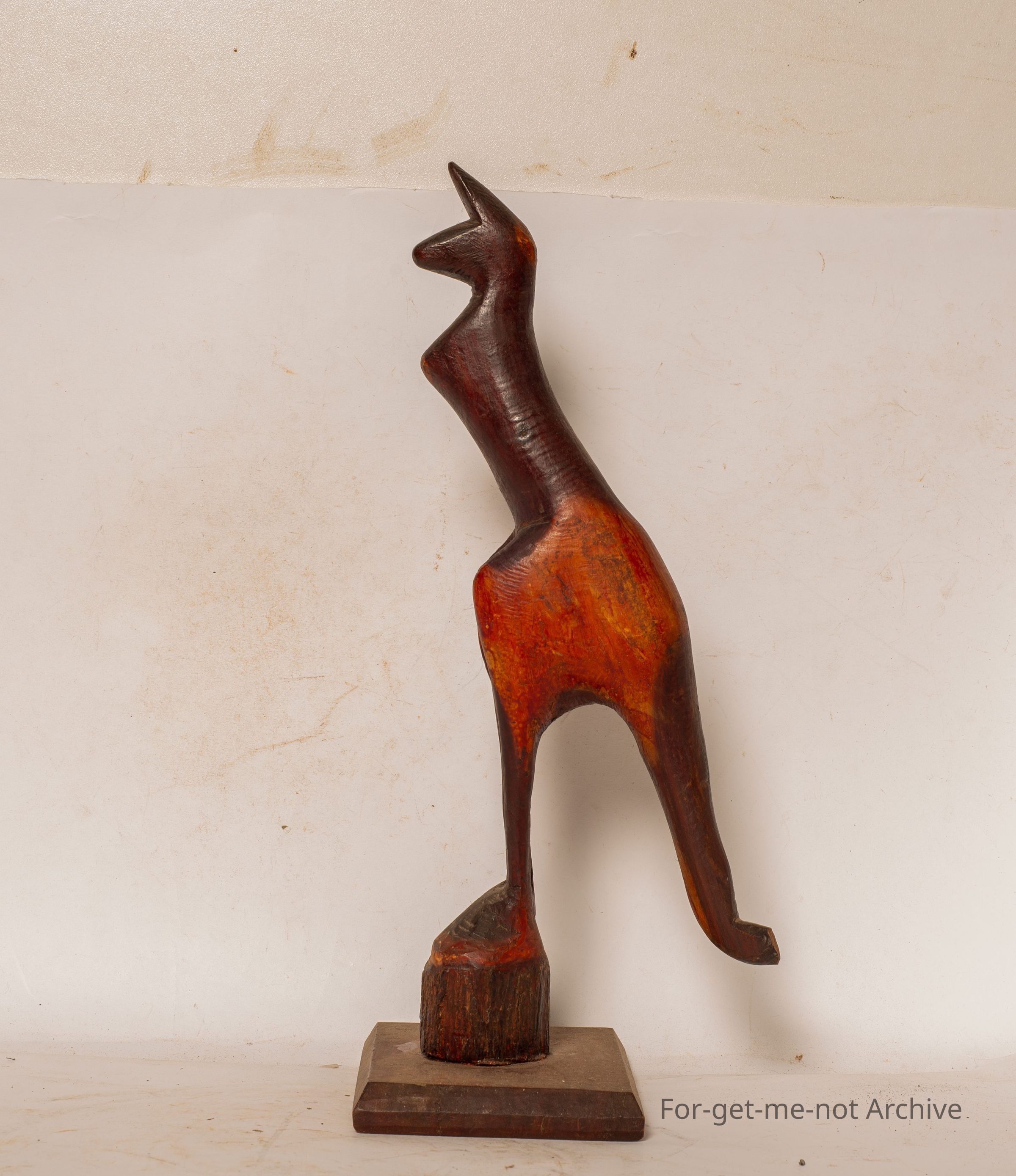A kangaroo carved from Mulga or Acacia by Aboriginal. this is a lovely bit of primitive hand carving, with both shades, the dark and white showing from the marble wood standing on a wooden stand. This was done for tourists back in the fifties.Collection