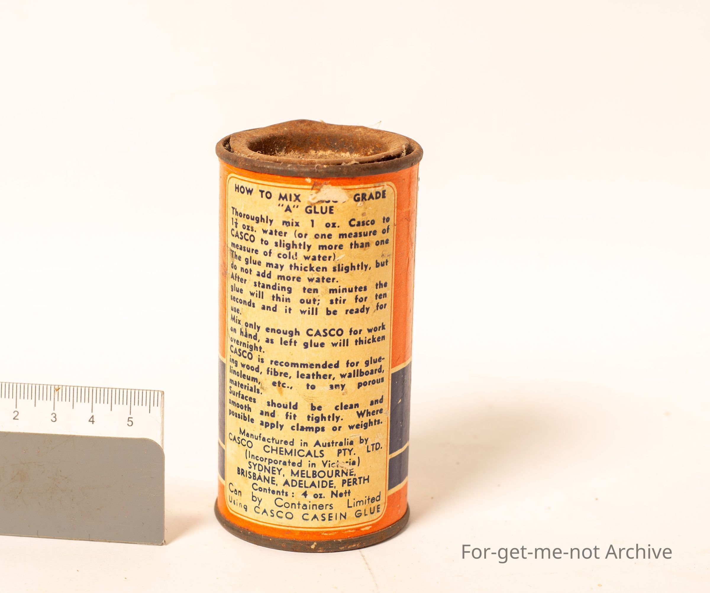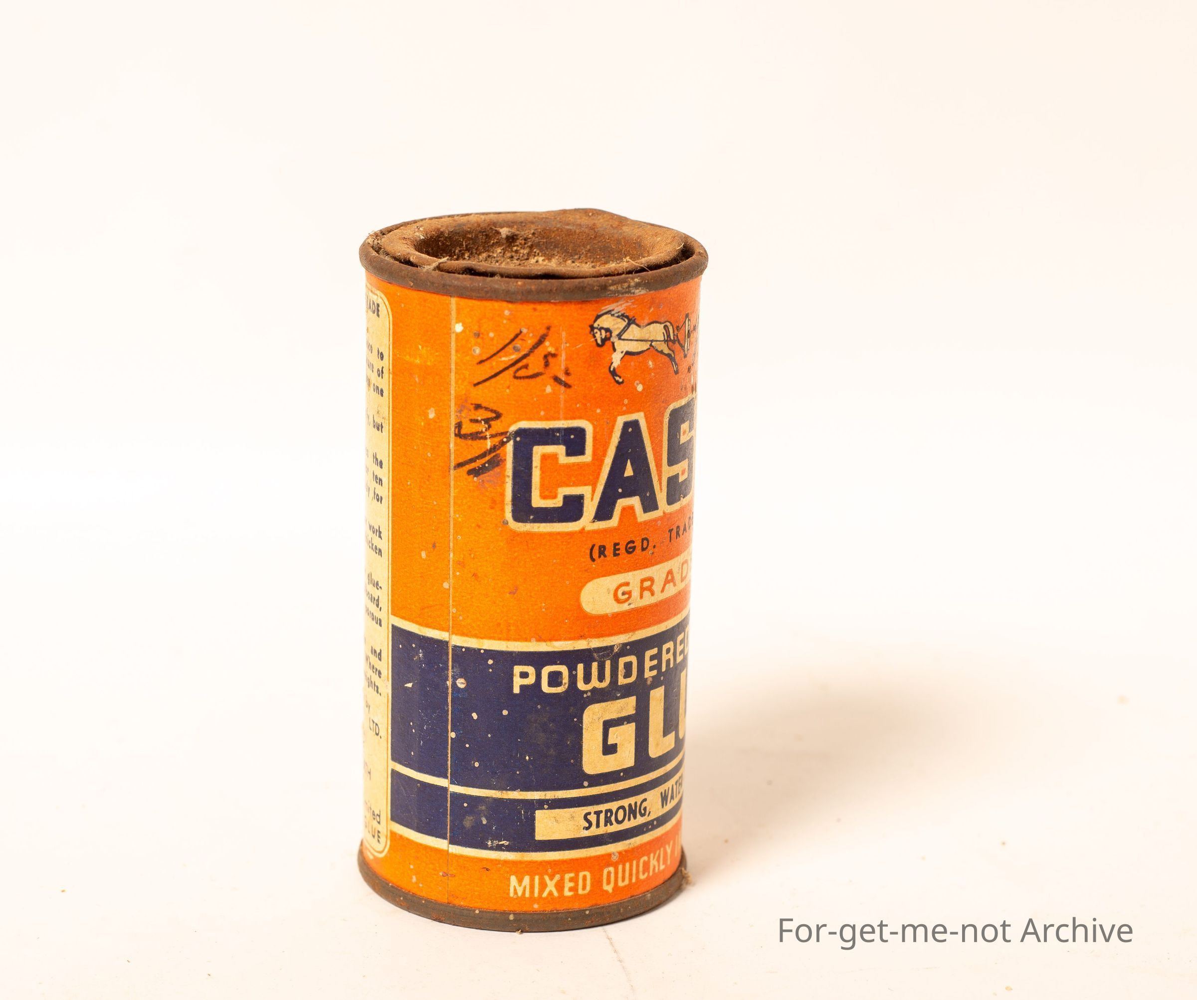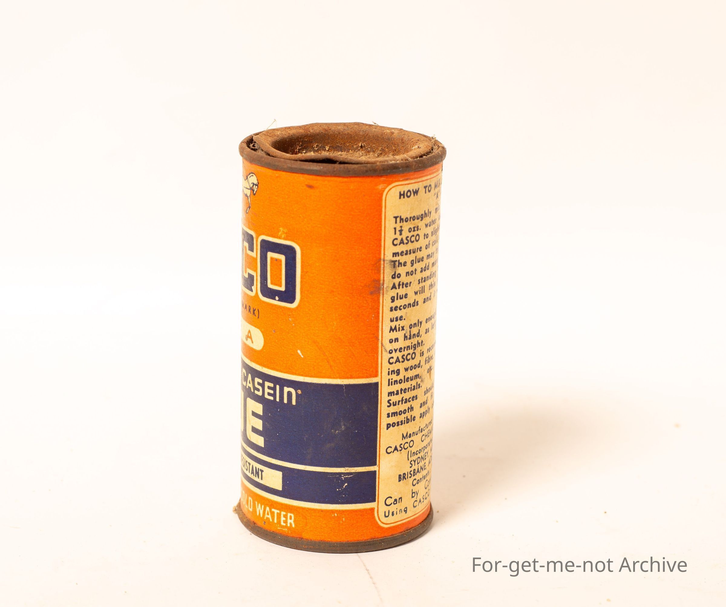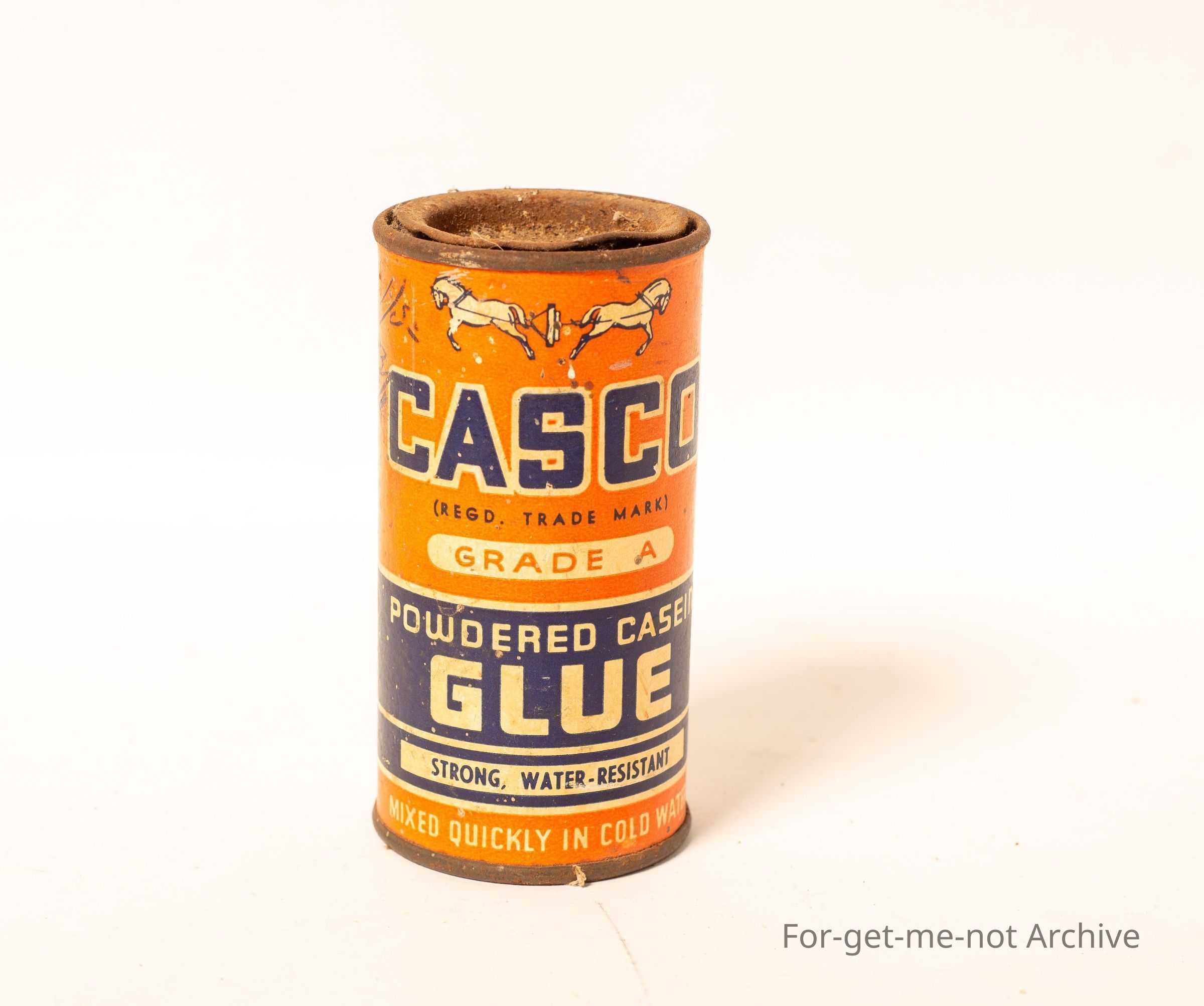 A tin of Casco powder casein glue, strong water resistance. This is for putting the abrasive papers on the discs for grinding combs and cutters in the shearing industry.