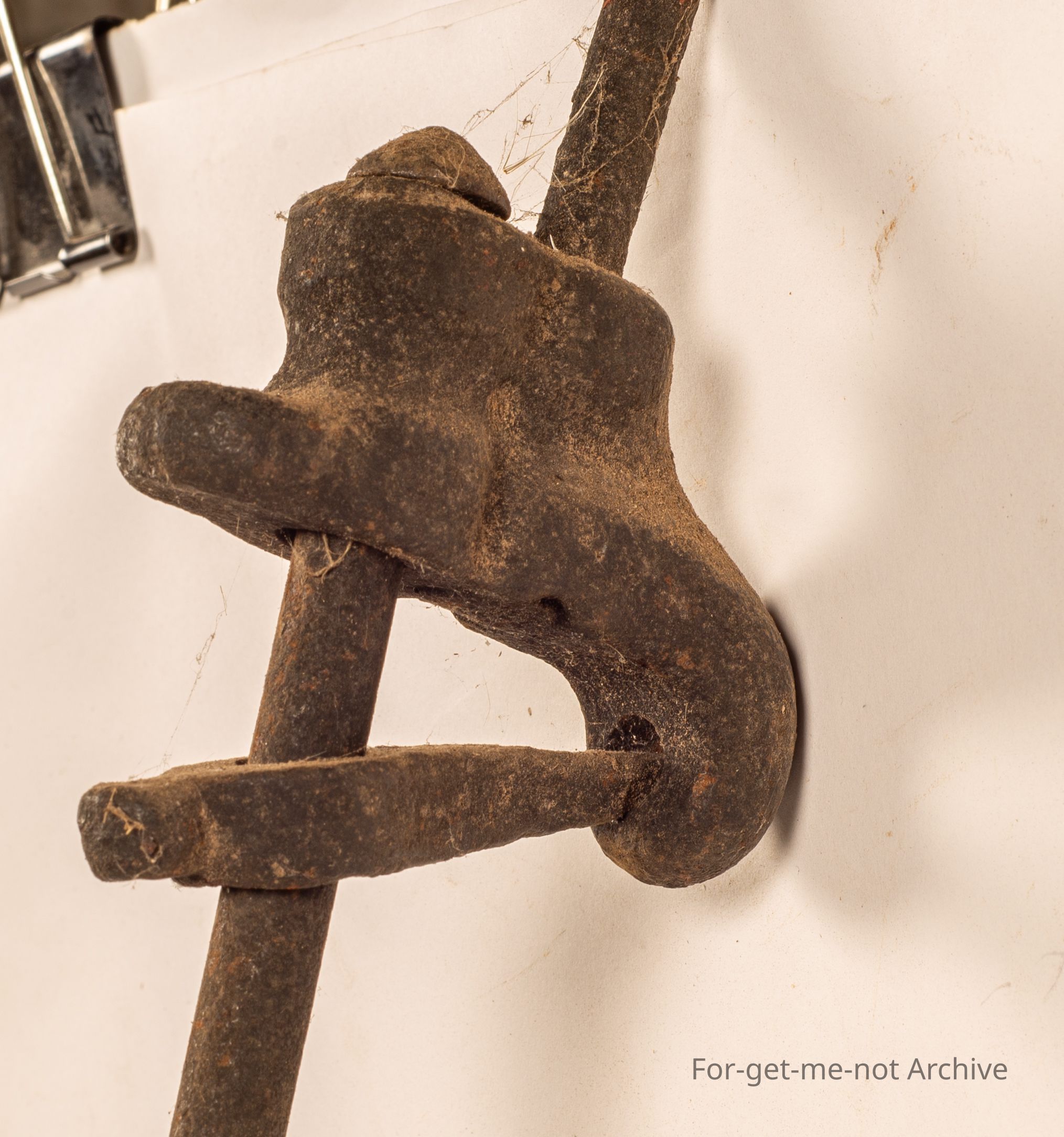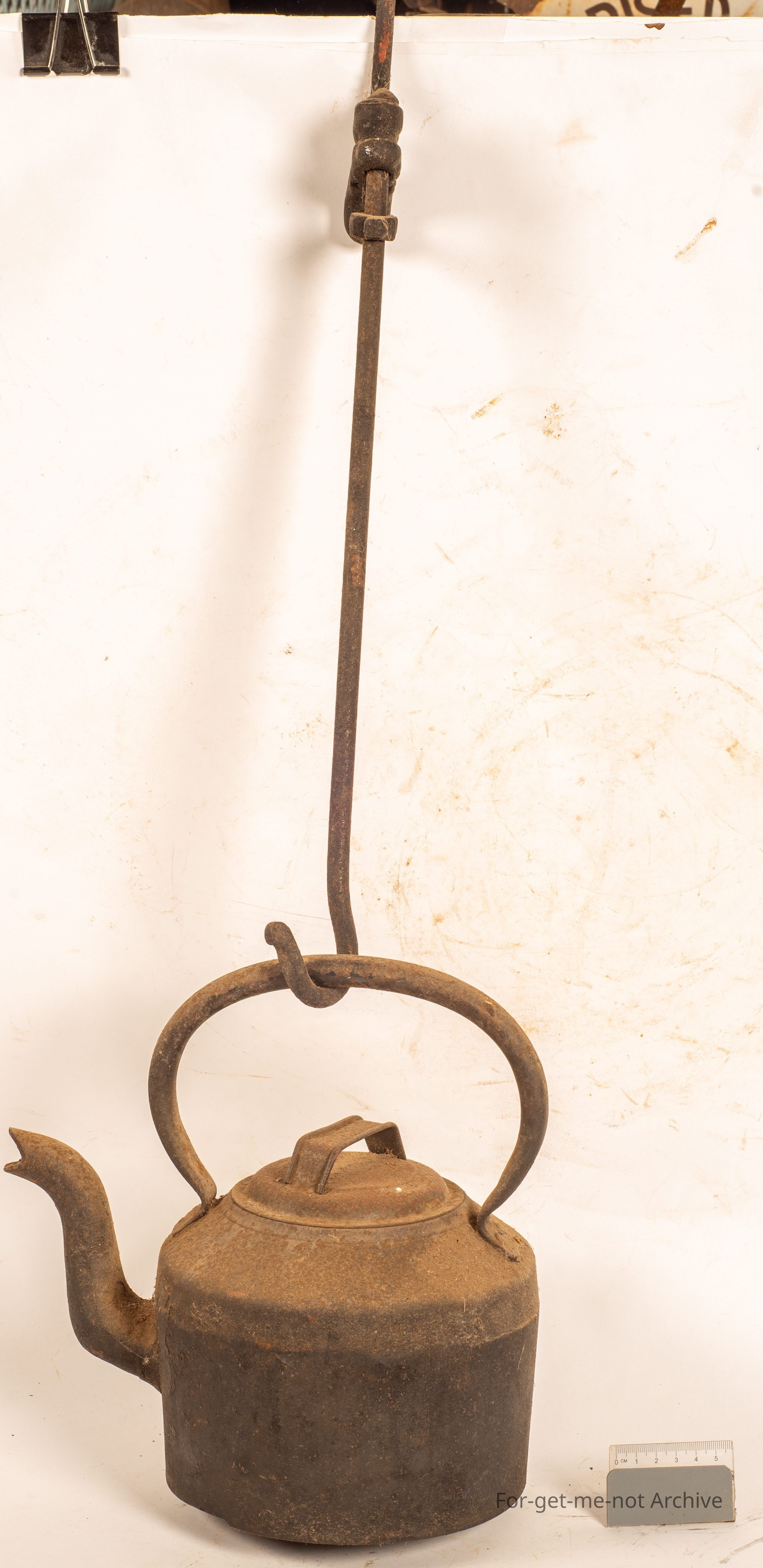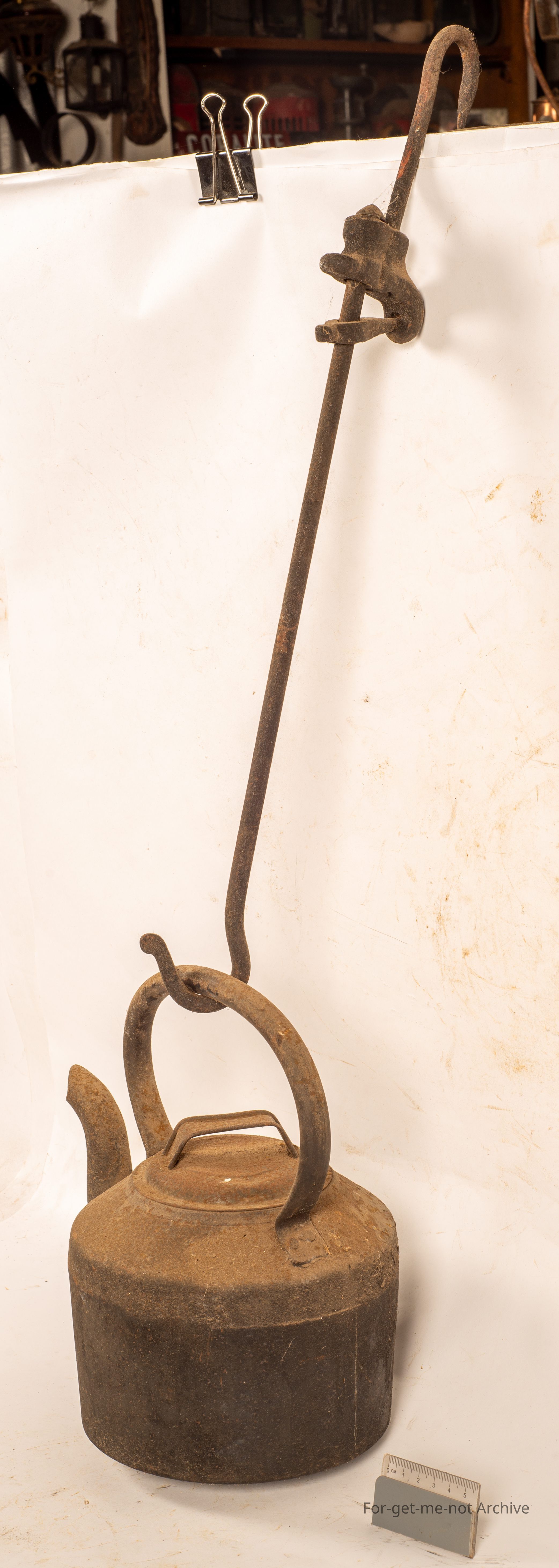 This is a cast iron Clark kettle hanging on a beautifully designed trammel. The locker mechanism is different to most others. Value kettle and trammel.