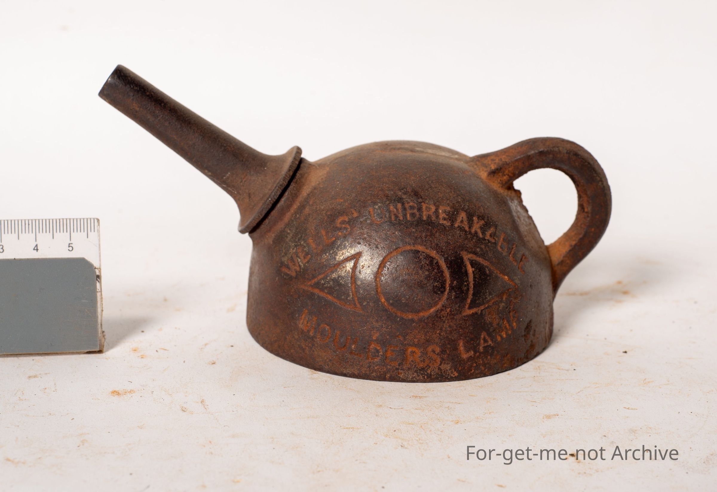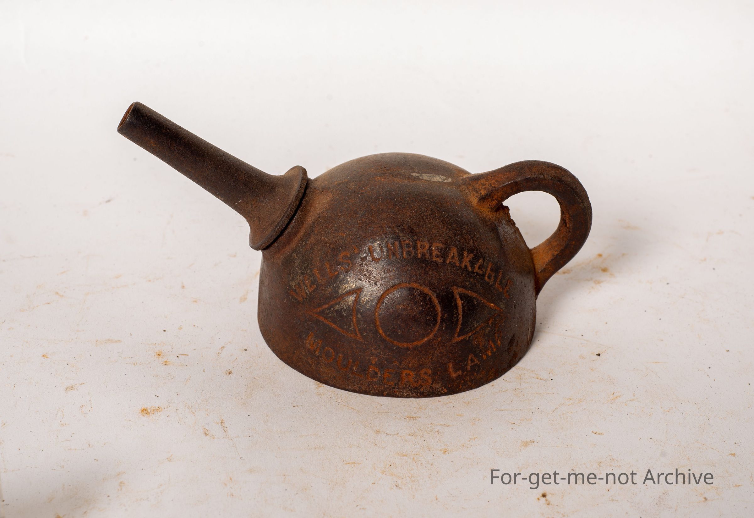 This is a cast iron lamp, stamped Wells, unbreakable, molders lamp, number 20. Beautiful little thing. Original spout, handle, no breakage.