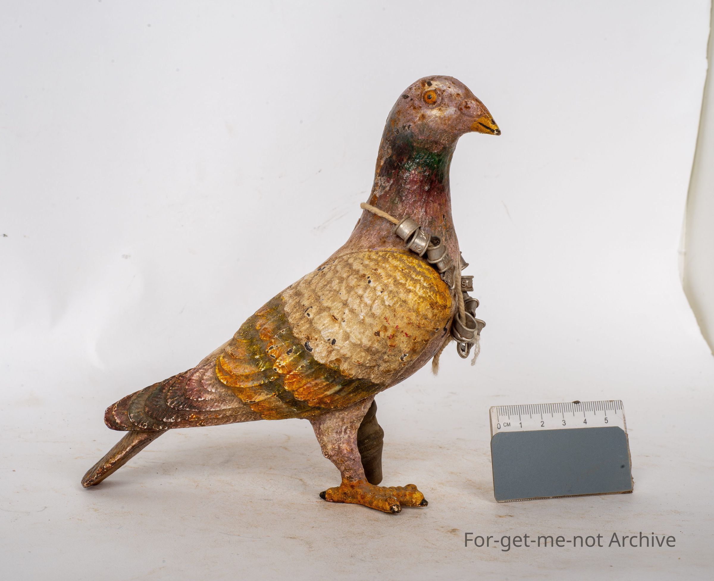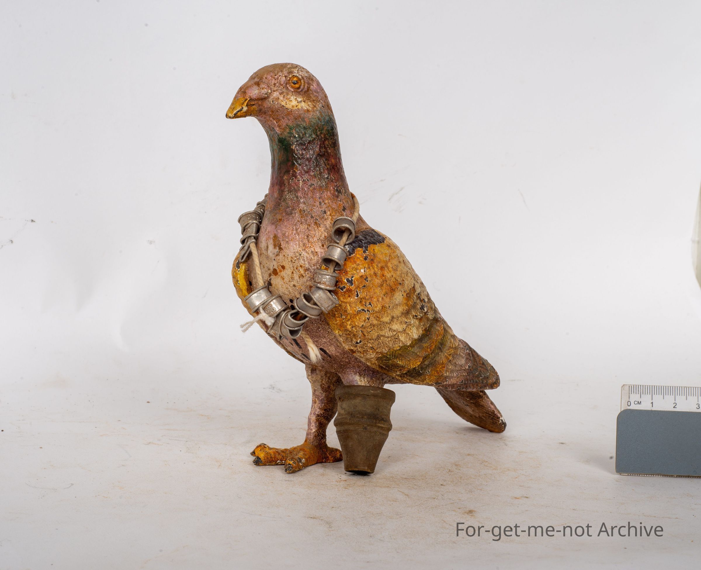 This is a cast iron pigeon. Beautifully, decorated and hand painted. Minus 1 foot. Has a prosthetic leg and a ring of old pigeon racing rings around its neck.