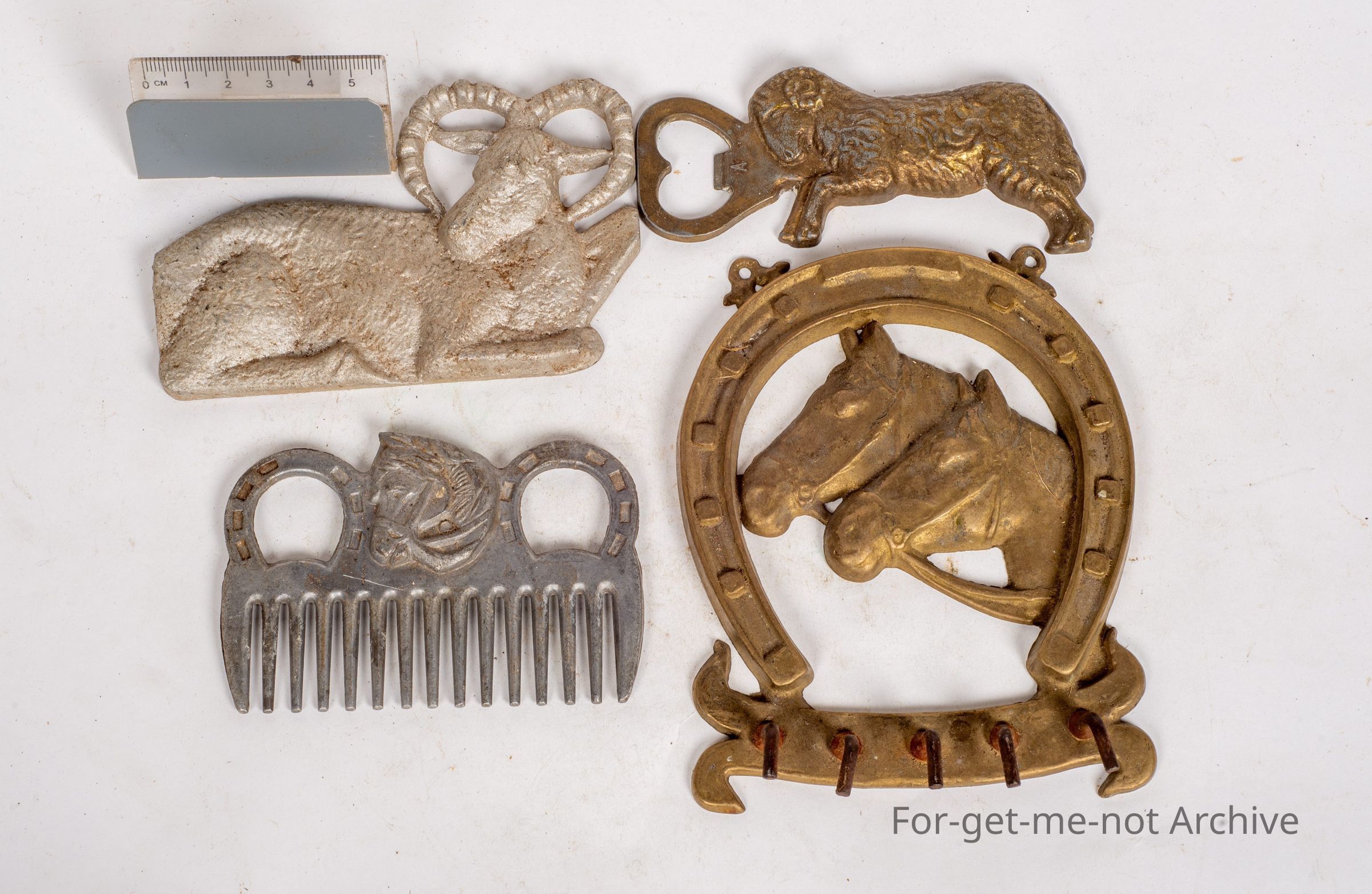 These are little, cast pieces, featuring animals. The first one is an aluminium goat or sheep sitting down. Pretty nondescript. Next one is a crown seal opener with a wild looking sheep as the handle. Then there's a little hanging piece, a couple of horses and a horseshoe, and the next one is a main comb with the image of a horse.Collection