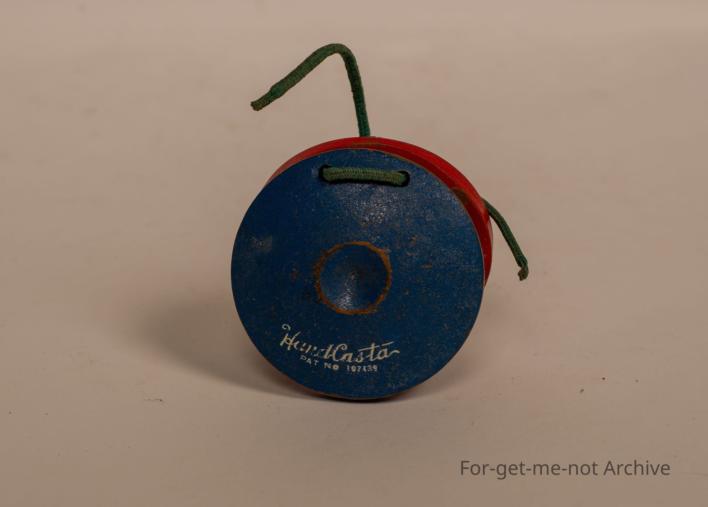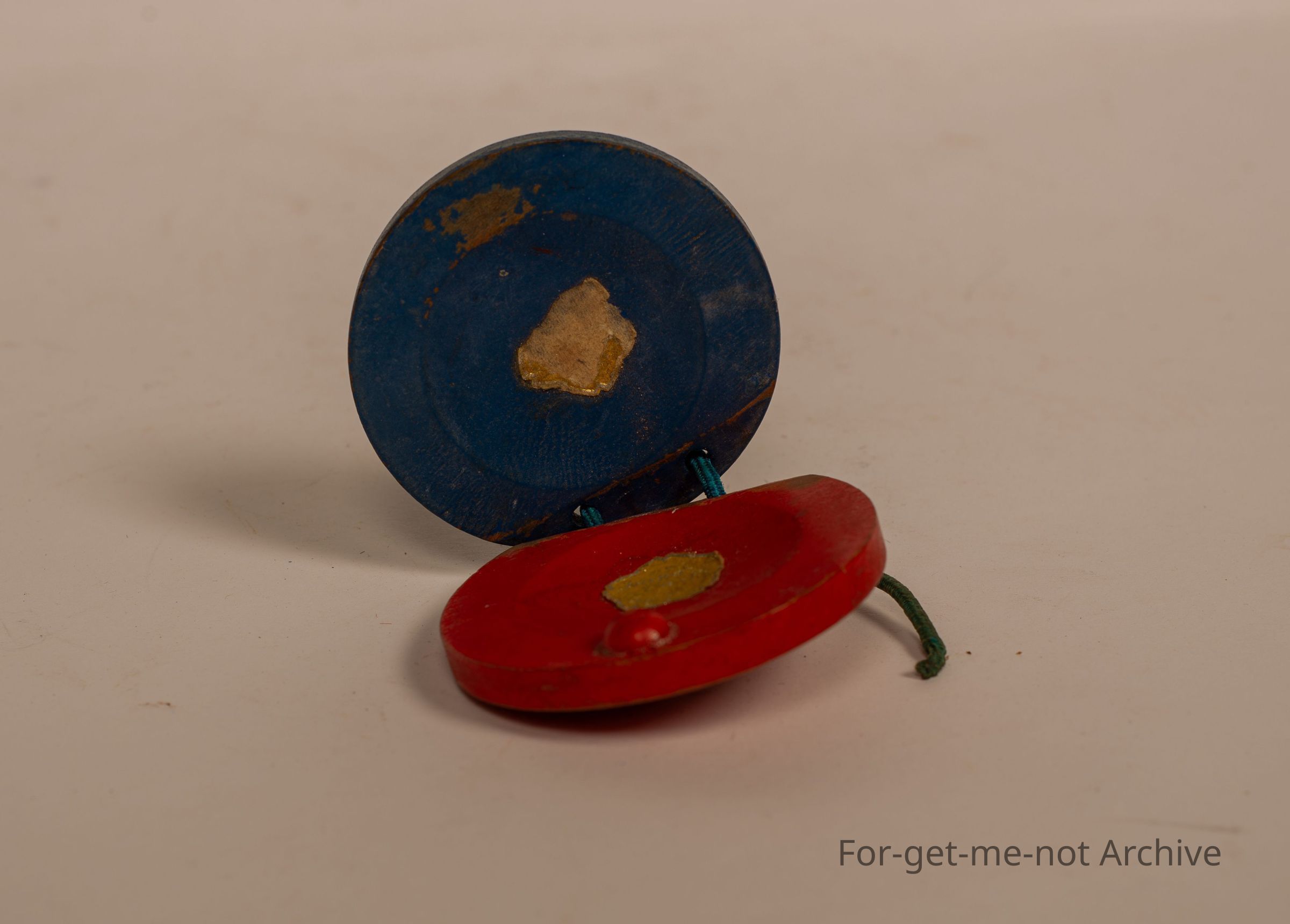 These are castanets. A pair of wooden castanets tied together with a cord. Red one, blue one.