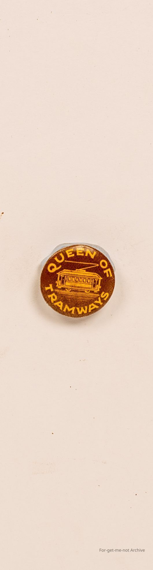 Celluloid badge. Queen of Tramways with image of early tram in the centre. Quite a rare badge.