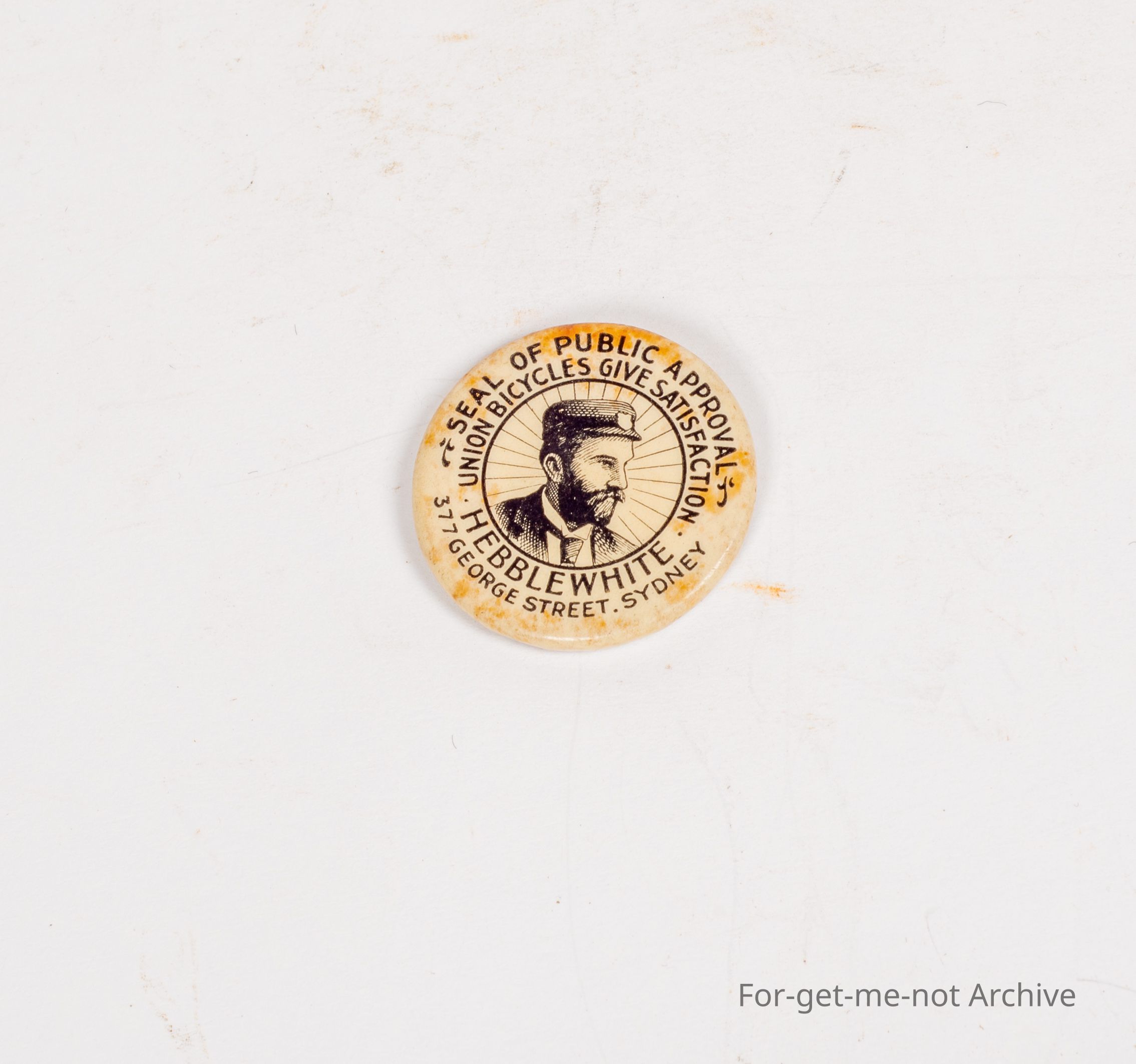 Seal of public approval. Union Bicycles give satisfaction. Recommended by Herbal White, Hebel White, George Street, Sydney. Hebel White was a famous early competitive bicycle rider. His is a very early celluloid badge.Collection
