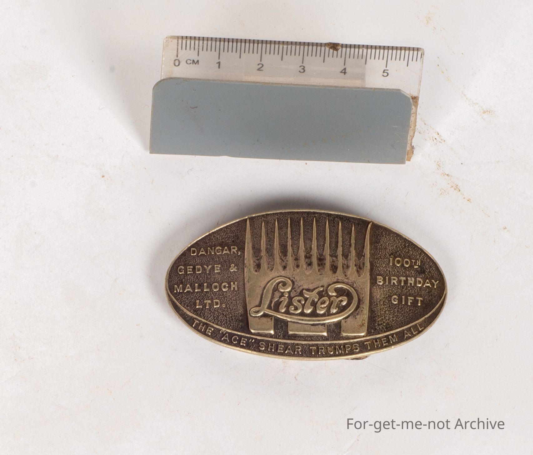 A belt buckle commemorating the centenary of Dangar Gedye and Malloch and Lister Shearing Gear, 100 Years birthday Gift " The Ace Trumps them all"
