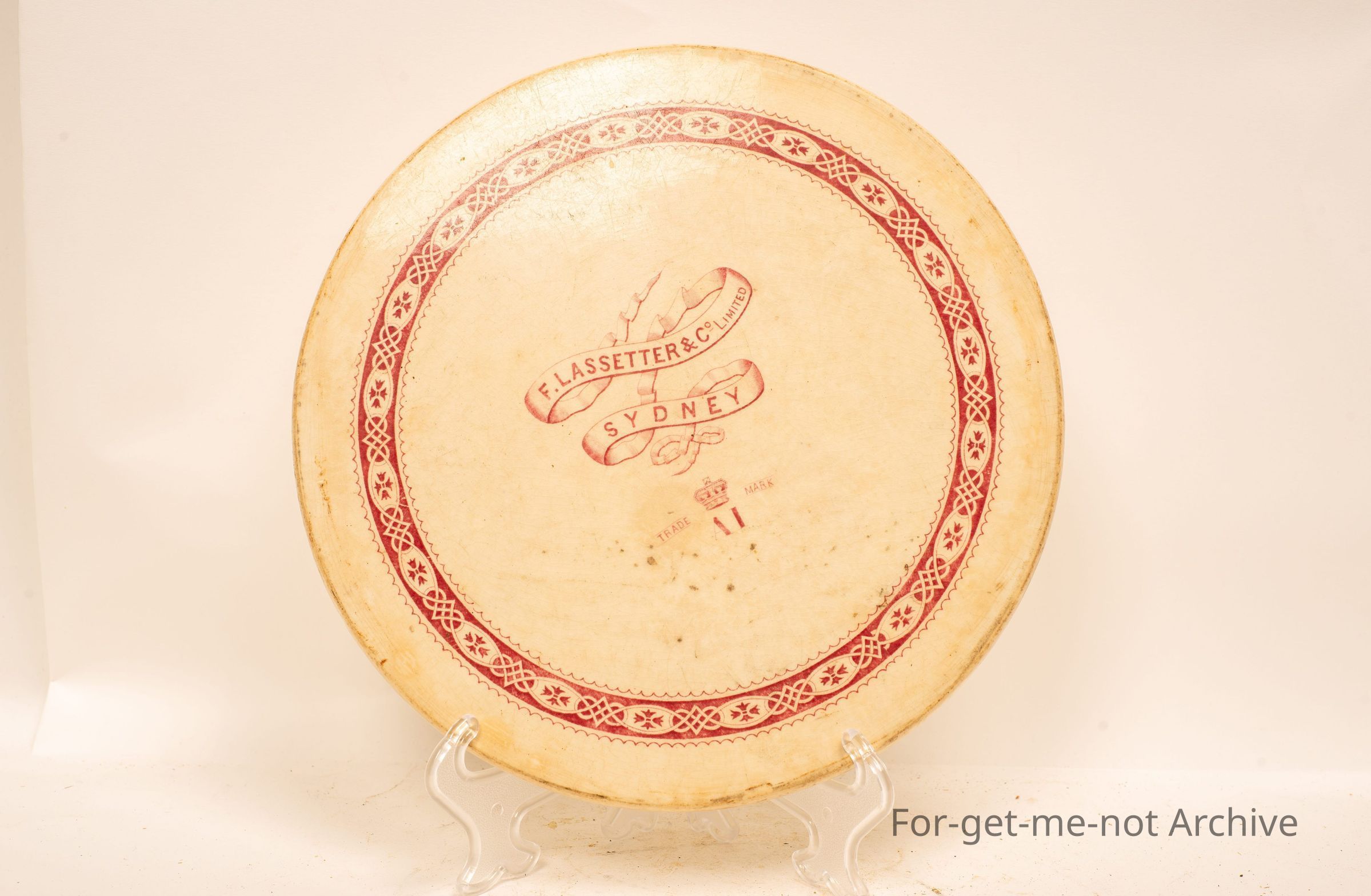 Ceramic flat circular plate, possibly from a set of scales with F. Lasseter and Company Limited Sydney. Crown Trademark A1.