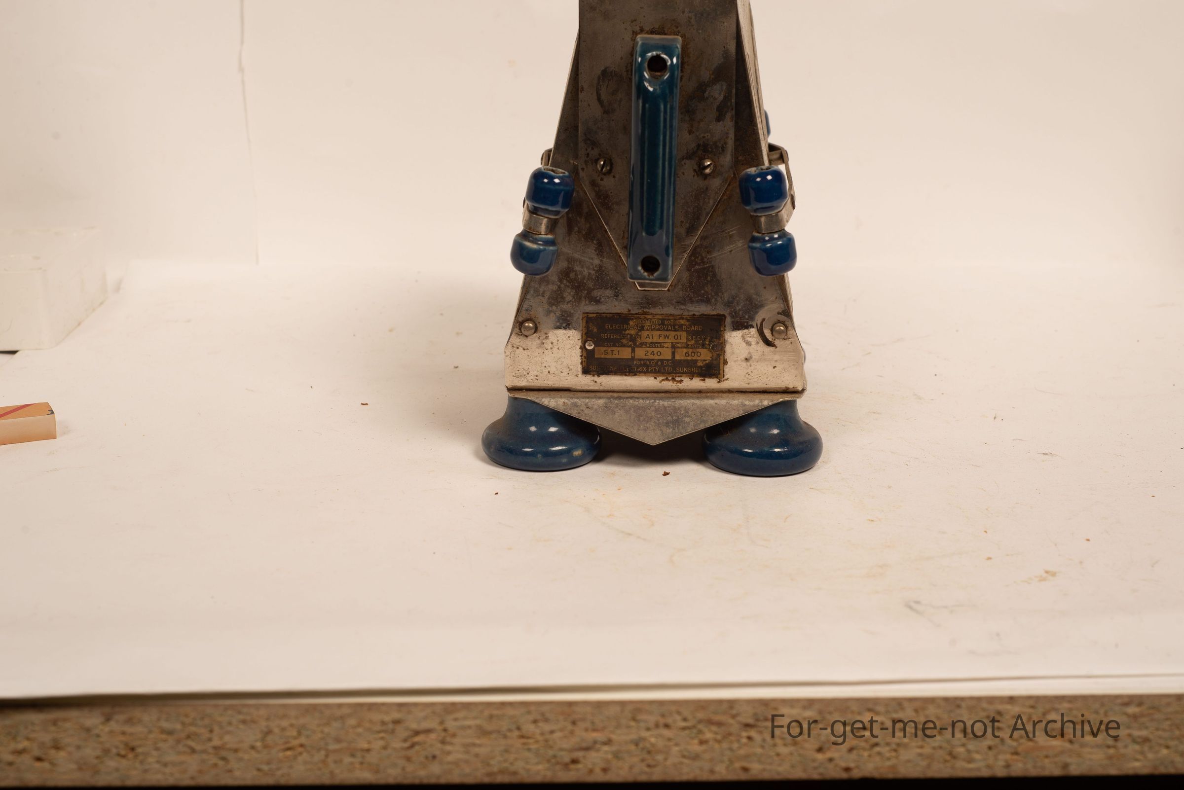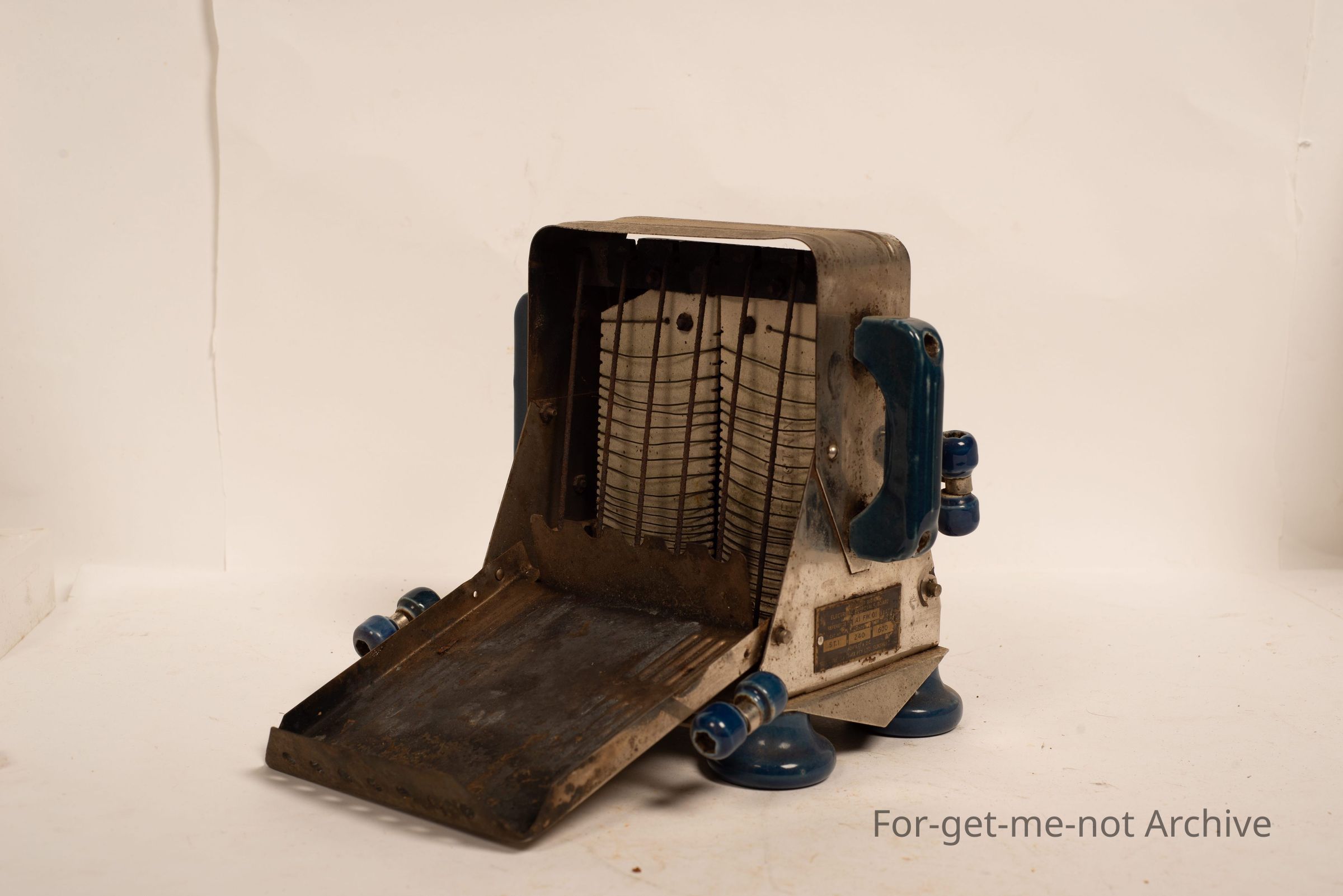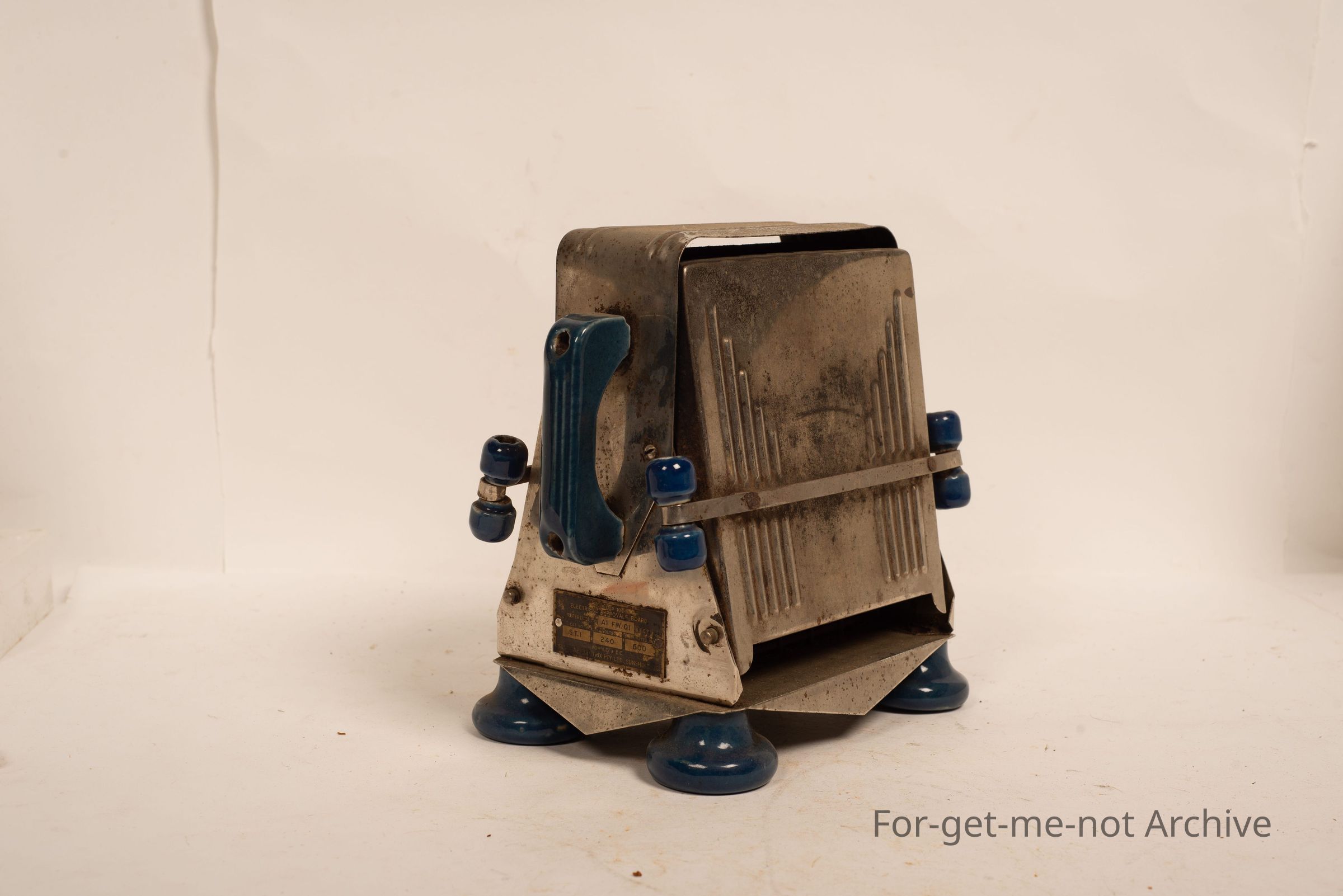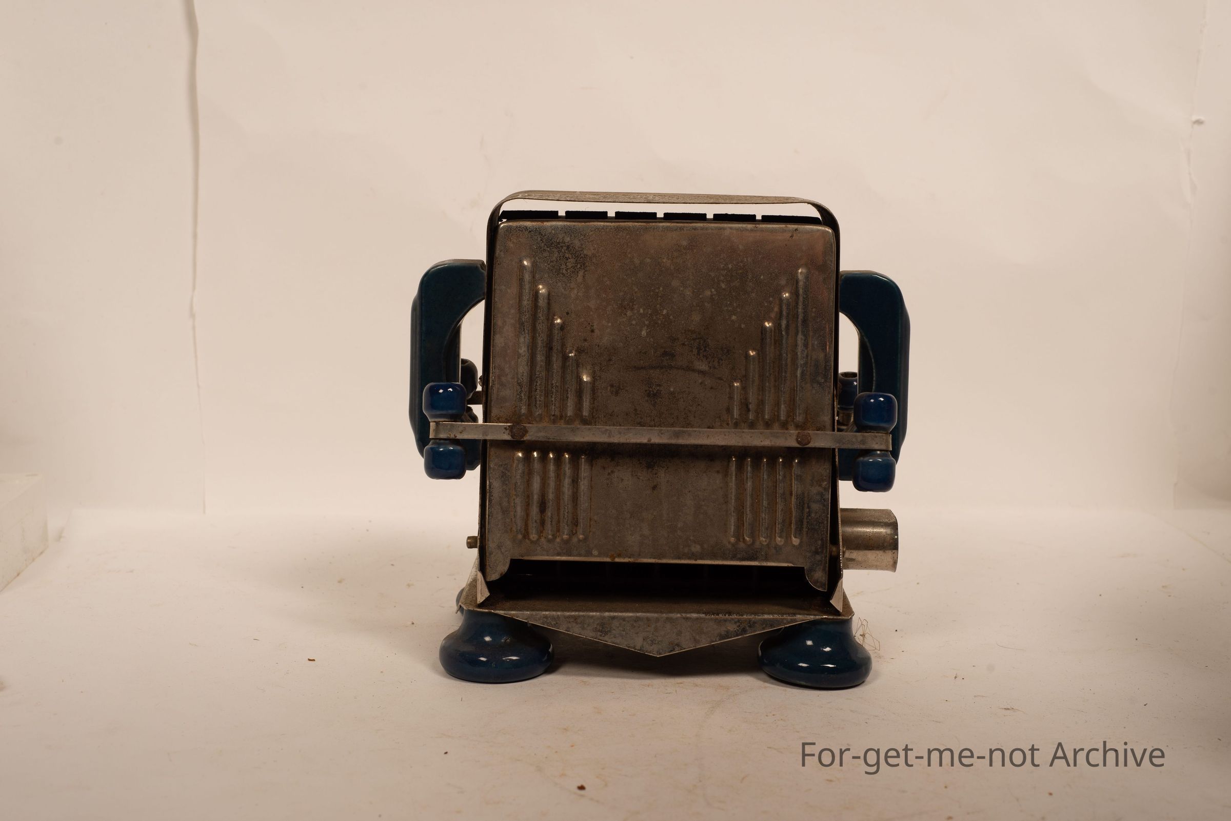 Is an electric toaster, Australian made. I think, Sunbeam. This toaster has ceramic door handles and pick up handles on the side. All intact. Very good piece.
