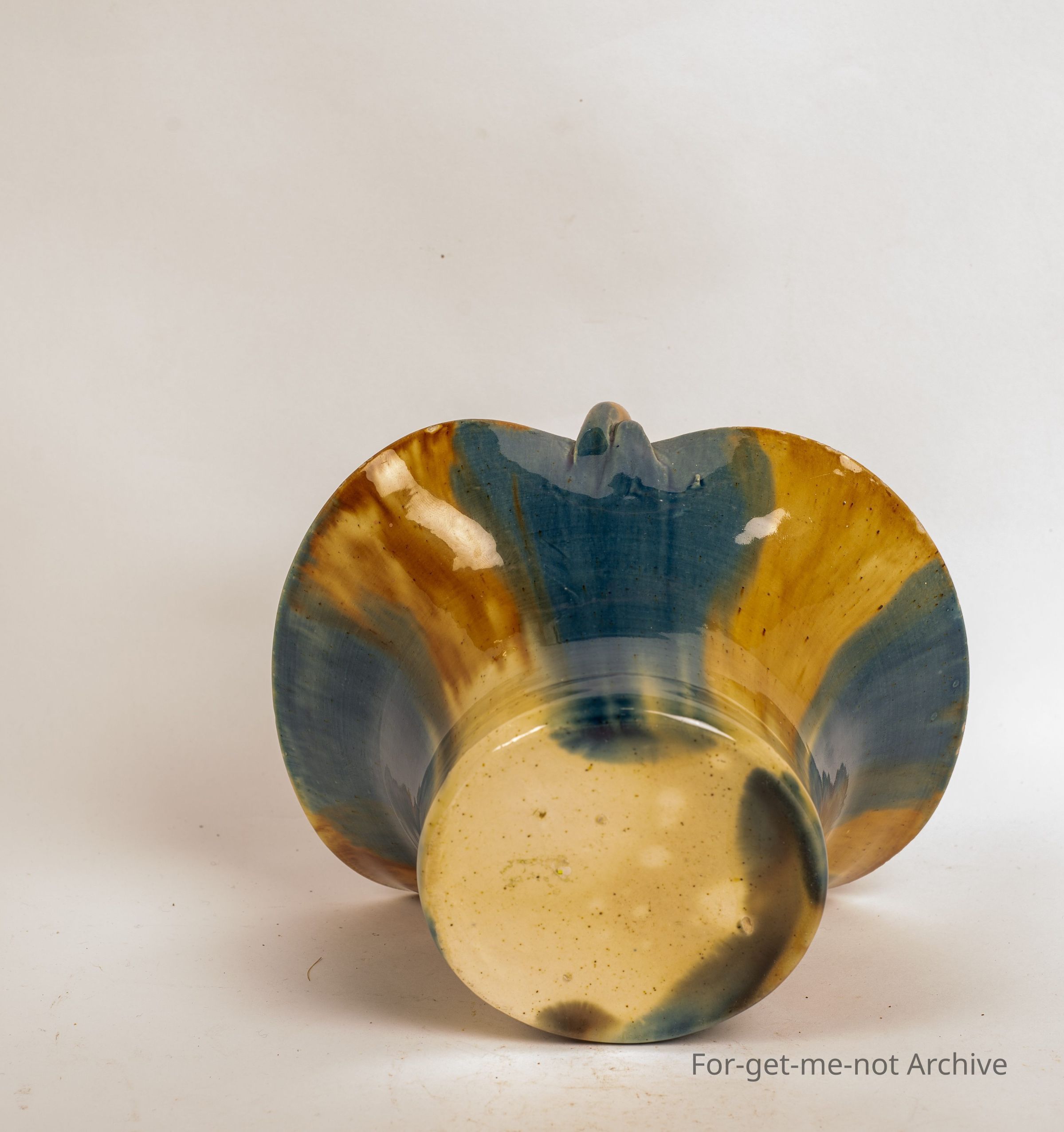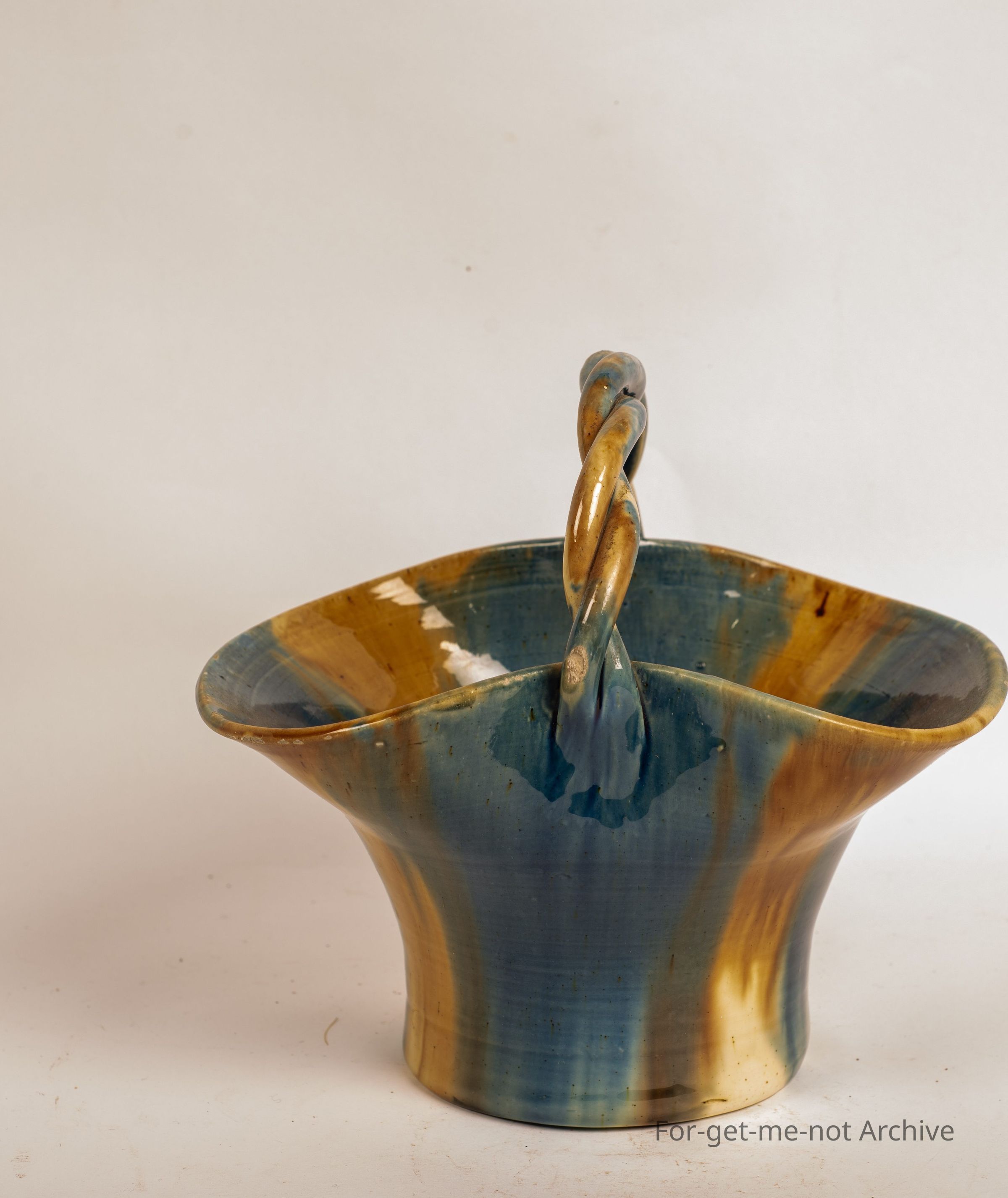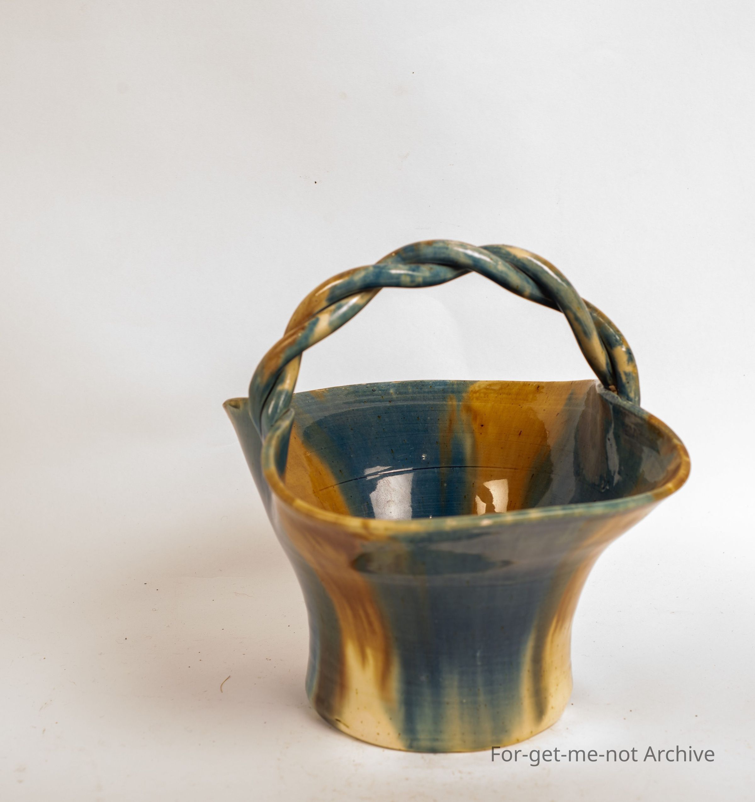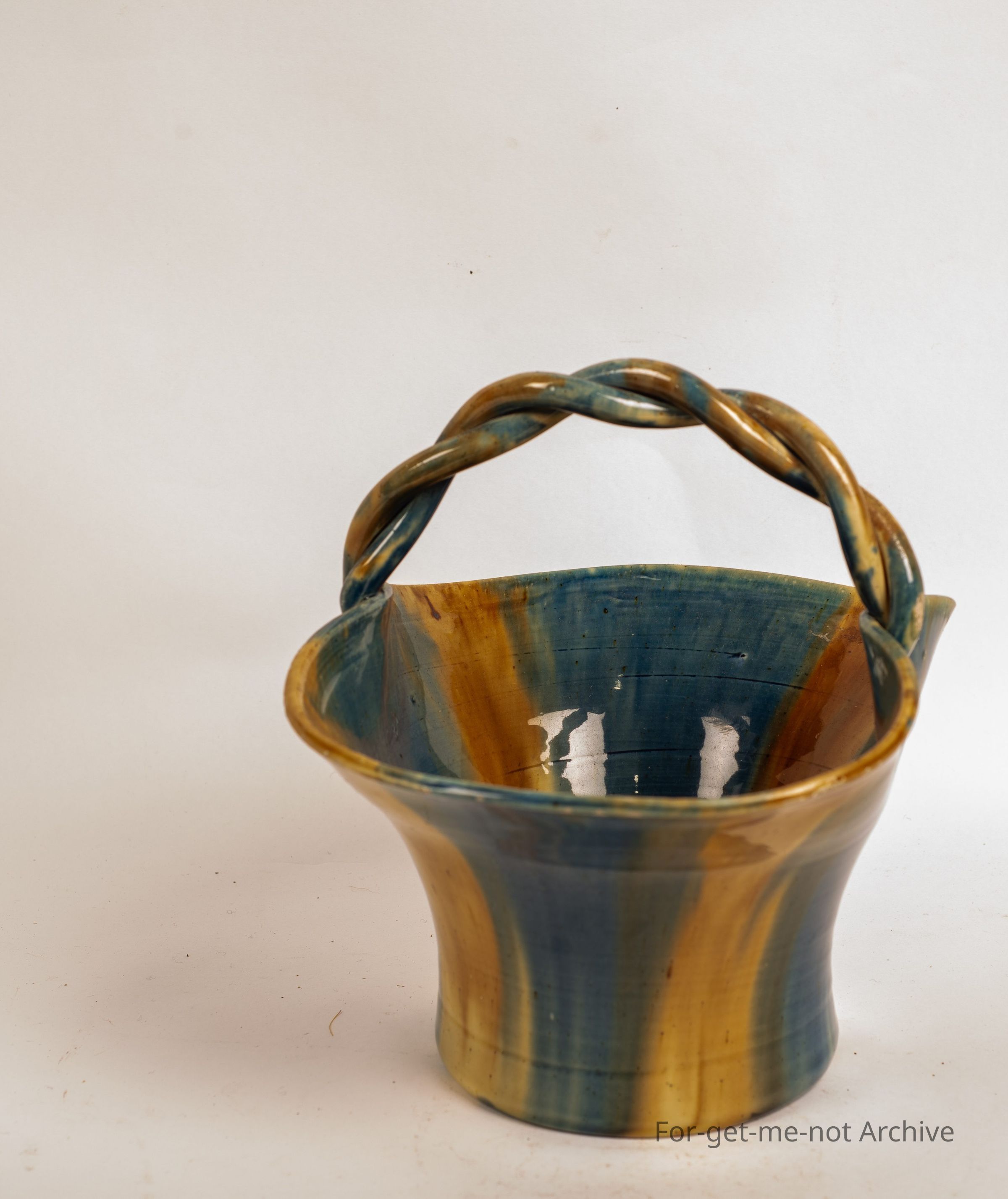 Ceramic basket, barley twist handle, beautiful model glaze, unmarked, unattributed,