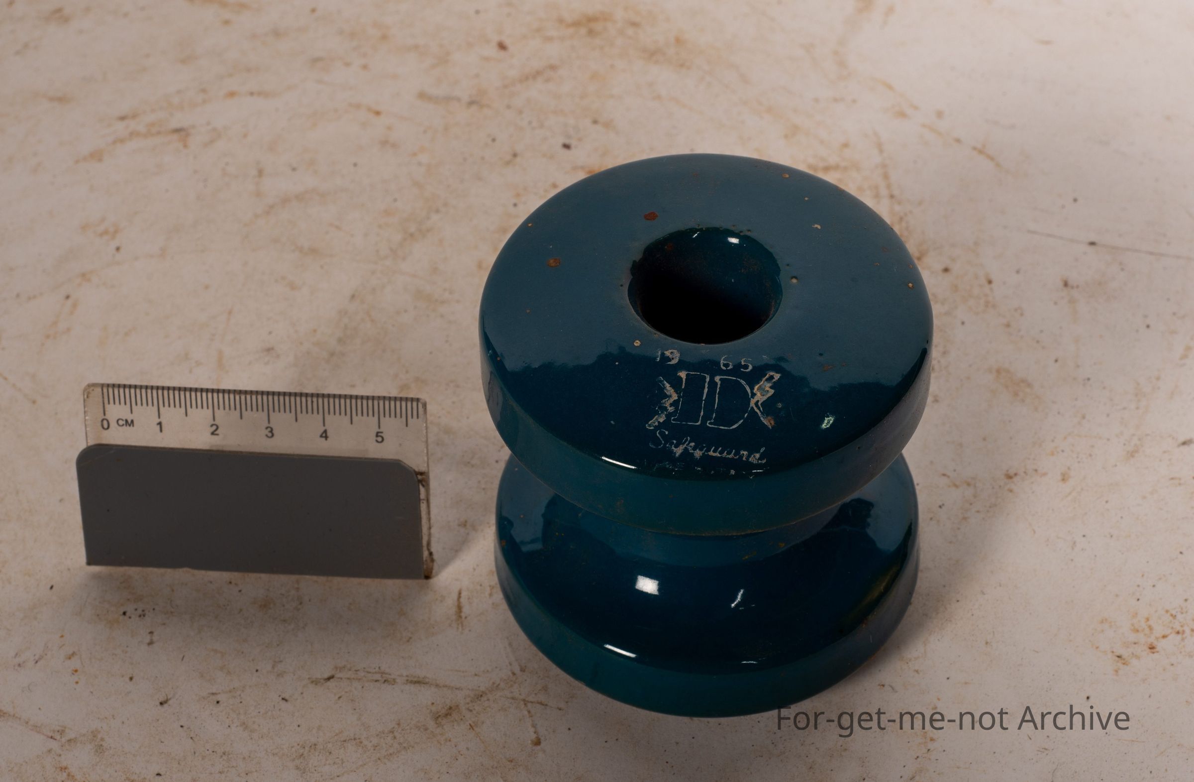 This is a beautiful aqua green glaze on this insulator made in Japan by the Safeguard company. Has a stamp of 1965. Very good condition. Quite an attractive piece value.