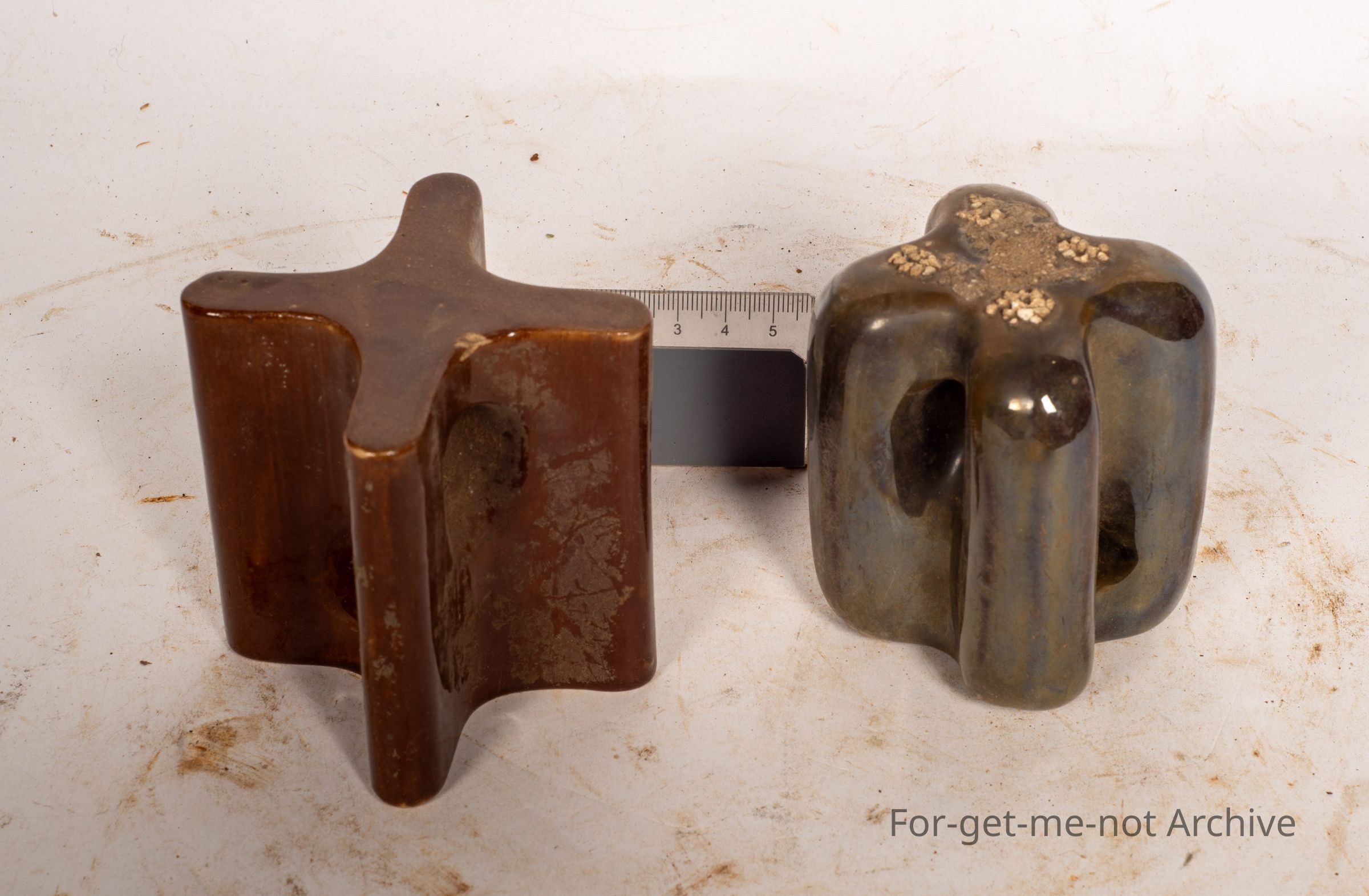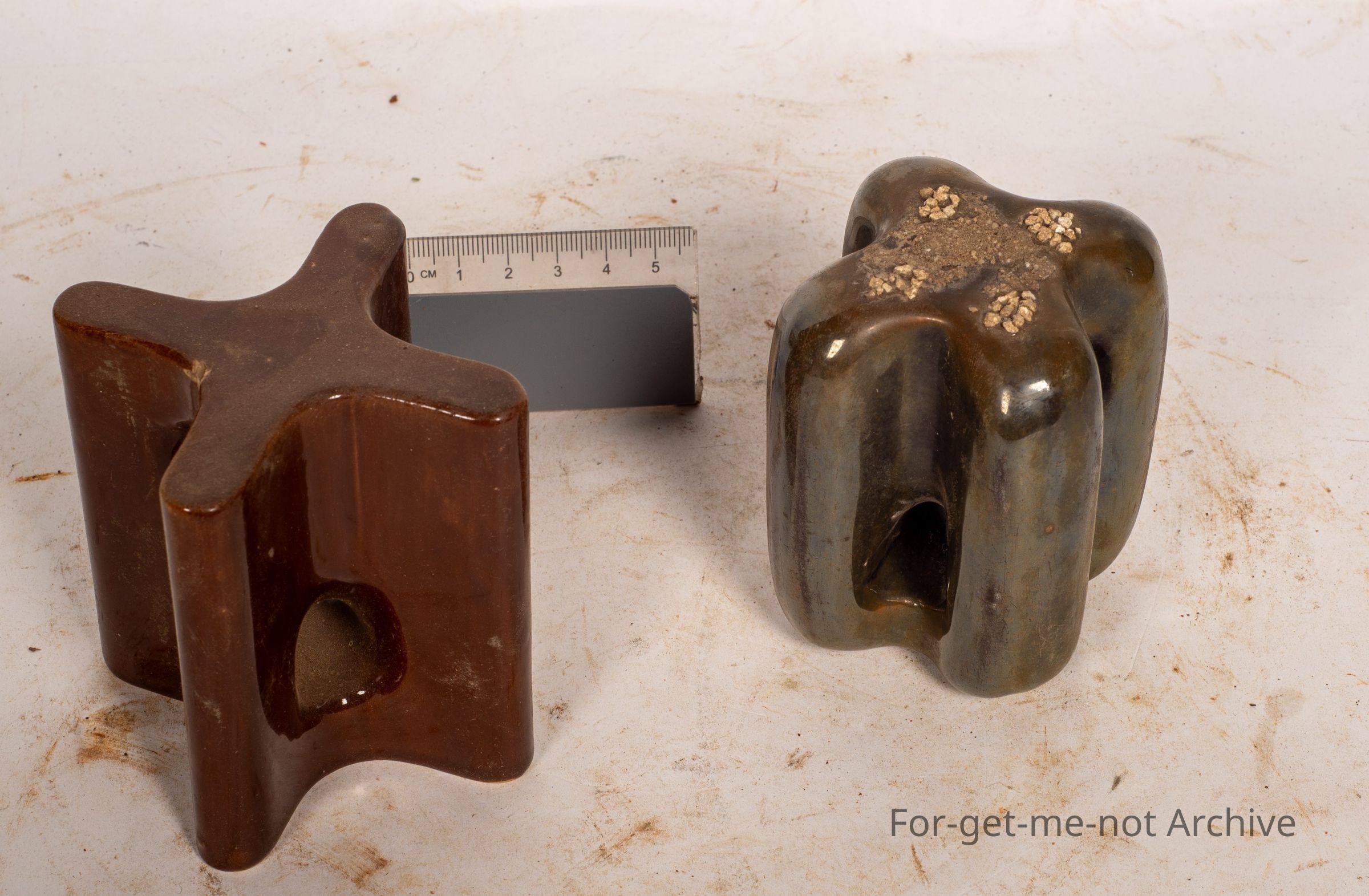These are 2 bullnosed insulators. Both in very good condition, very different designs, but do the same job. 1 glazed in a deep green, the other one in a rich brown.