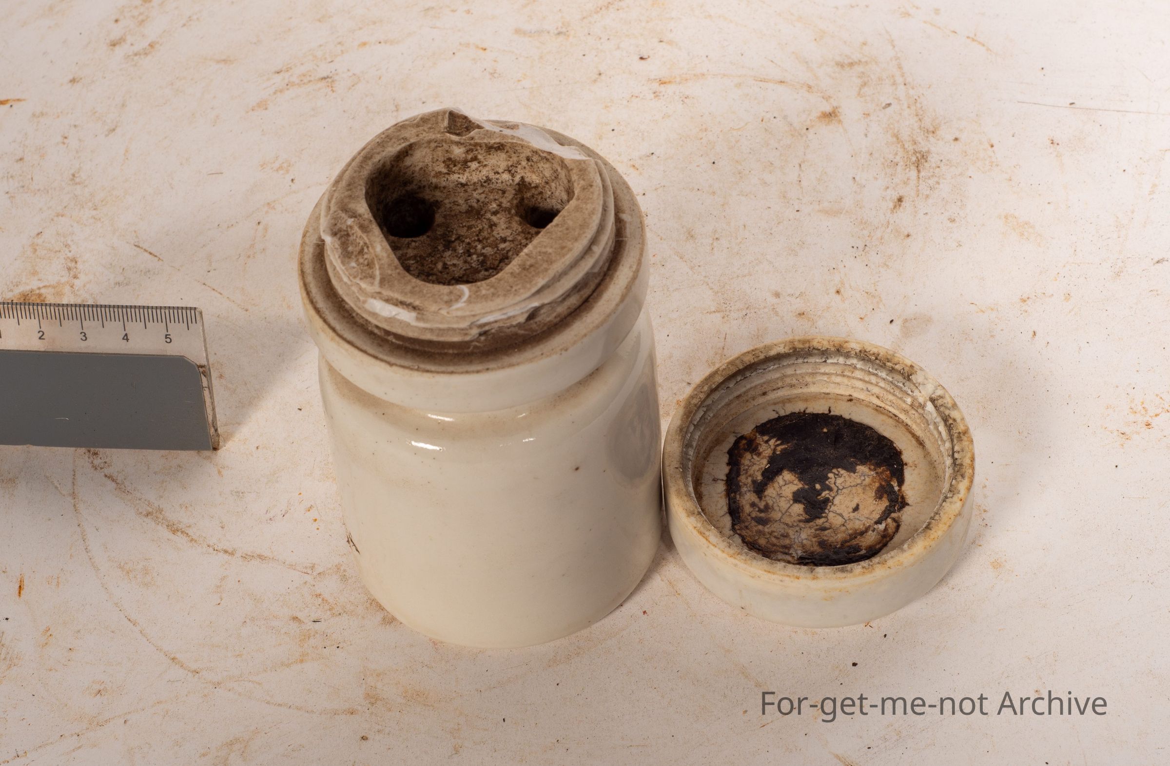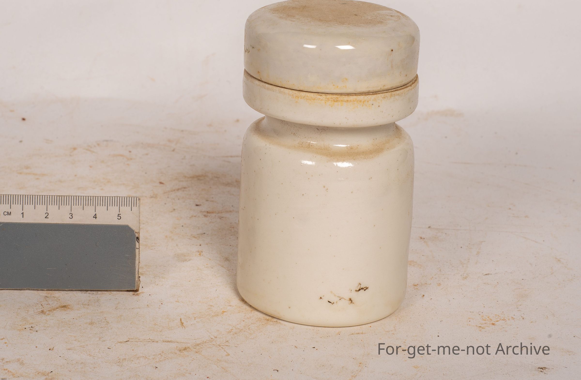 This is another stoneware, pottery insulator. Possibly a fuse holder in the top. Two wires go through into a lid that screws off. Good condition. No identification.Collection