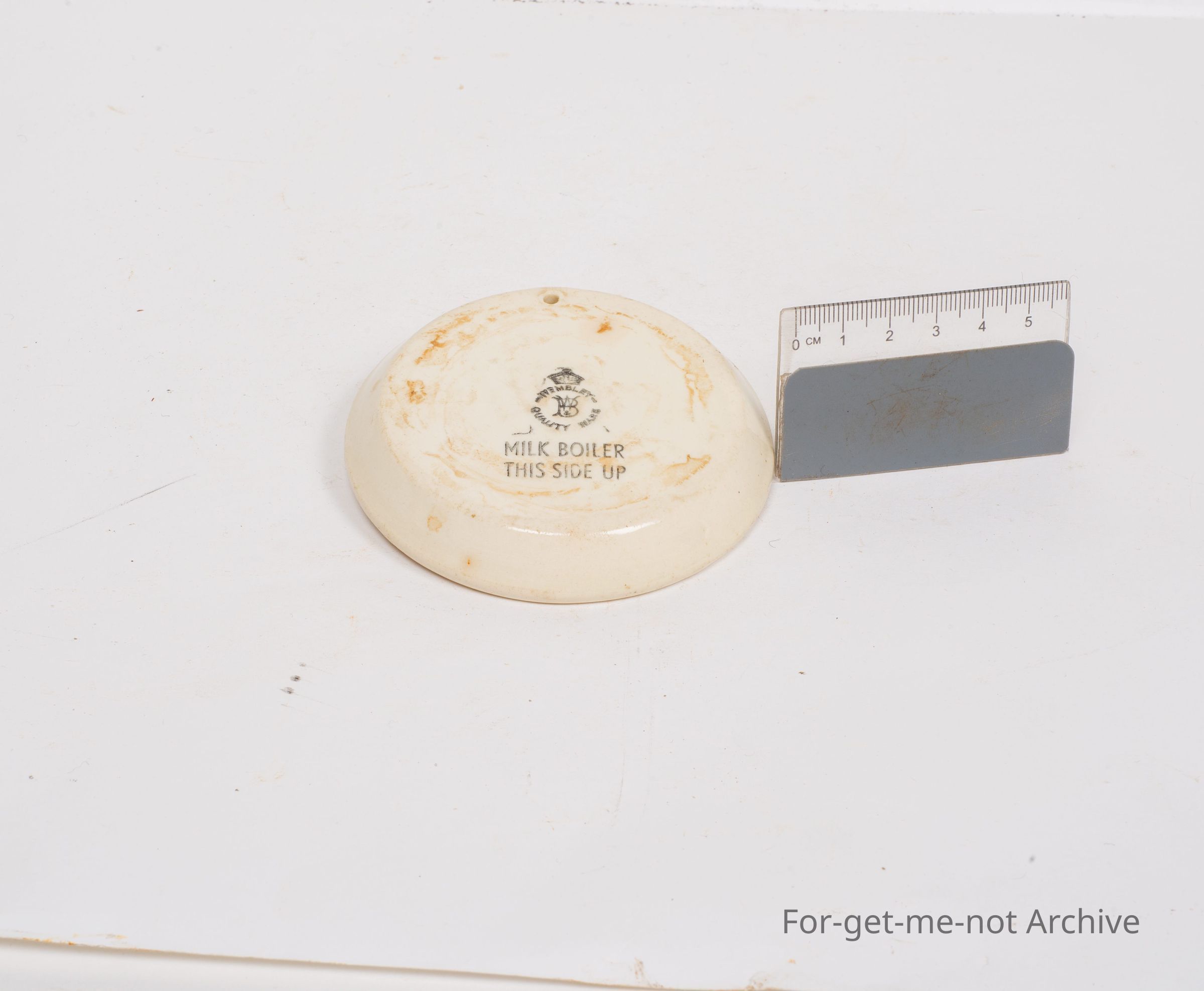 Is a ceramic, piece to prevent milk from boiling. Made by Wembley Ware, which is in Western Australia, indicates which side to have it up.