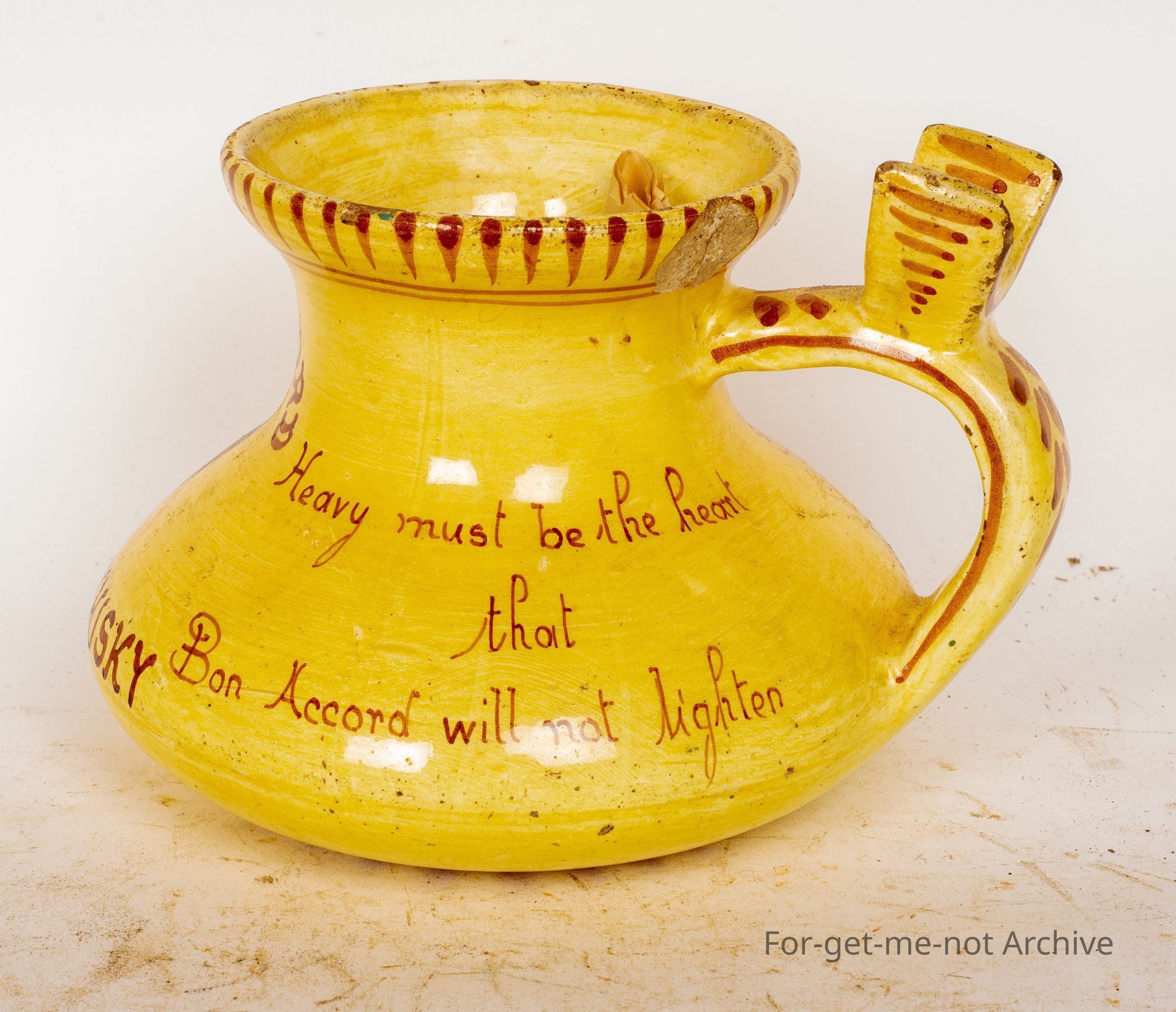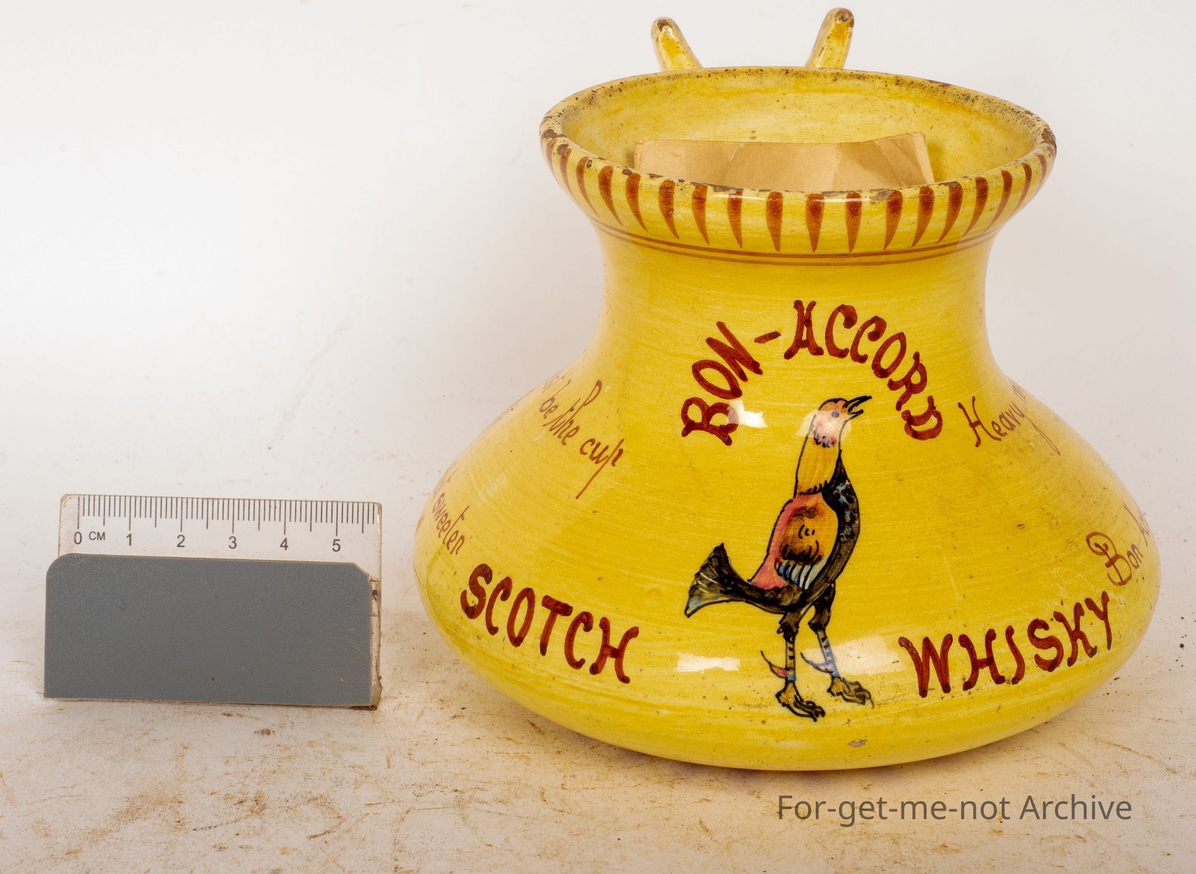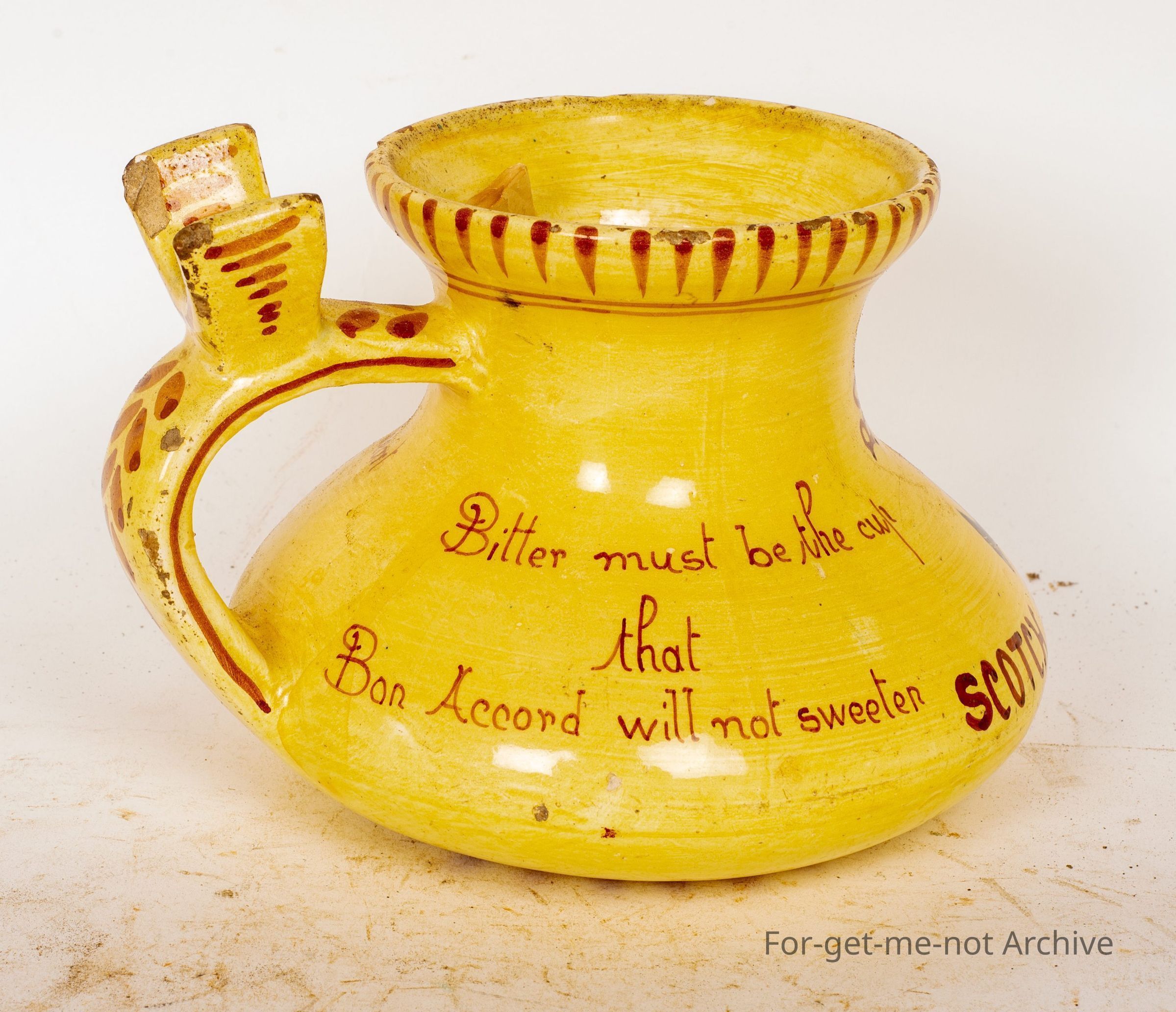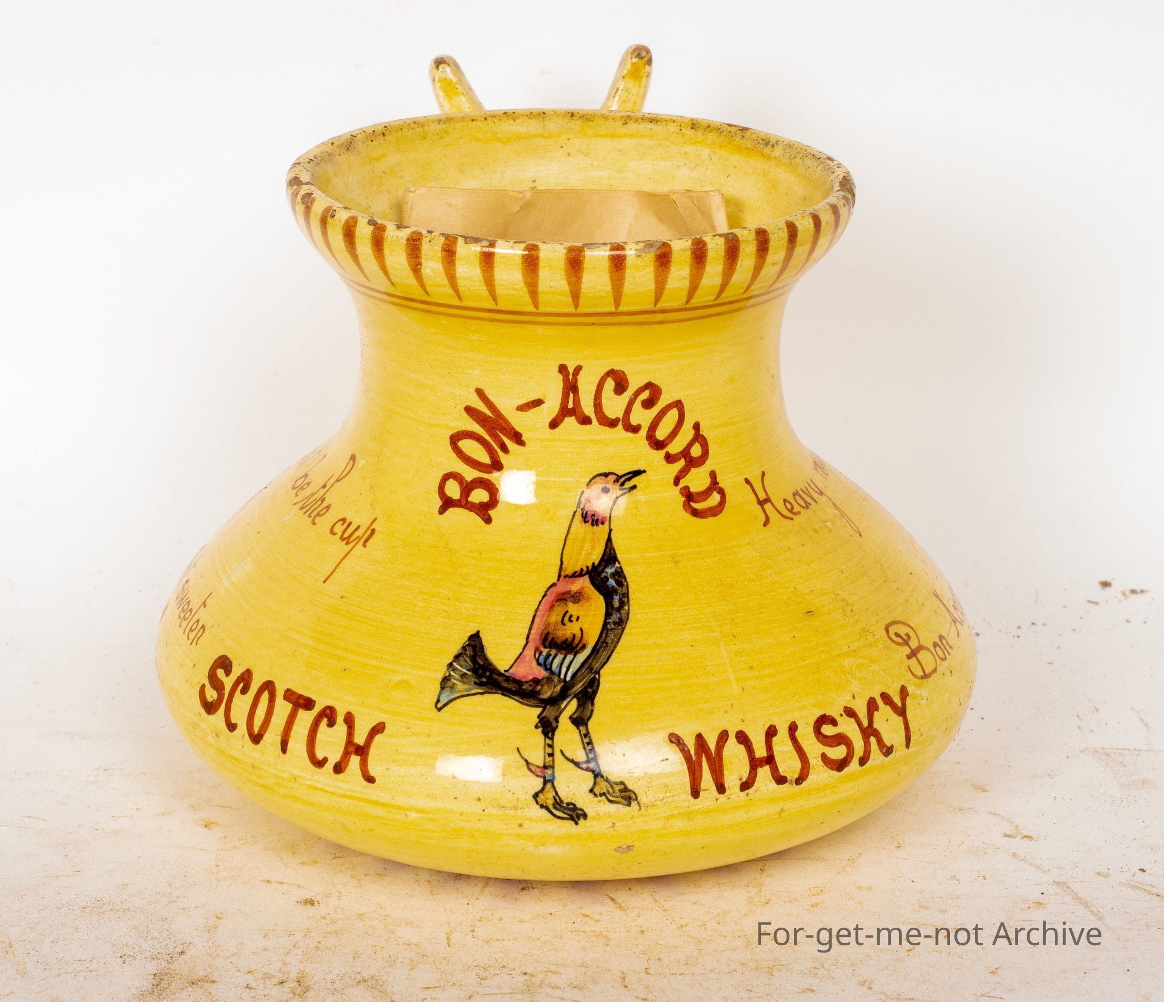 Has a handle on the side with a section to put your thumb in. The text on this is Bon-acord Scotch Whiskey. Bitter must be the cup that Bon-acord will not sweeten. Heavy must be the heart that Bon-acord will not whiten. An unusual piece.