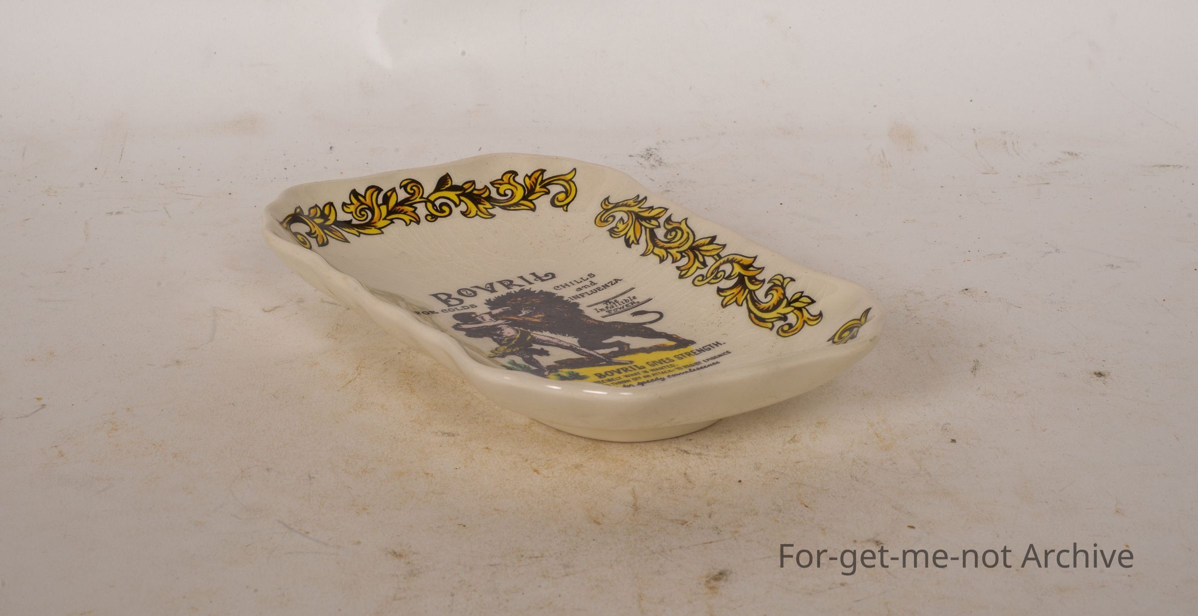 This is a little ceramic plate. The advertising is for Bovril, which has a fellow or a man with a lion having a ball, and the text at the bottom says, Bovril gives strength. I don't know that it's very old, but, made in England,Collection