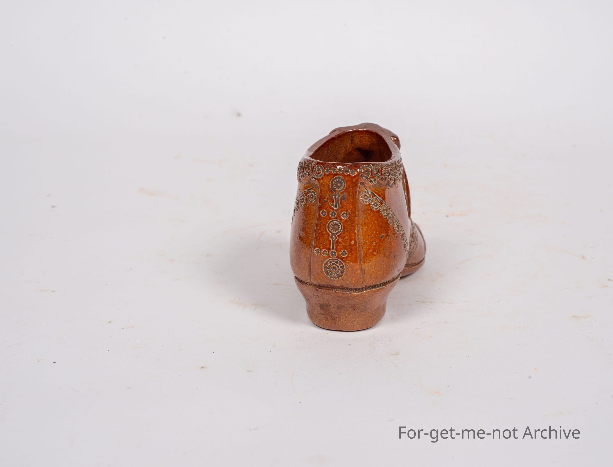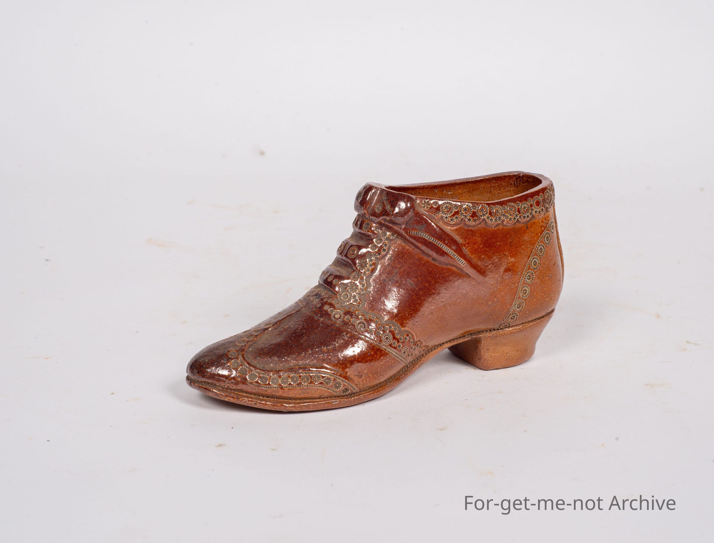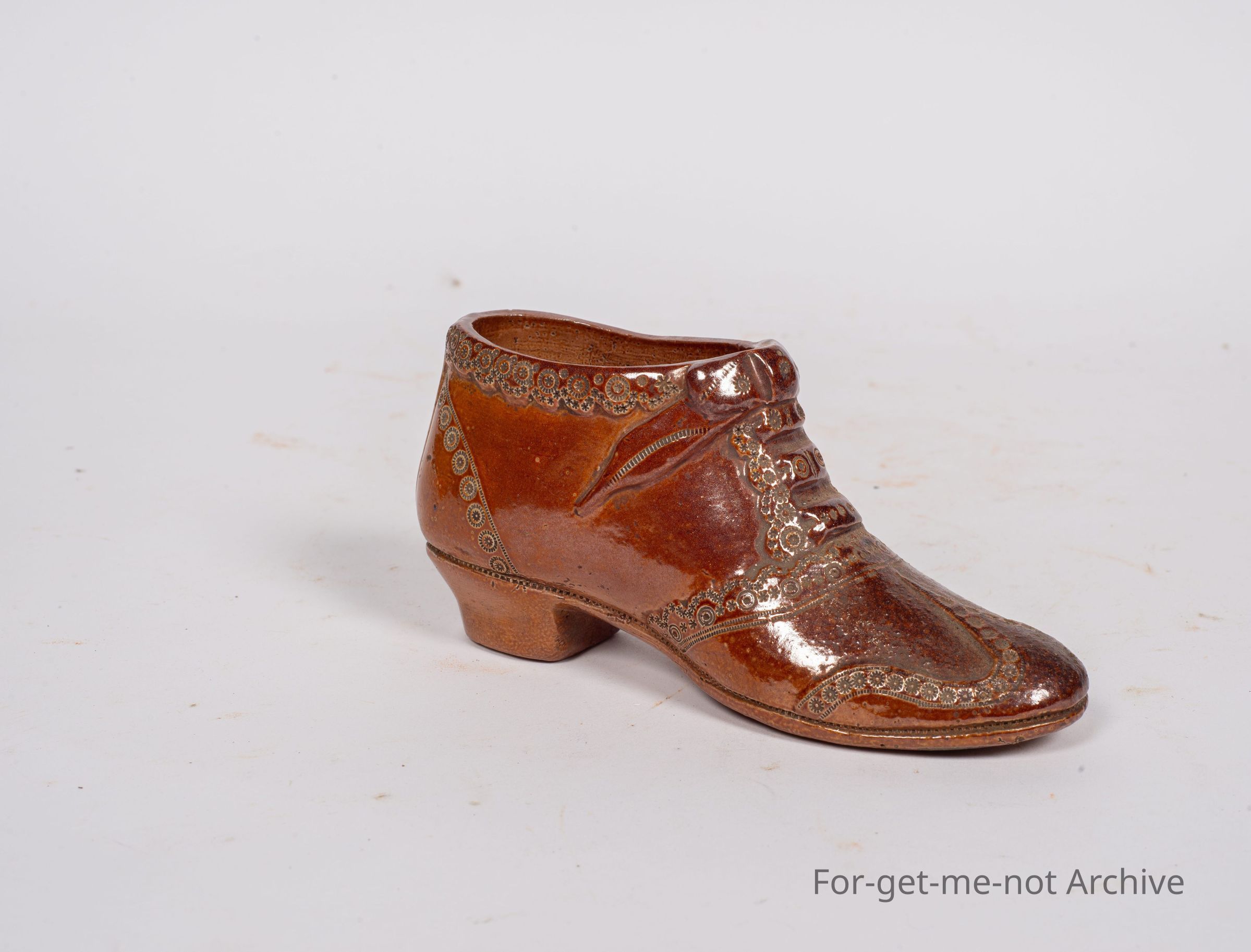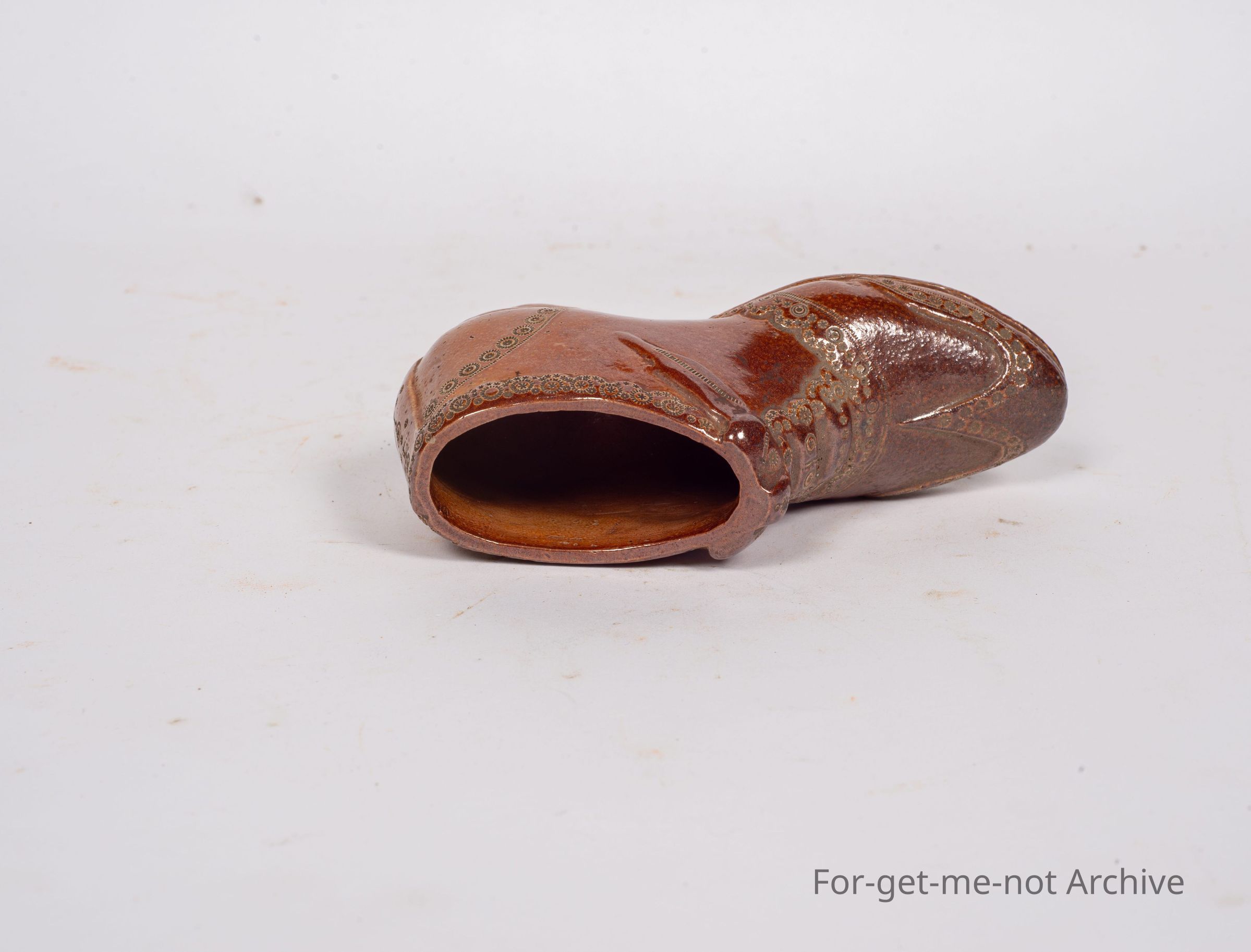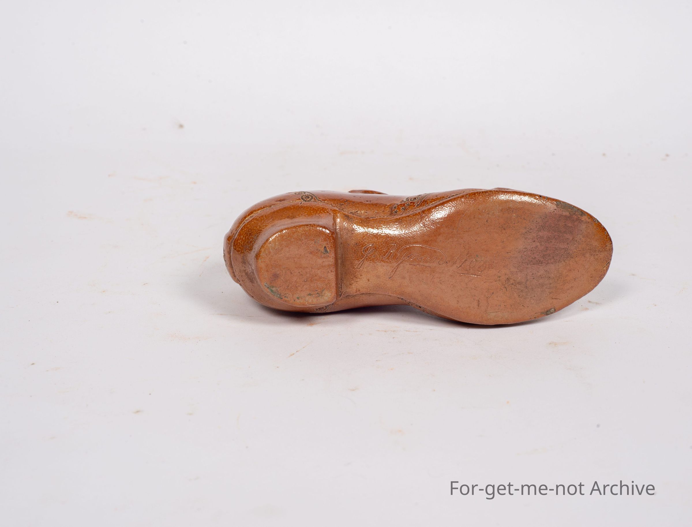 Is a beautifully made ceramic shoe. Extremely ornate, signed underneath 1900. Signed J. Ryman but this is absolutely delightful workmanship, salt glazed. It may be Australian origin or could possibly be English.Collection