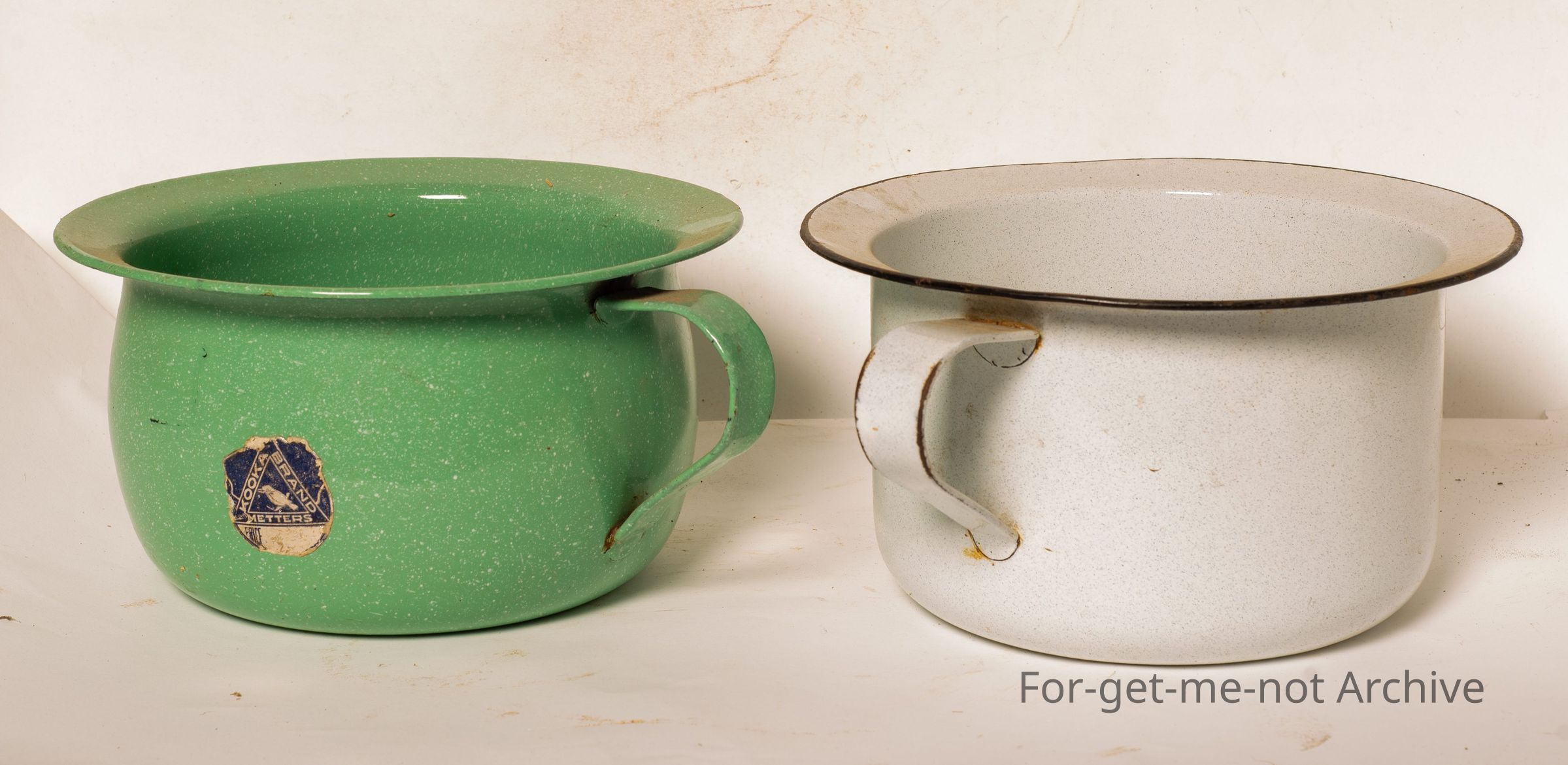 Enamel, under the bed pot ablution Chamber pots, one green enamel, the other white enamel handle on the side. One has a manufacturer sticker of Kooker Brand - Metters, Both of these are quite usable and in good condition.Collection