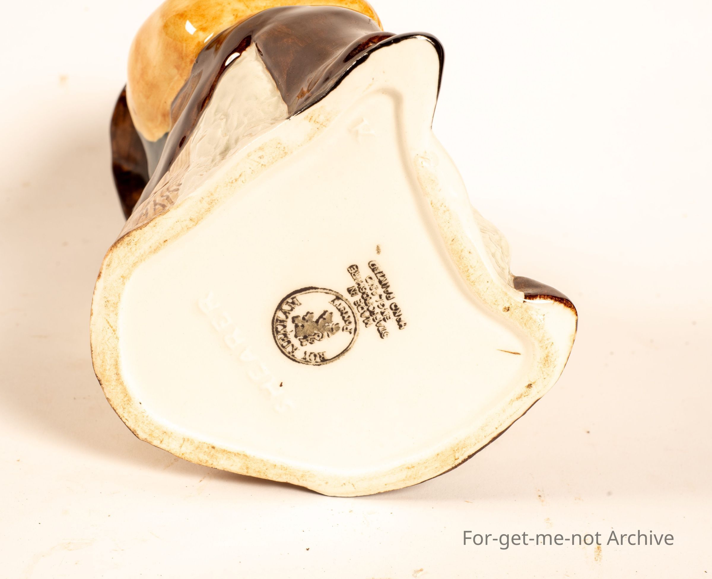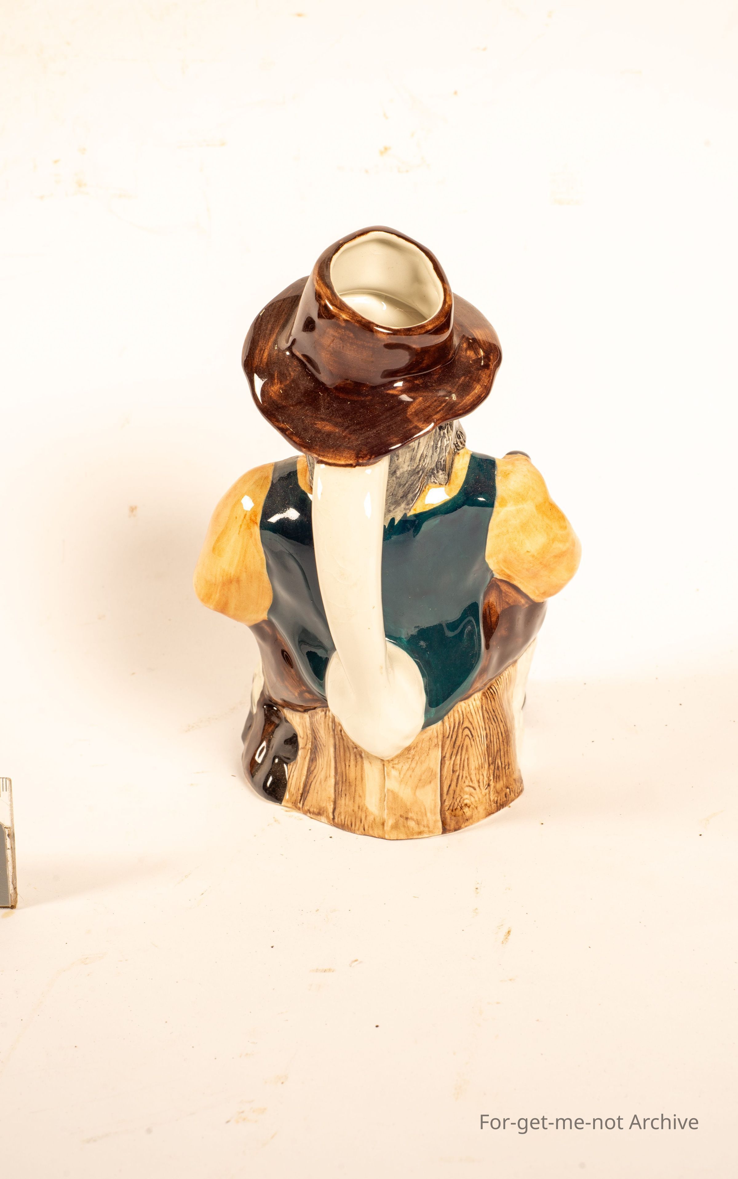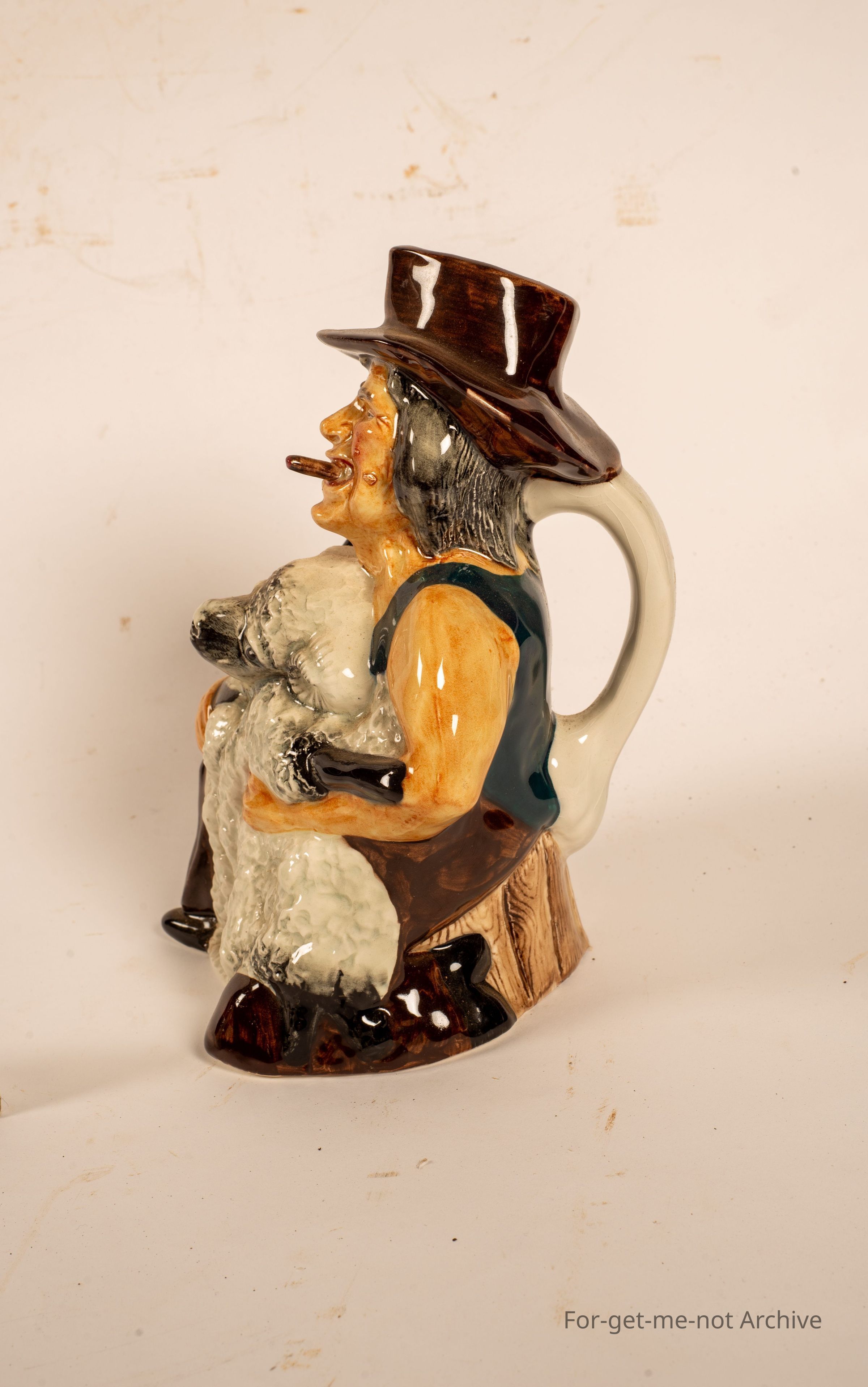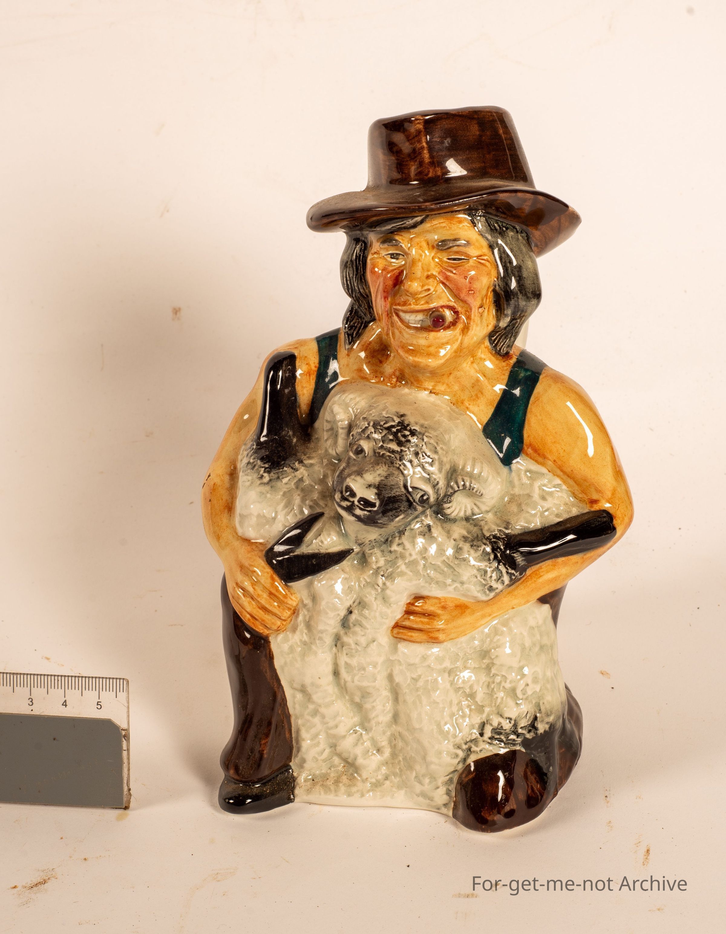 This is a characture of a blade shearer, that's in fact a drinking vessel. The fellow is sitting on a stool with a pair of blades shearing the sheep, with a cigar in his mouth Made by an English Ceramic Company, perfect condition.Collection
