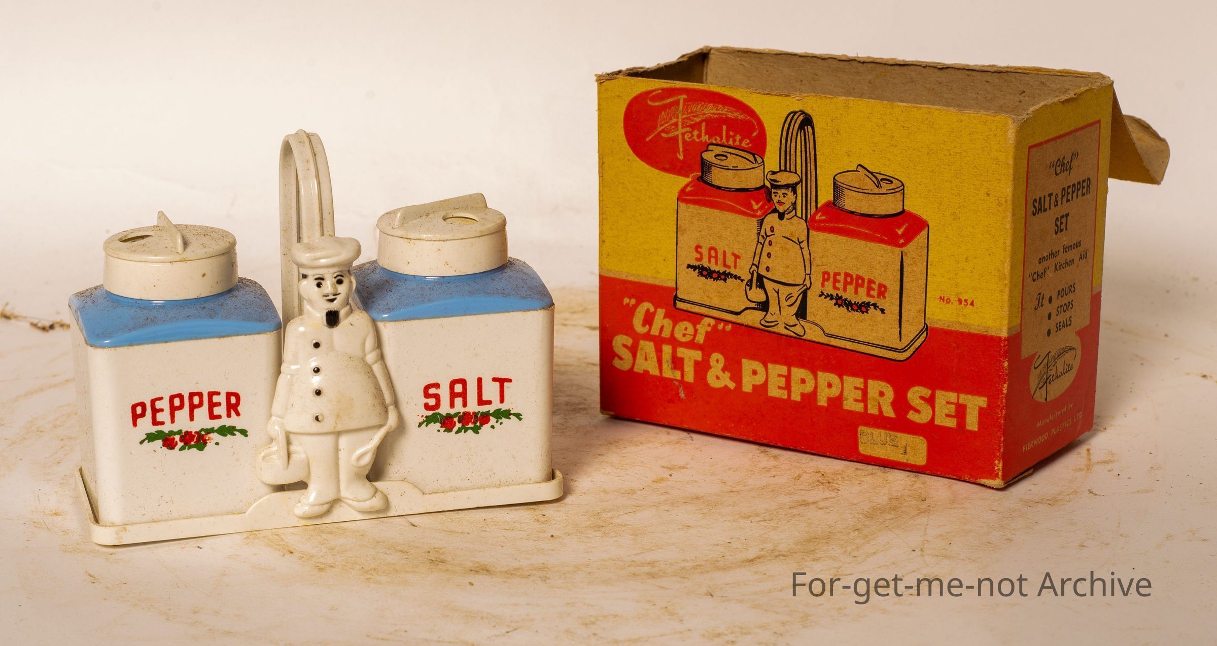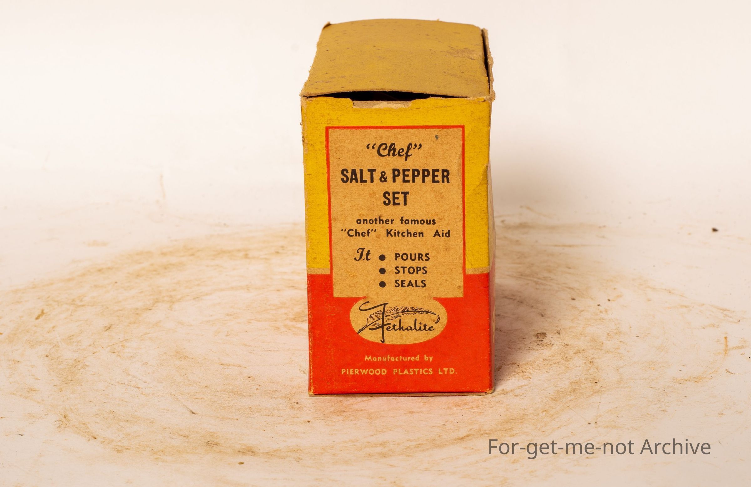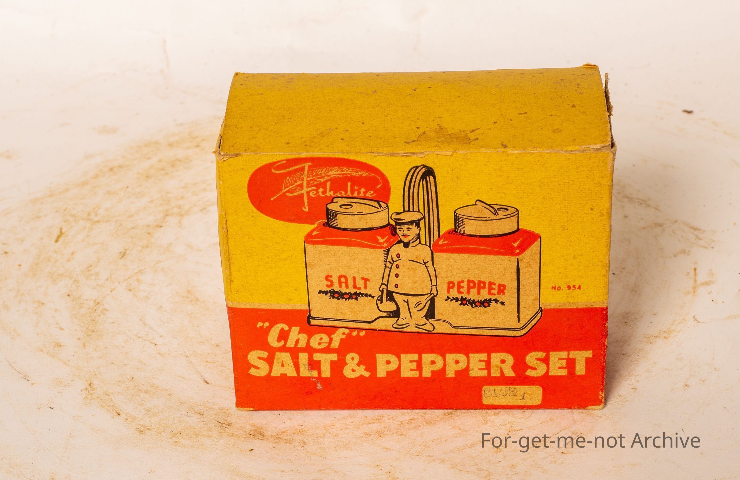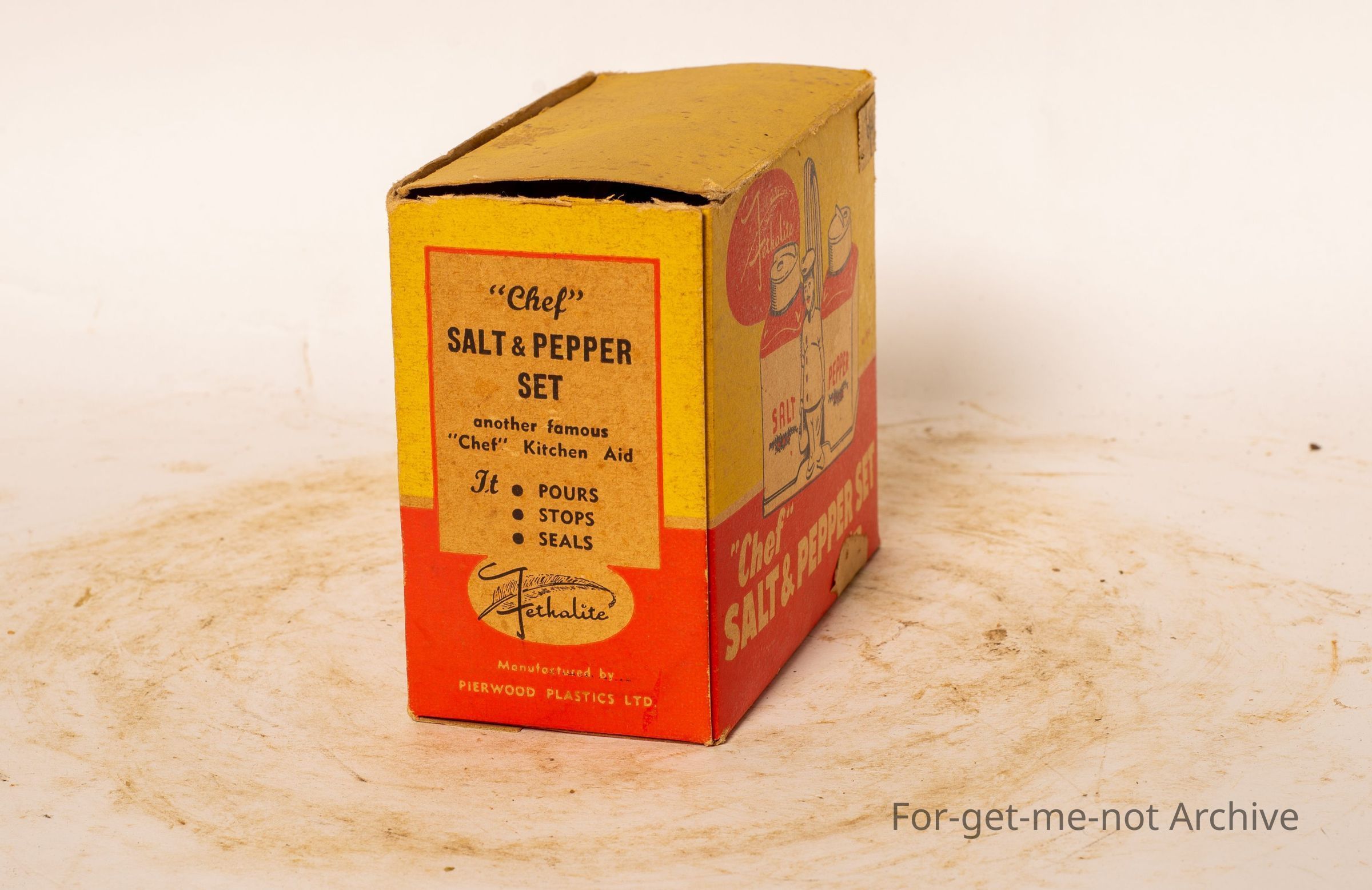 Cardboard box. Chef salt and pepper set in the cardboard box, all complete. By Featherlite