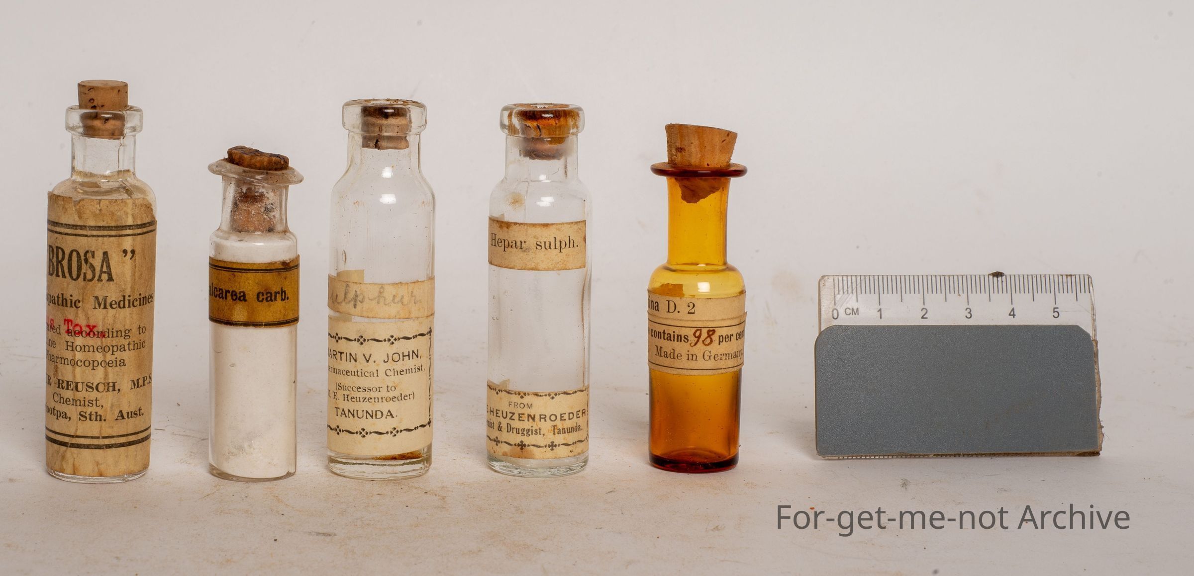 These are a group of 5 beautiful little early chemist bottles from Nuri Utna, South Australia. One from Tanunda. All glorious in very good condition. Paper label. Even, one's called carbide soda. Another one from TanundaCollection