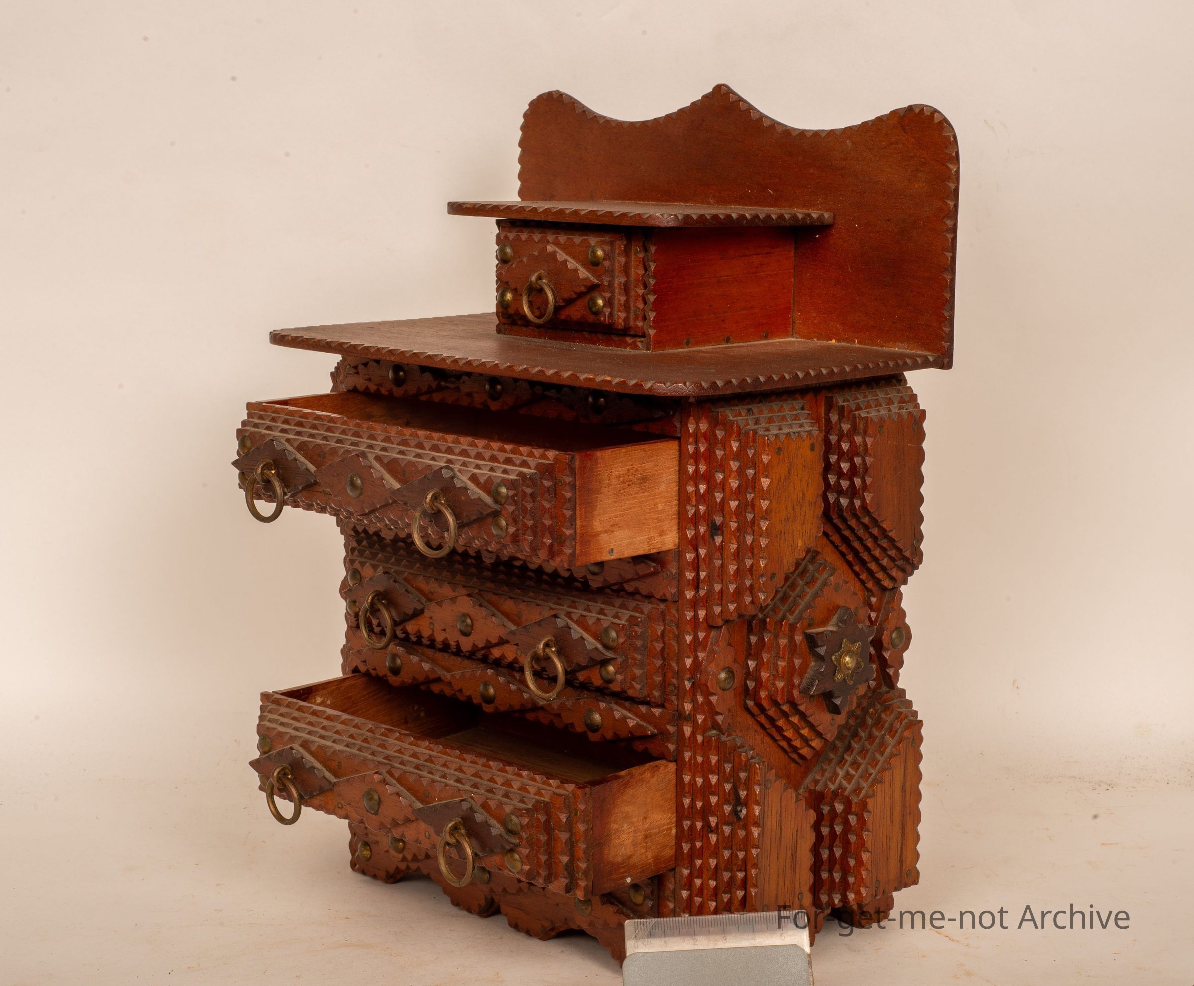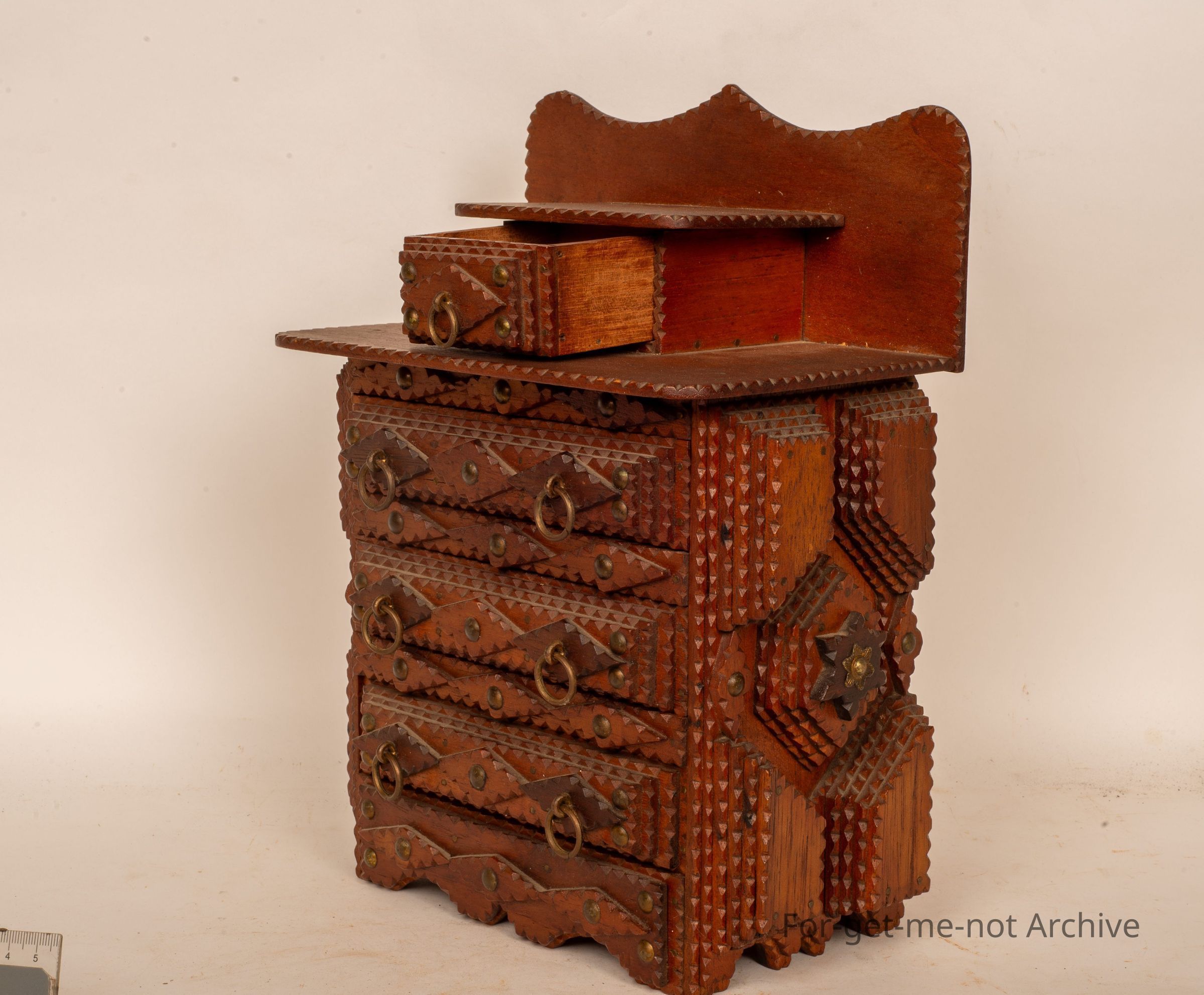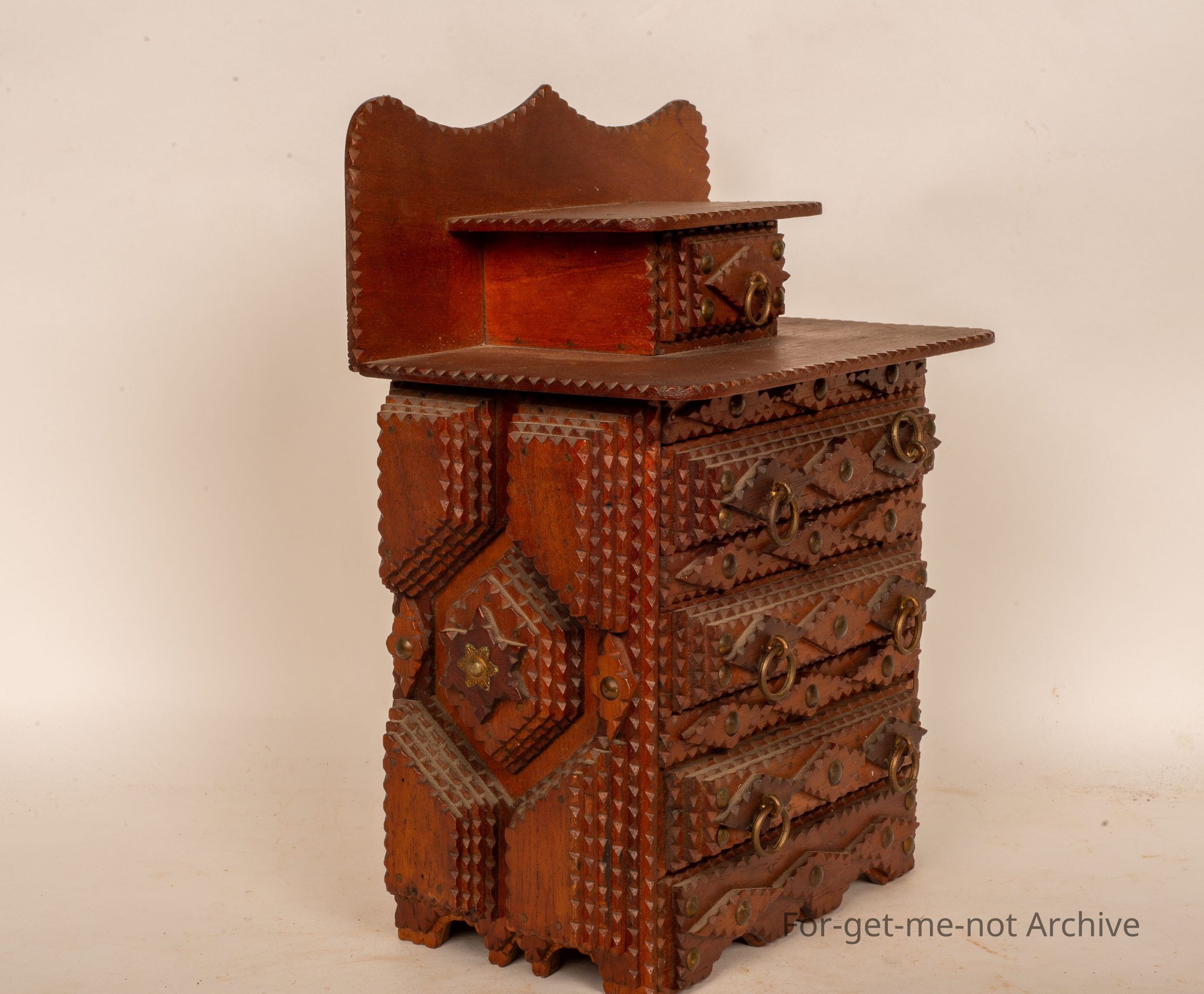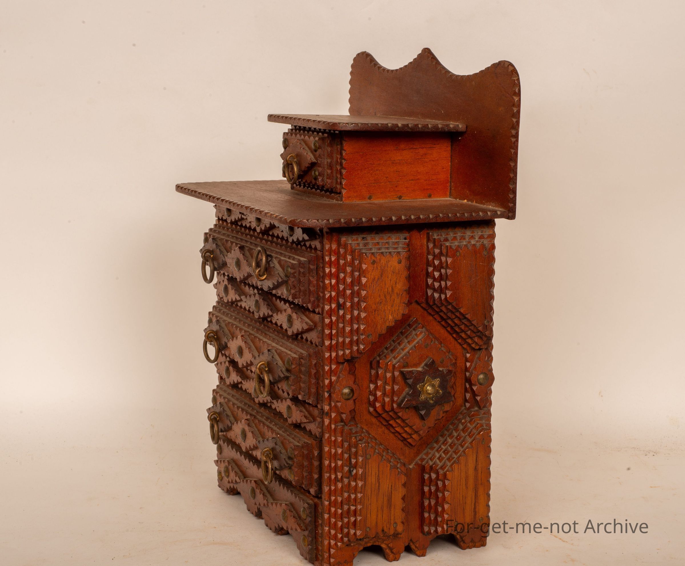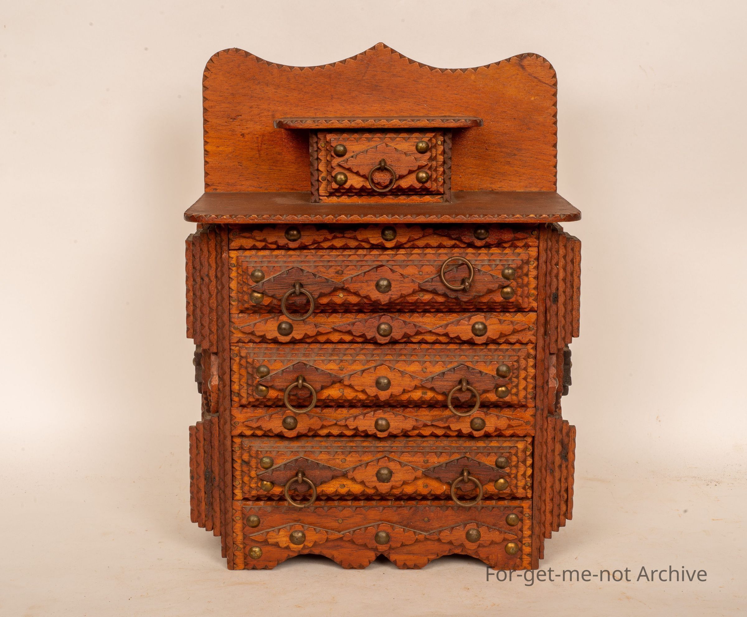 This is a beautiful little chest of drawers. 4 in a row with the or 3 in a row of the same size. Small one at the top. Very ornate. Beautiful condition