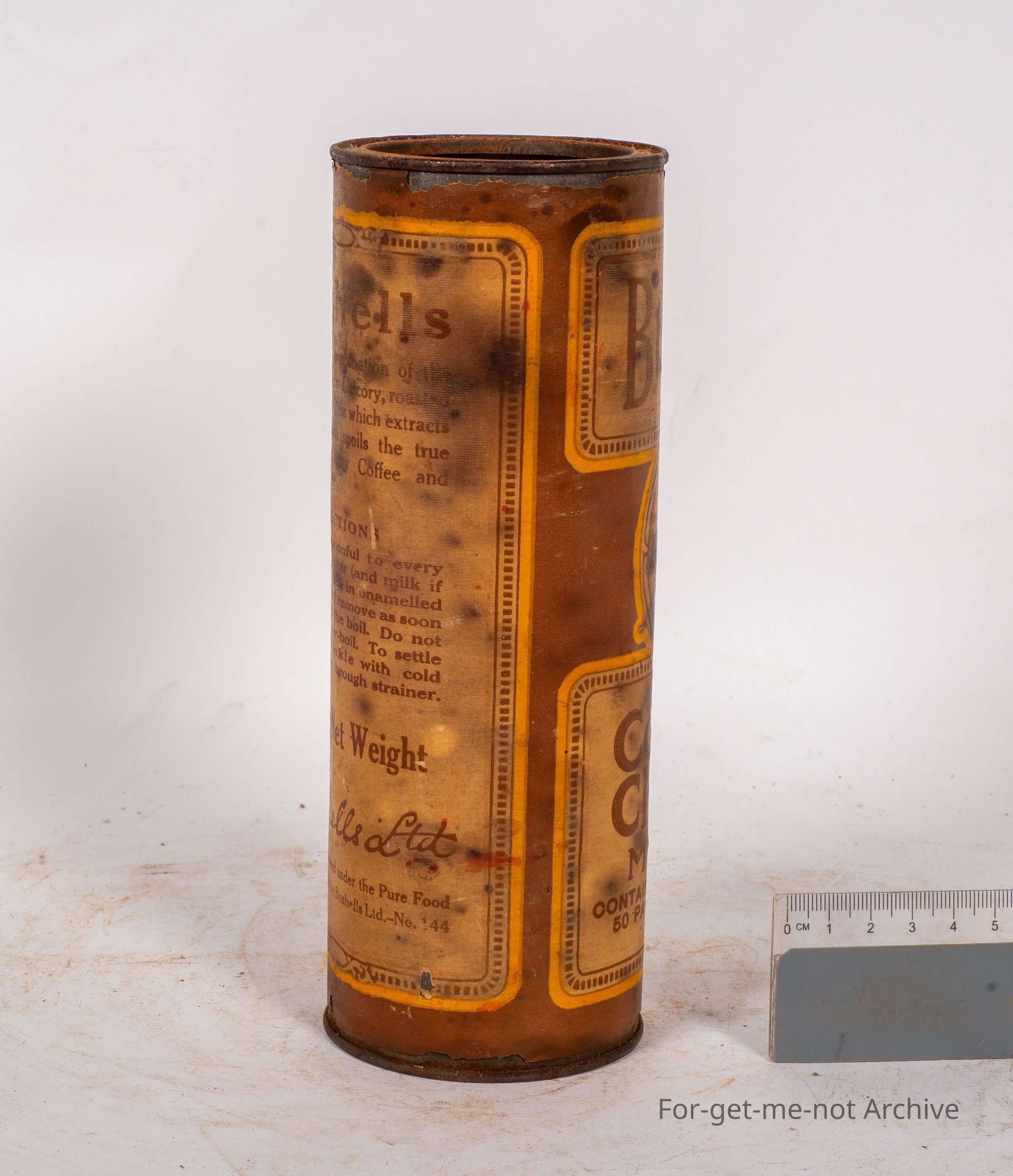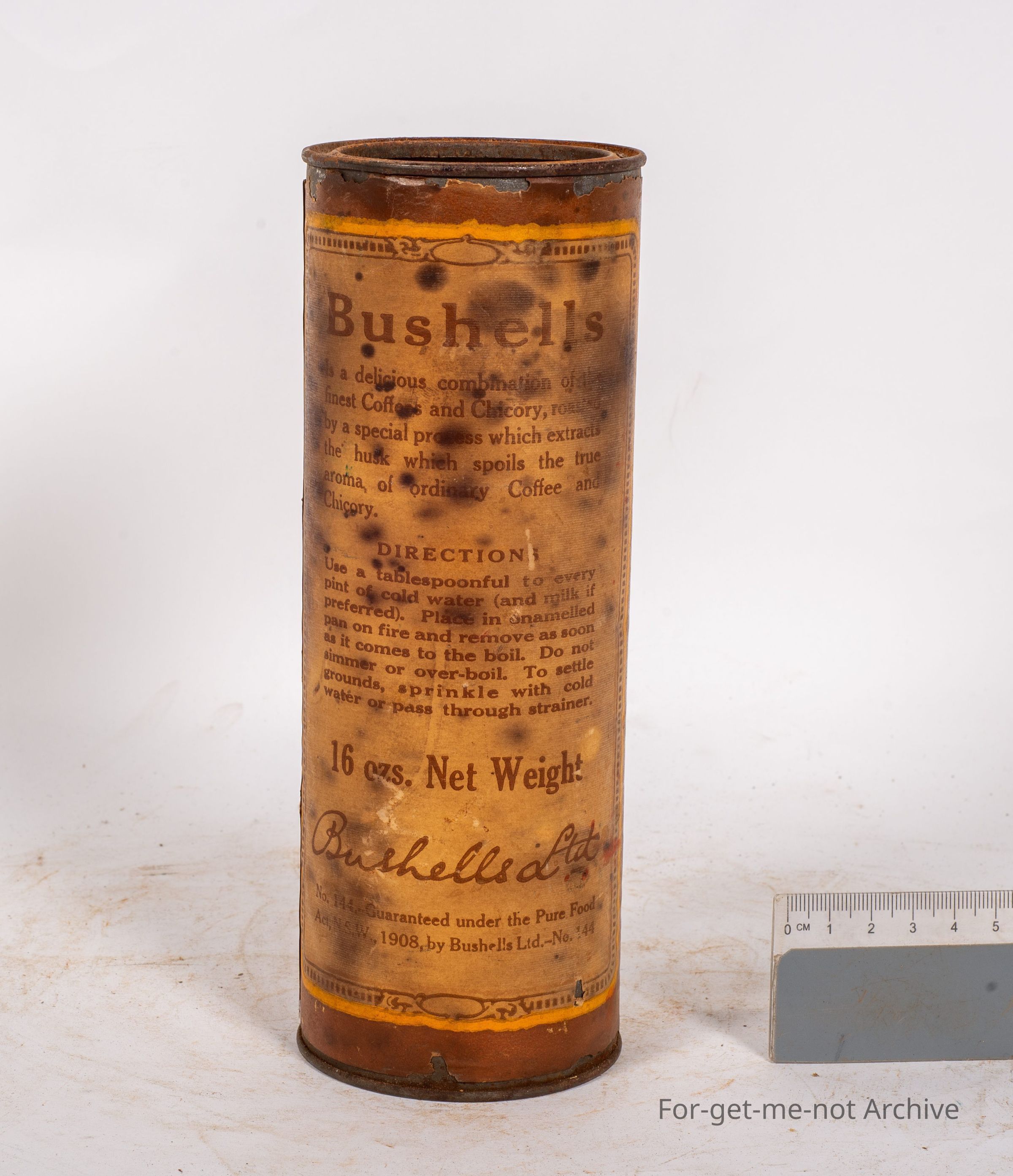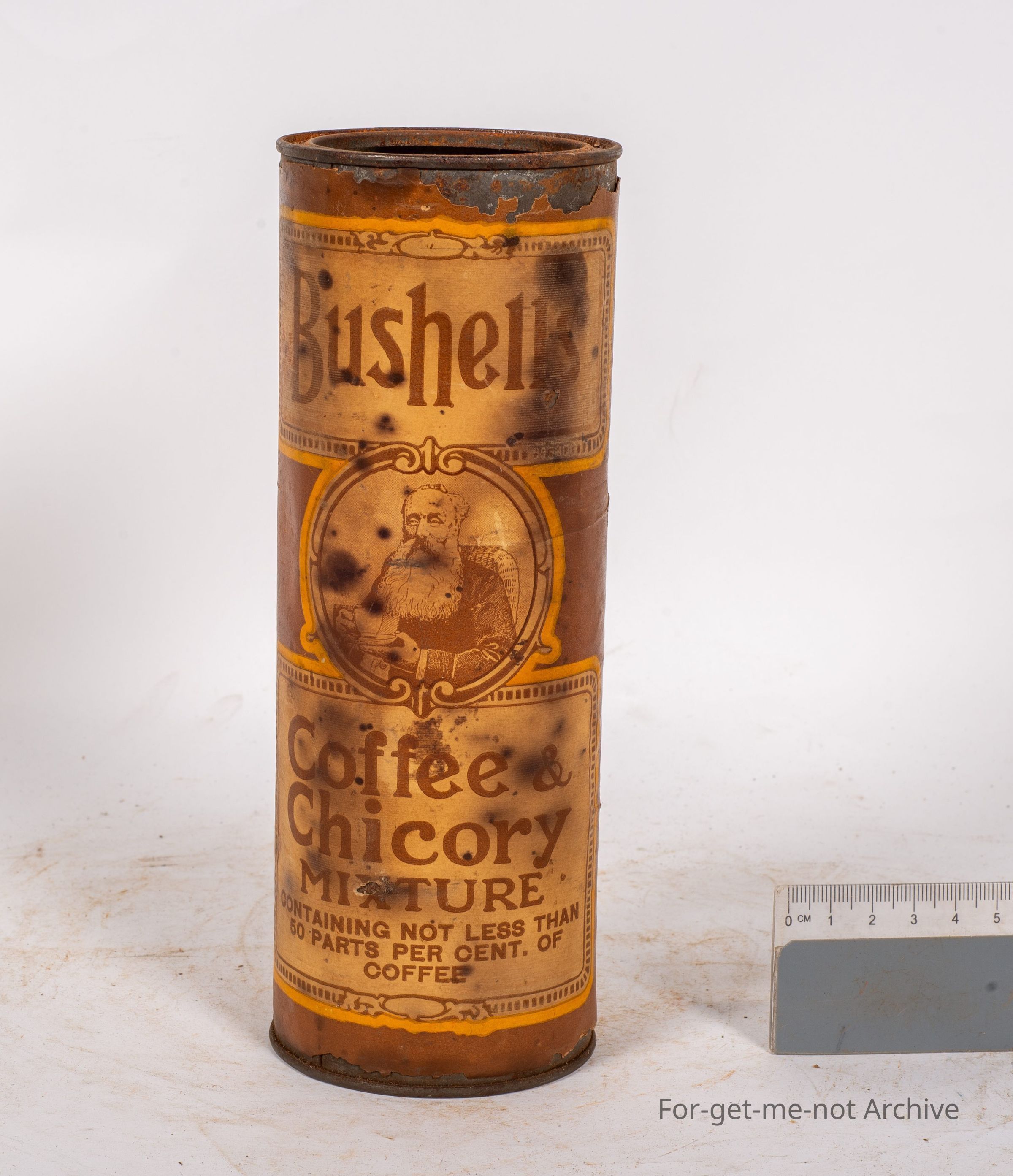 This is a cylindrical Bushels coffee and chicory mixture. This is a pretty old tin with the image of the old character with his beard. Not in brilliant condition, but very old. 16 ounce net weight,Collection
