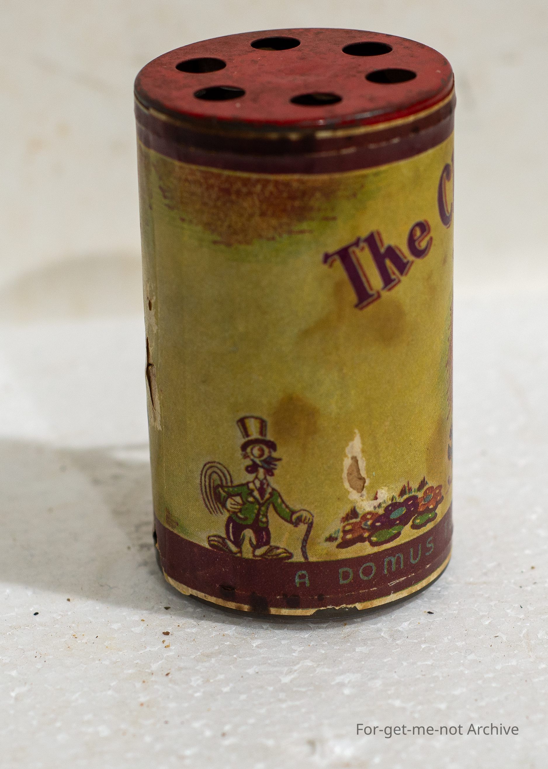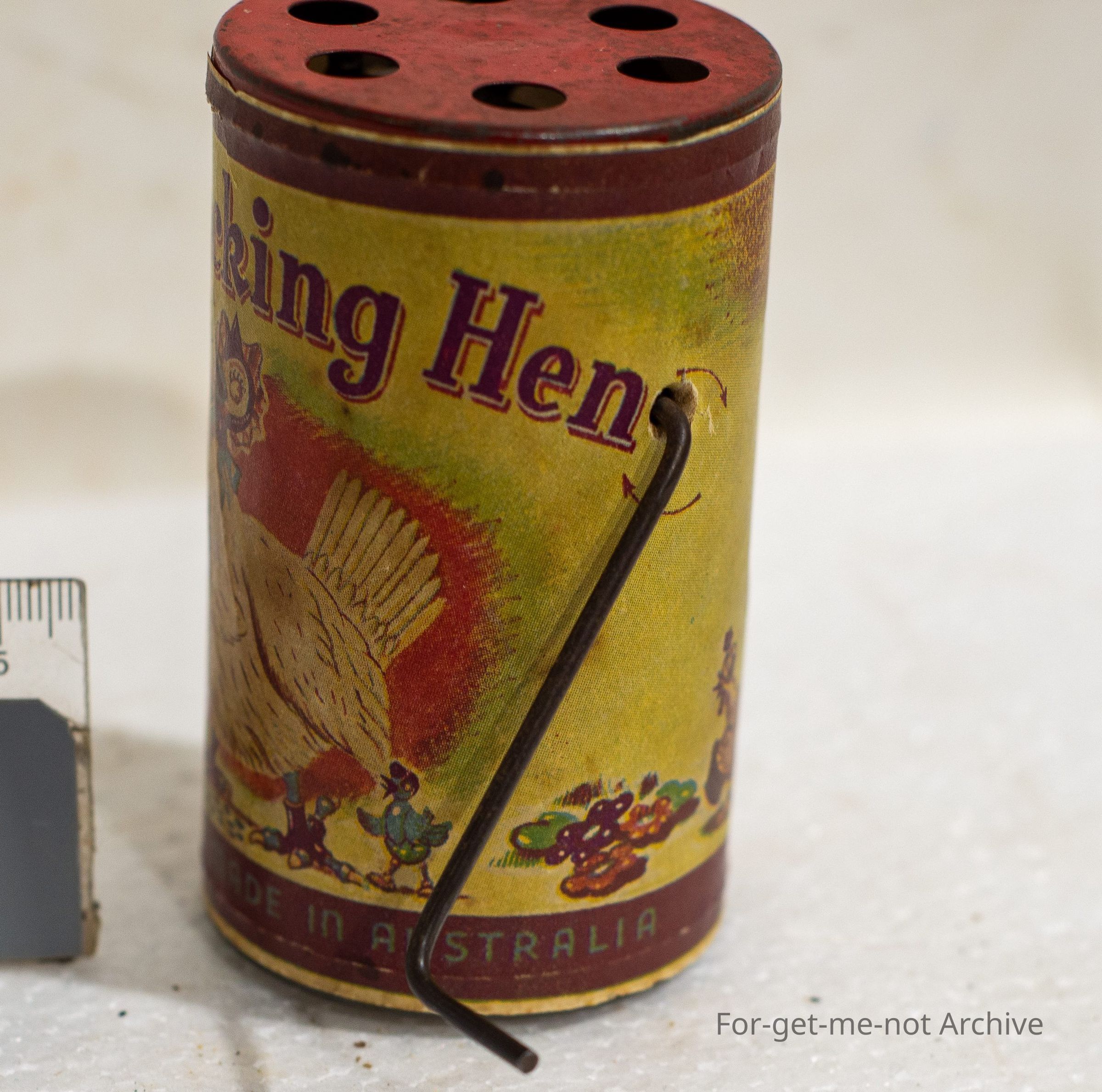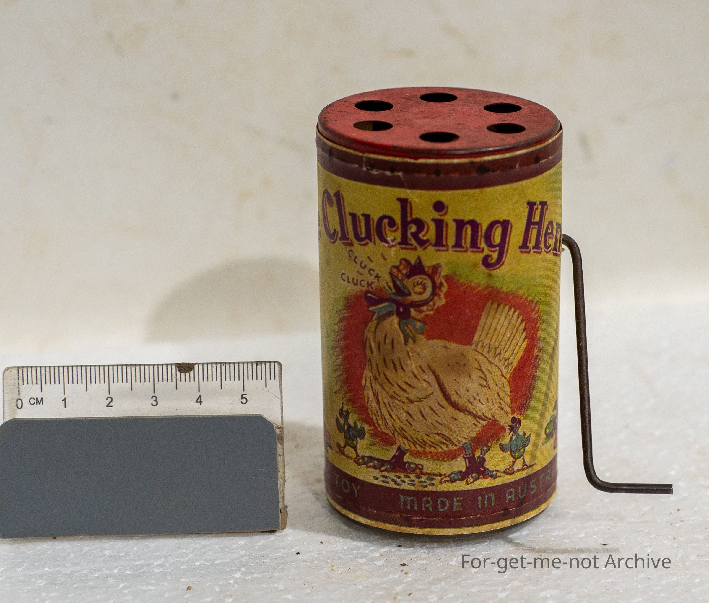 Small cylinder toy that has a crank handle to make the sound of a chook clucking. In working order, great condition for age and made in Australia by Domus Toys