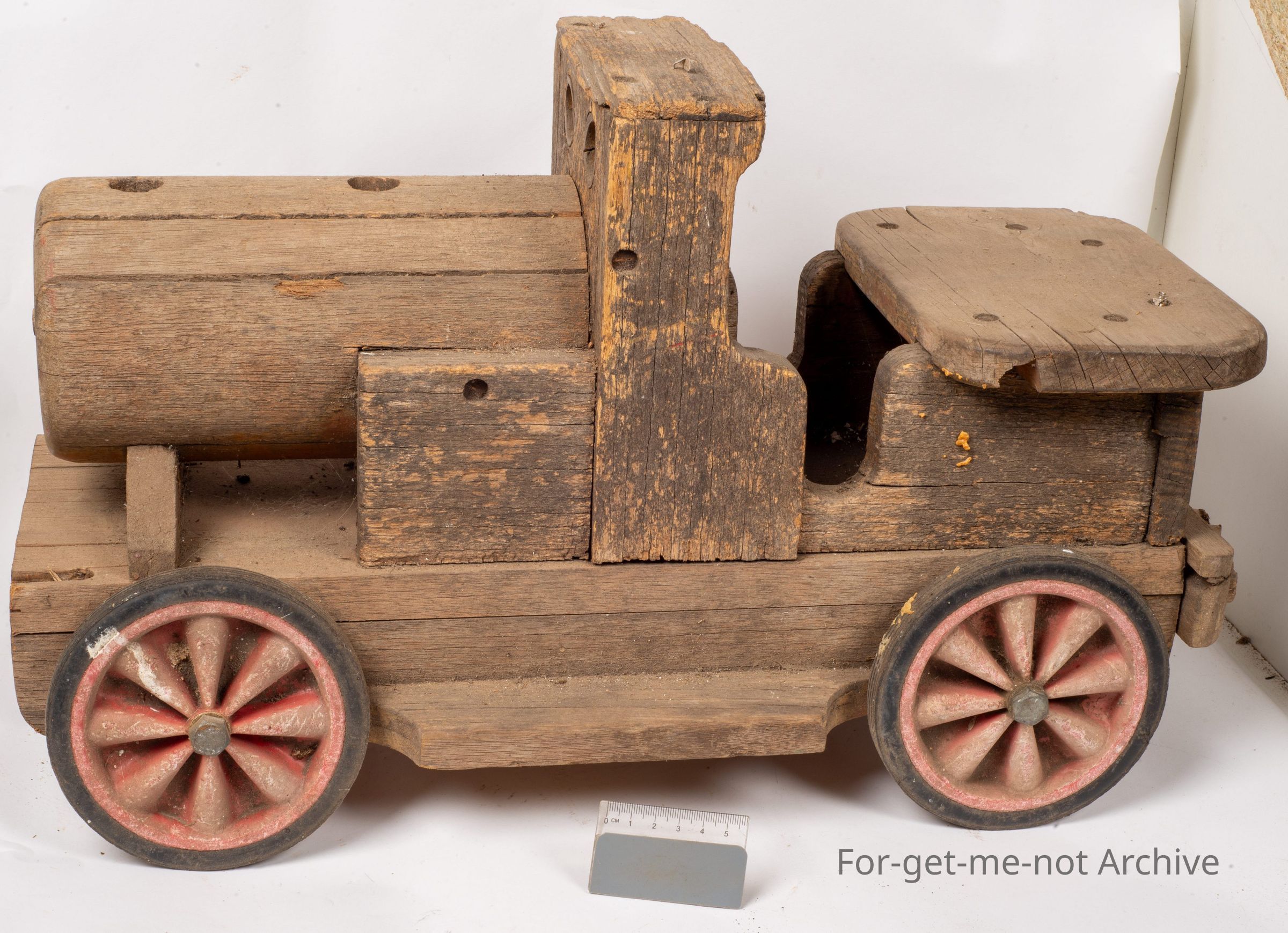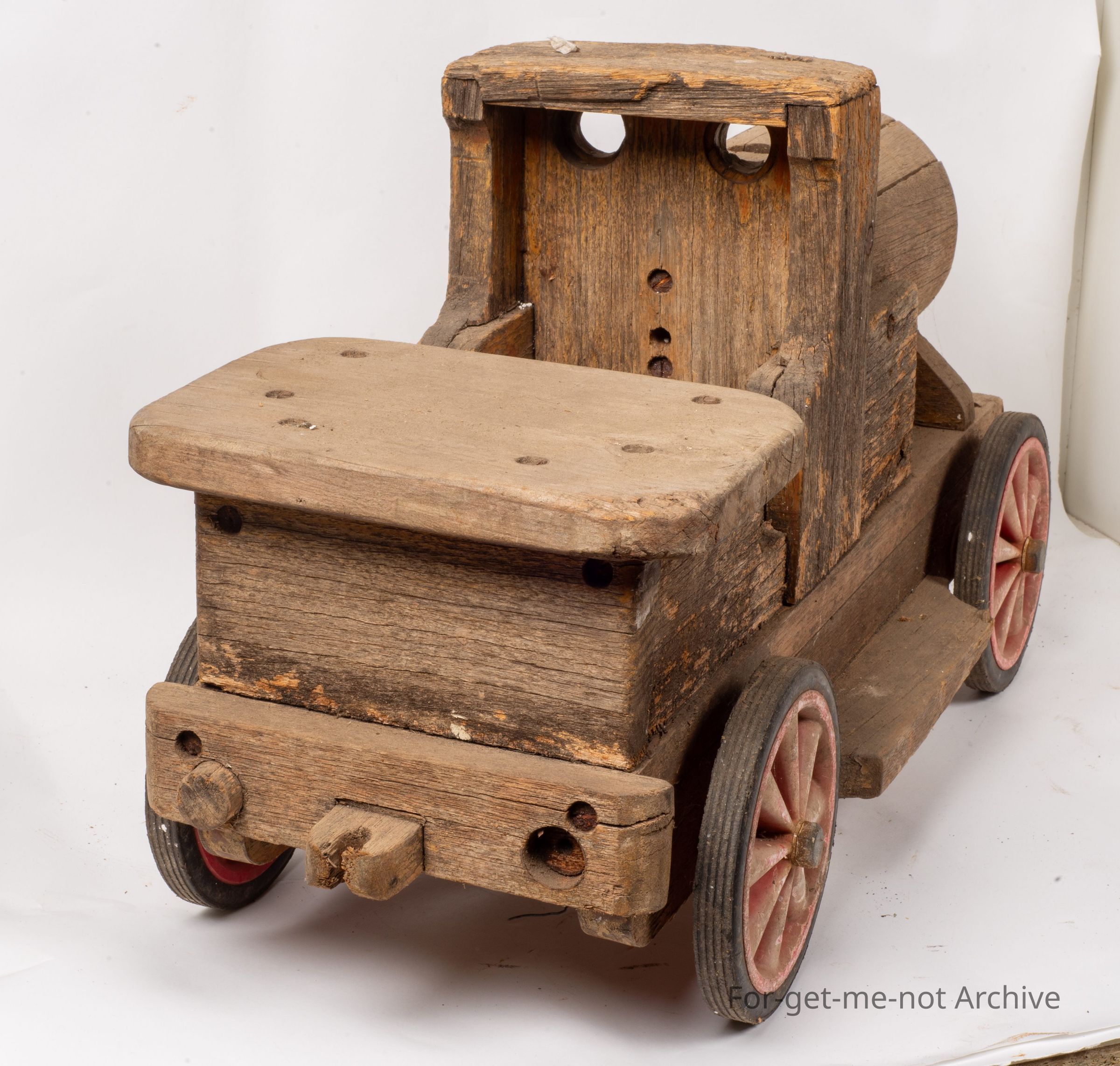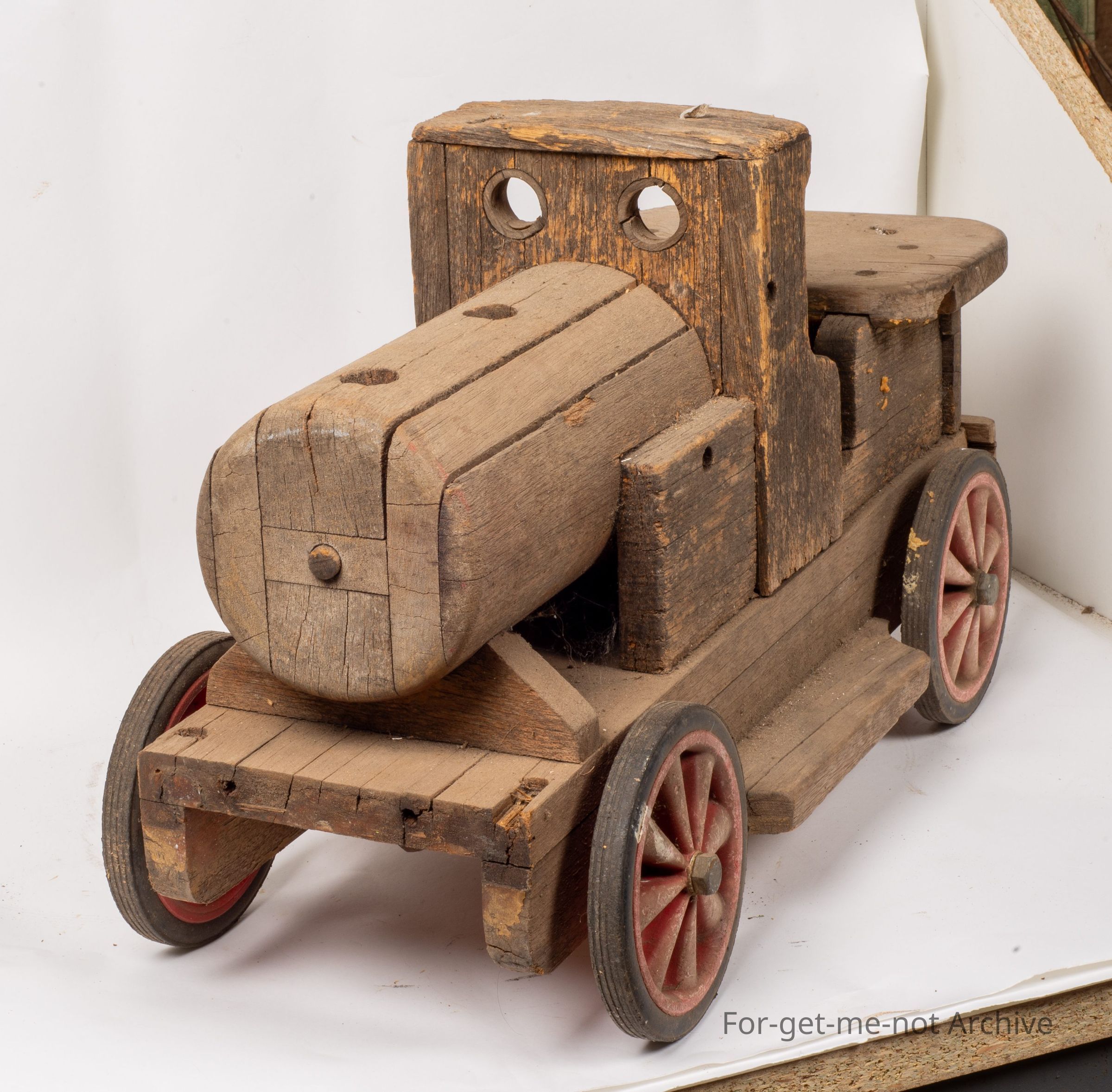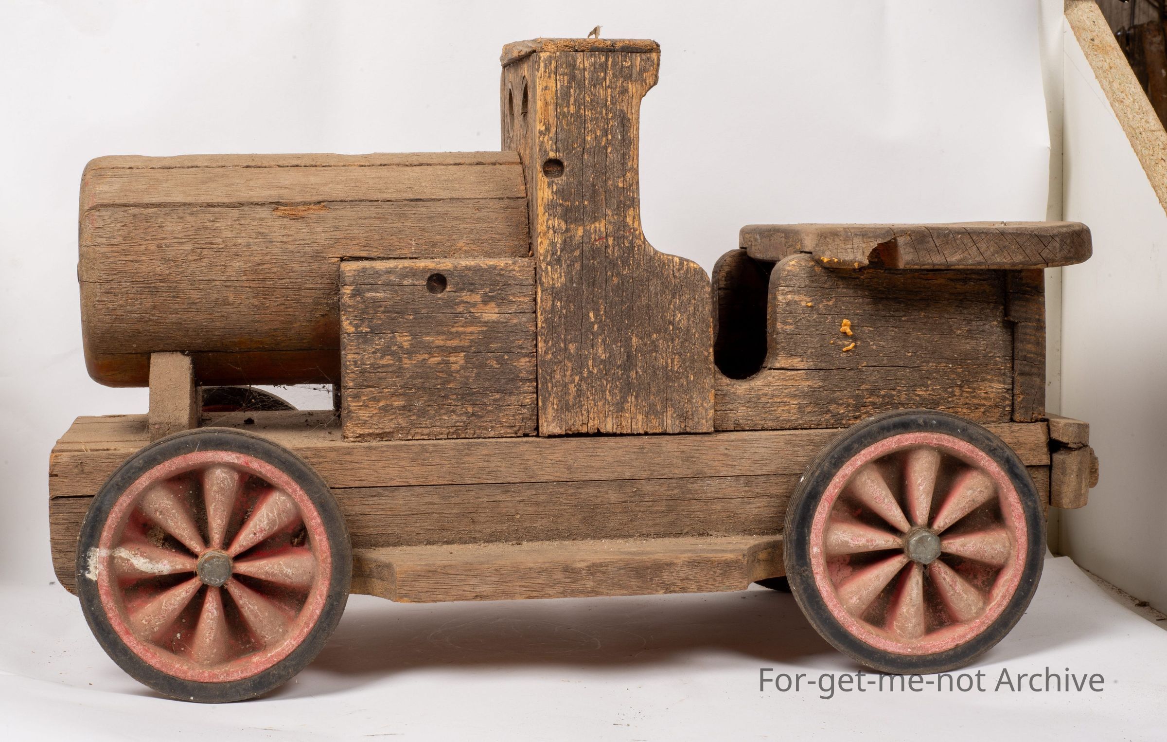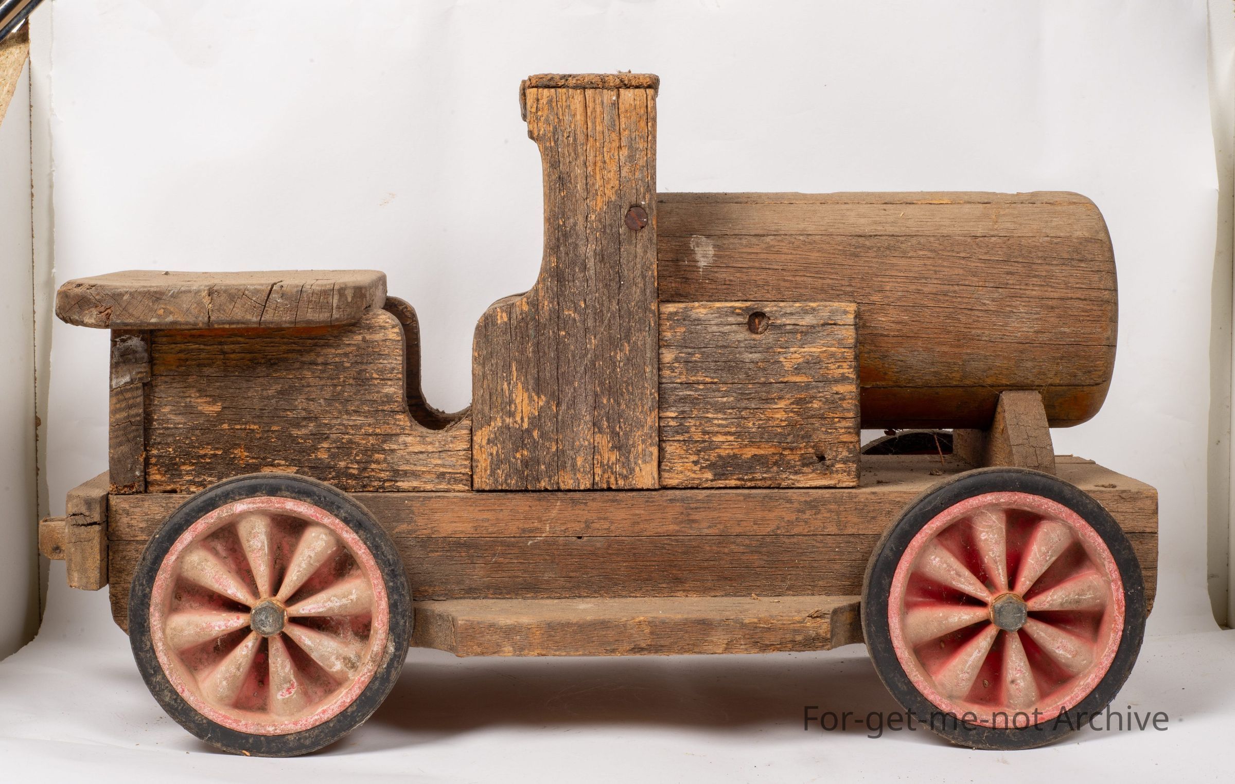 A Childs toy made from wood. Made from wood in the form of a train This gives the appearance that it's being left outside for some considerable period. A lot of work gone into it. There's actually plastic wheels that are possibly being put up, put on a lot later. But still an interesting improvised piece from the twenties thirties.Collection