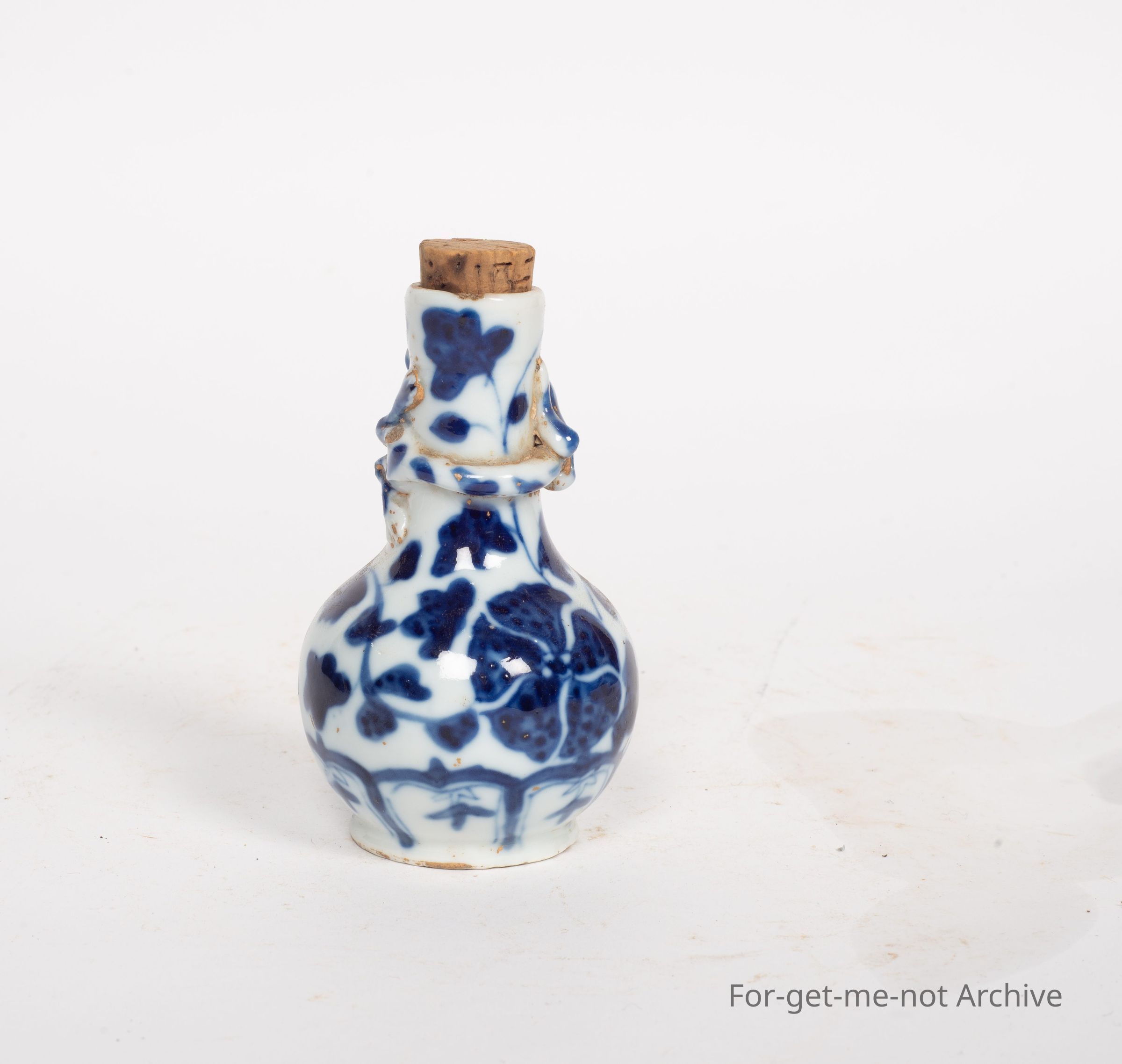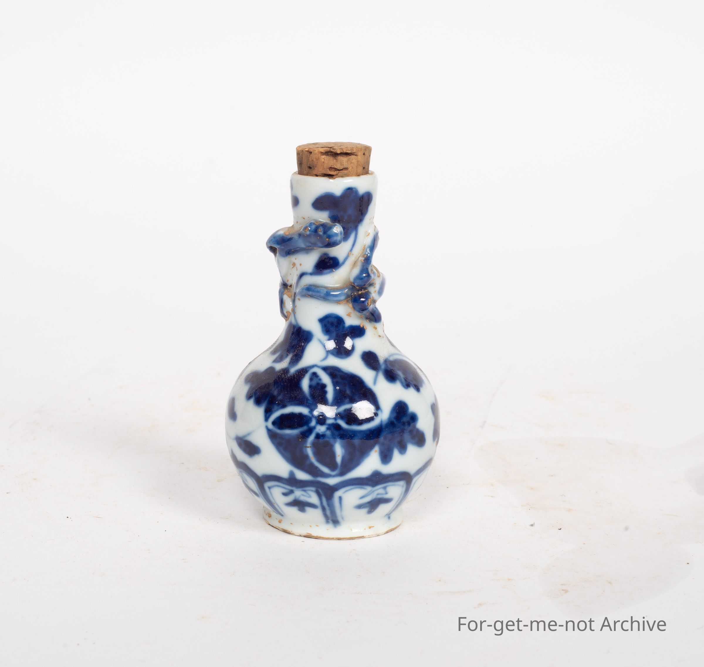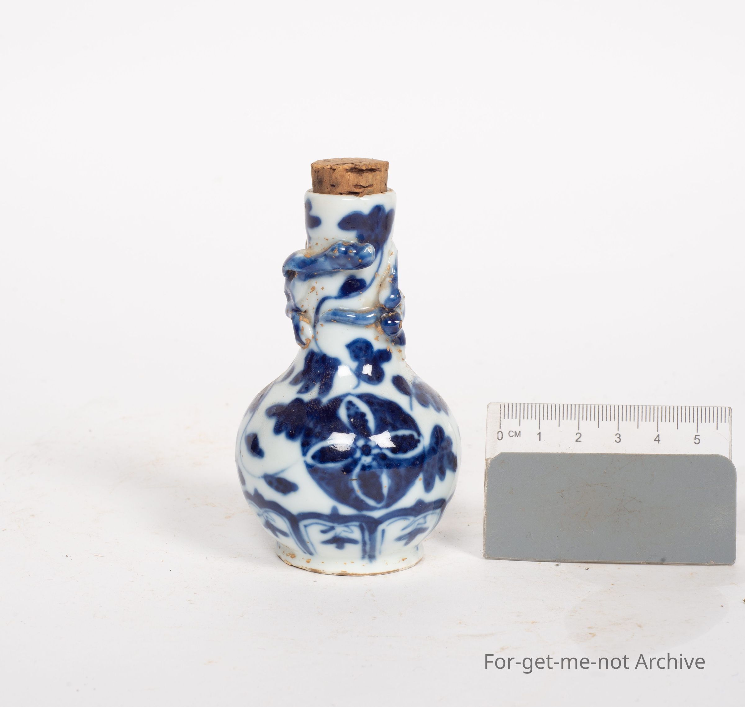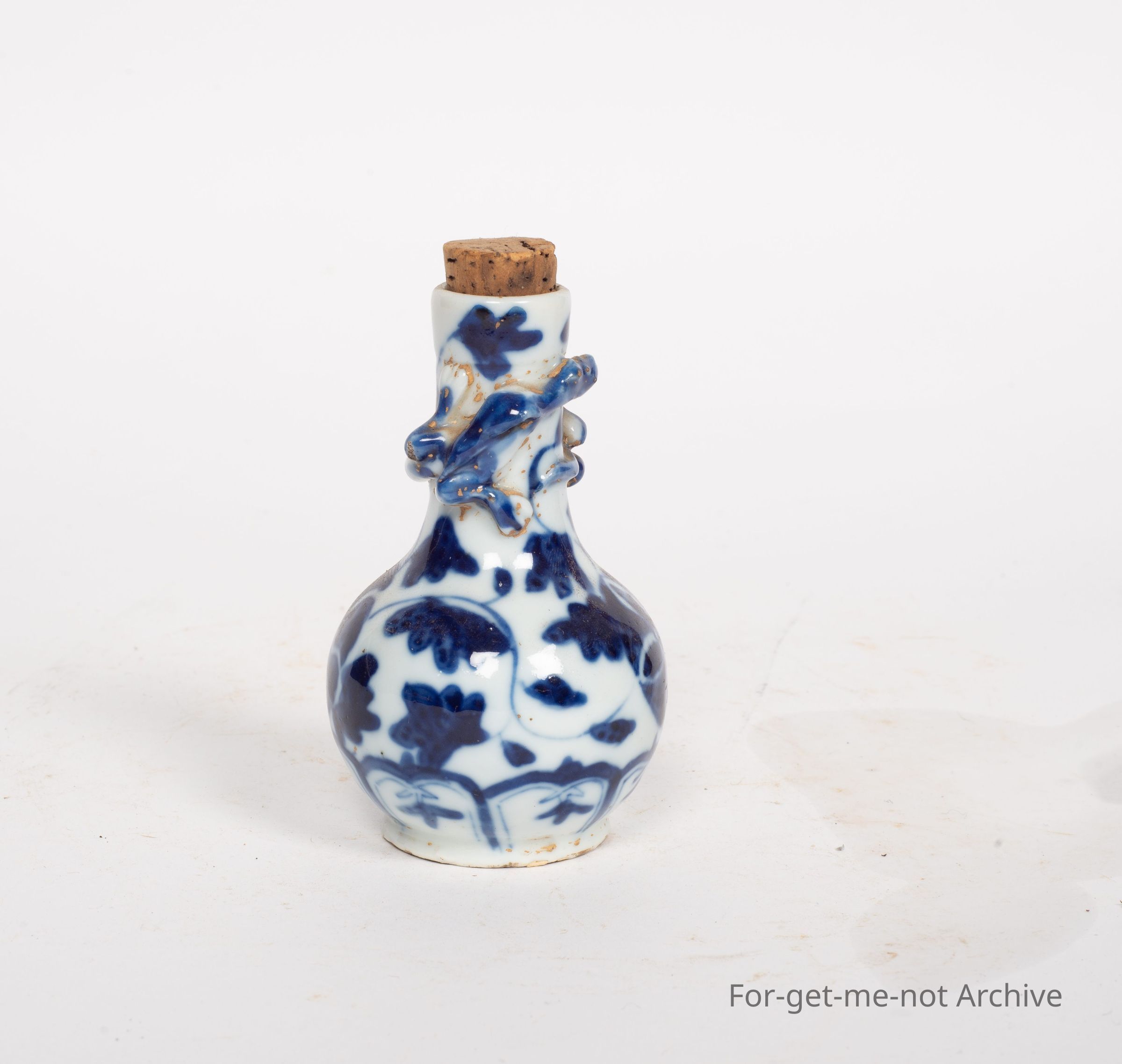 Is a small long neck jar, with a frog like, dragon wrapped around the neck, blue and white glaze, quite an intricate little bottle.