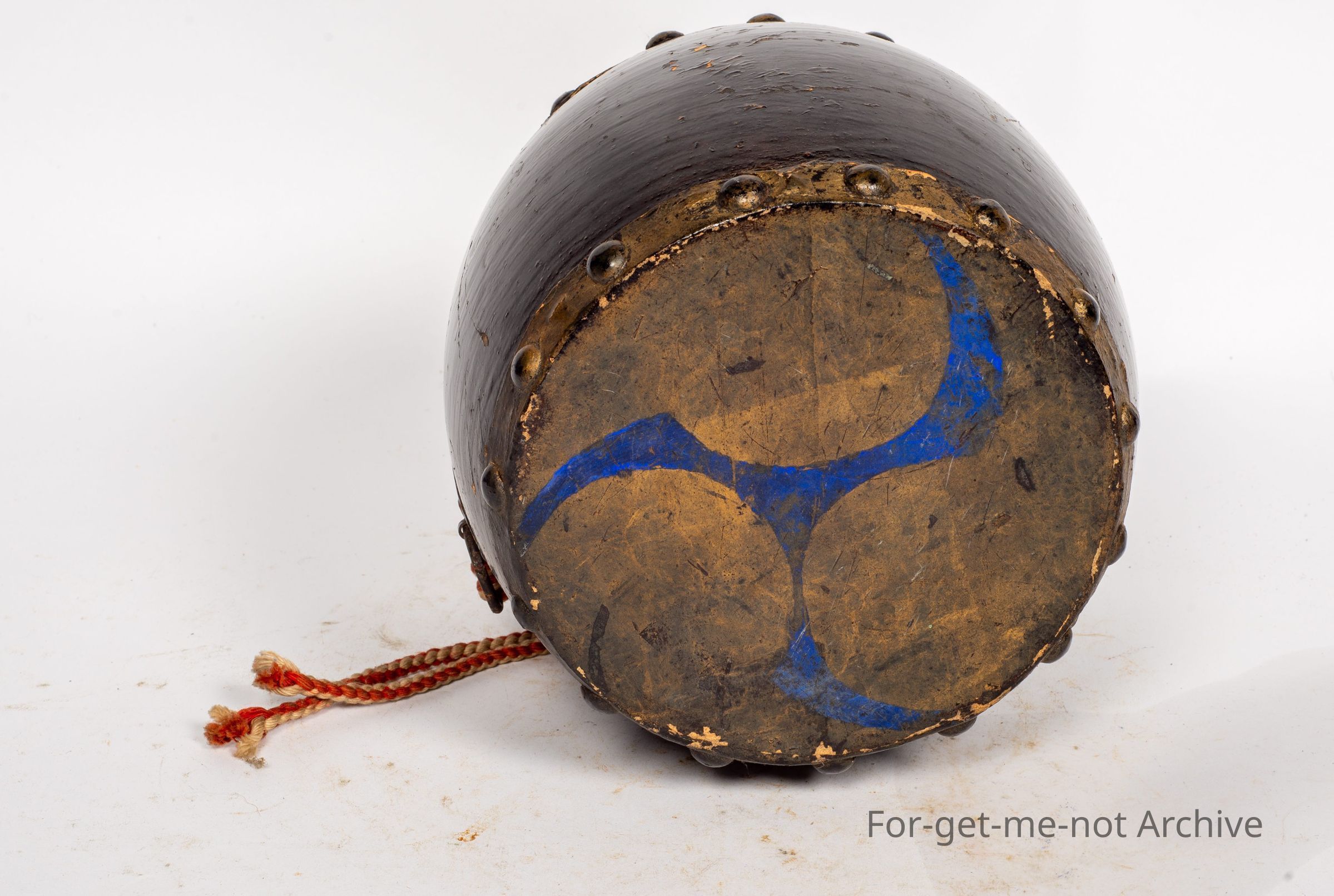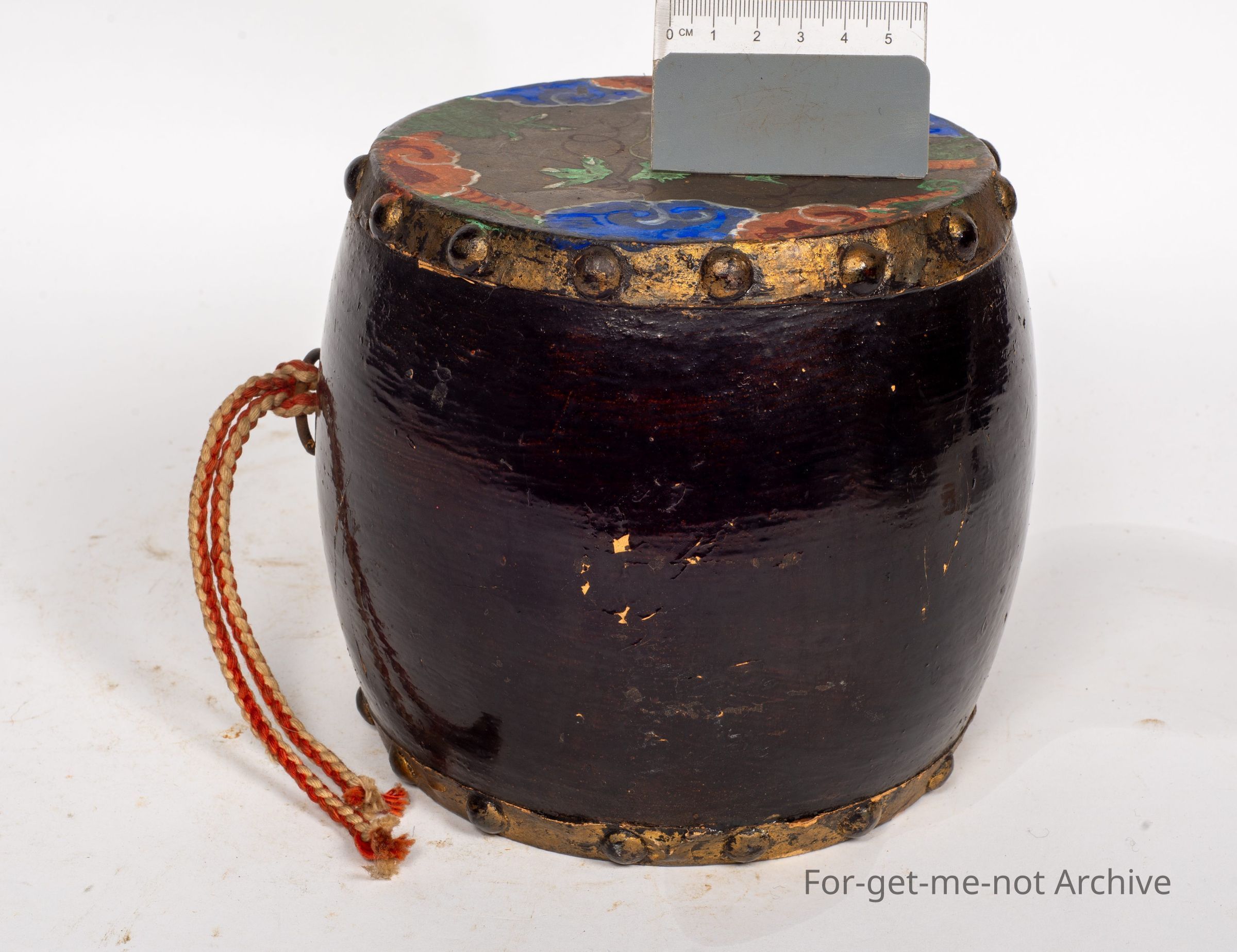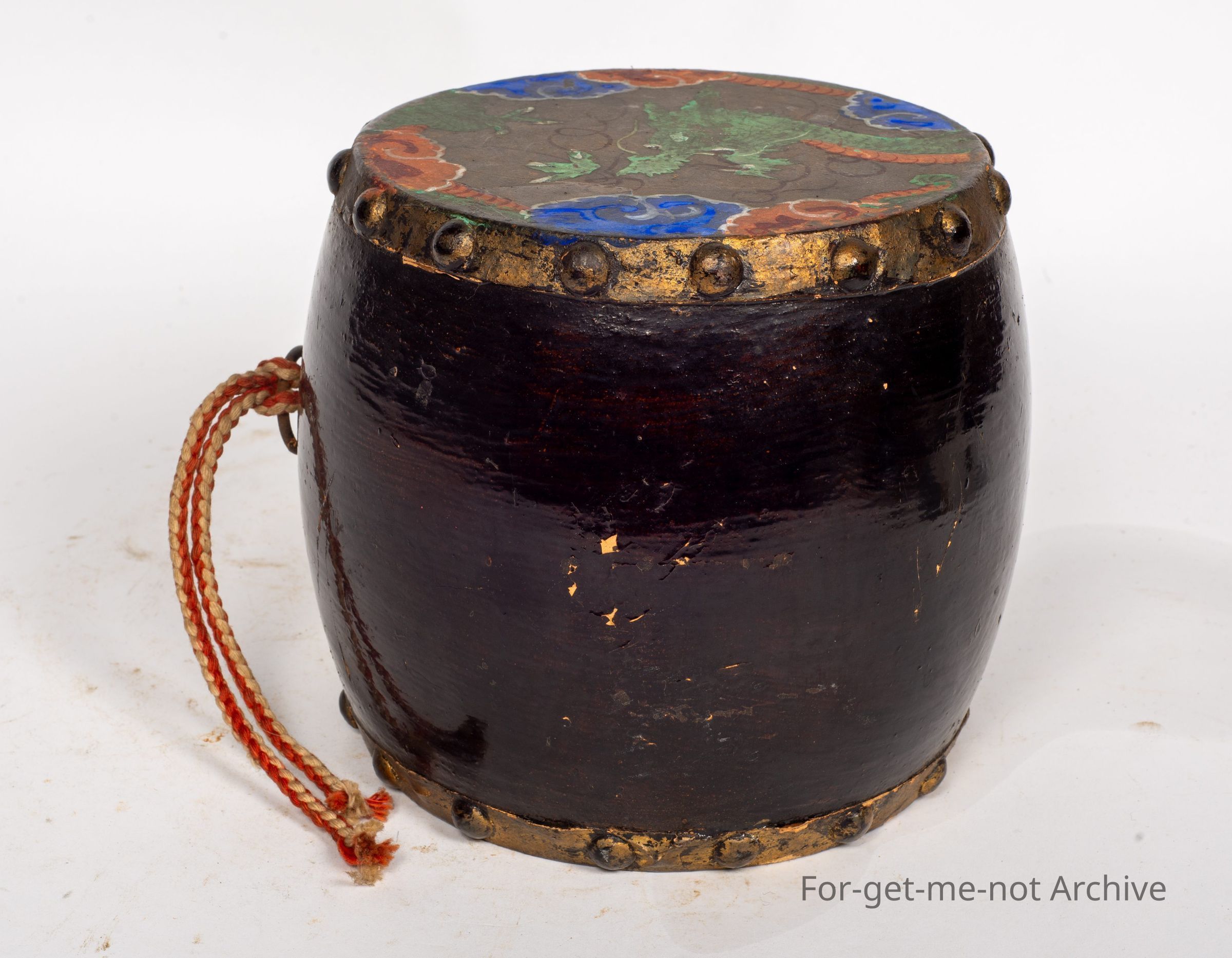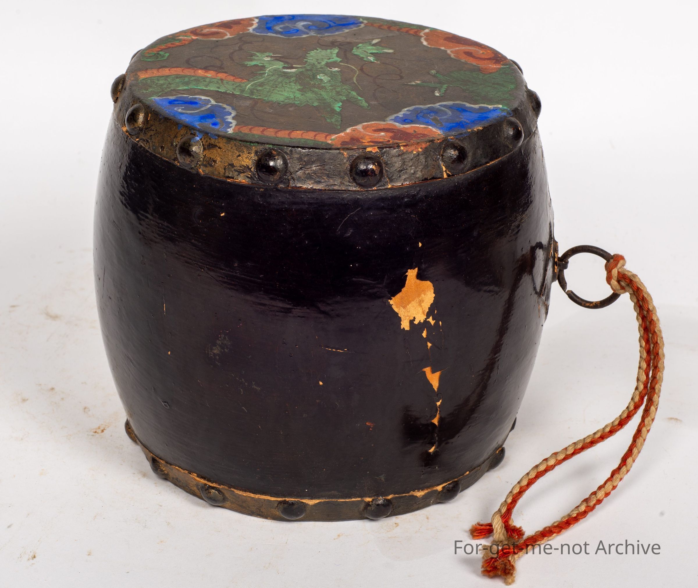 Is another Chinese drum. This one is considered to be quite authentic. A larger size with a, fitting on the side, where it could be hung and played with the hands. Hand painted on both pigskin surfaces. The middle is in very good order.Collection