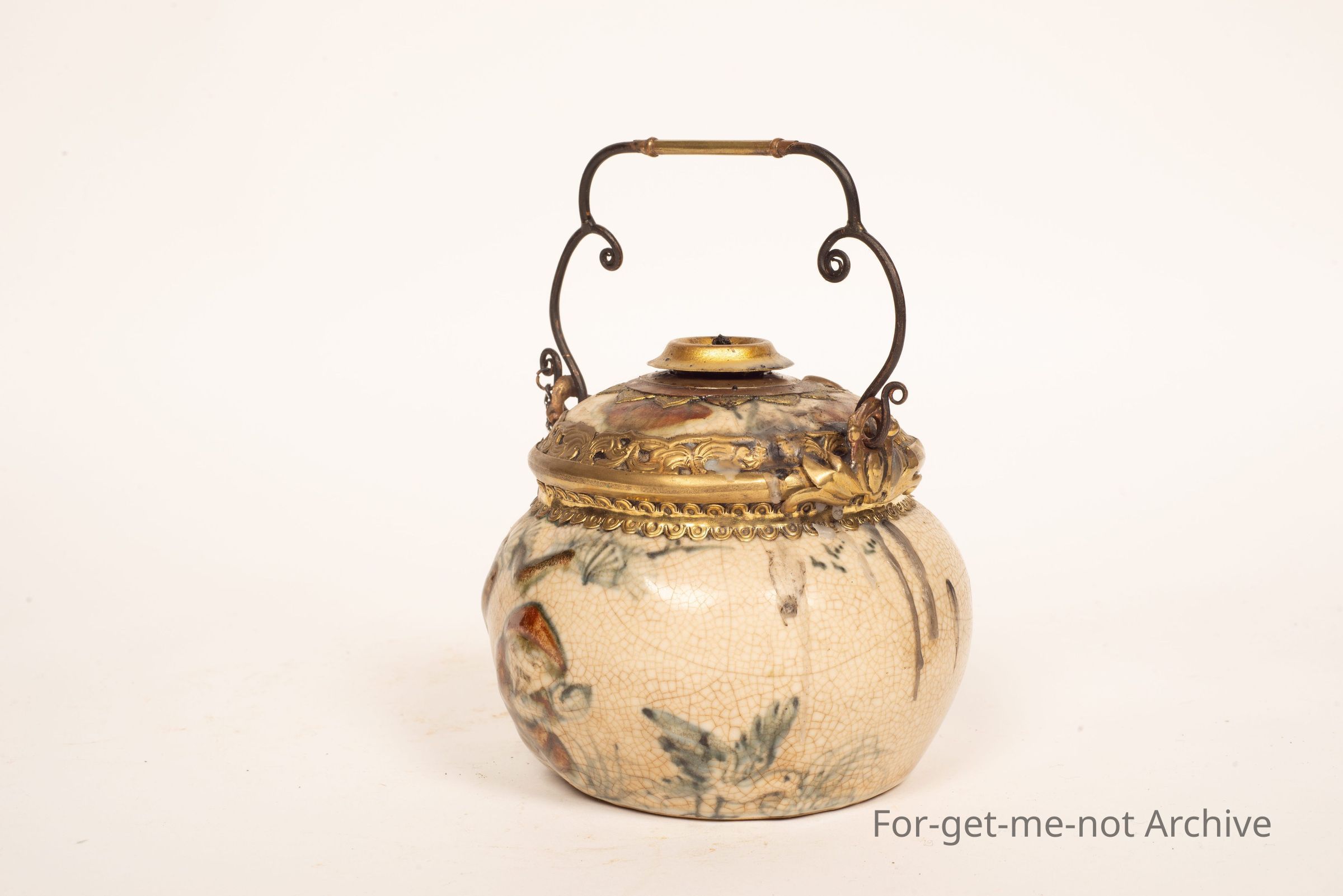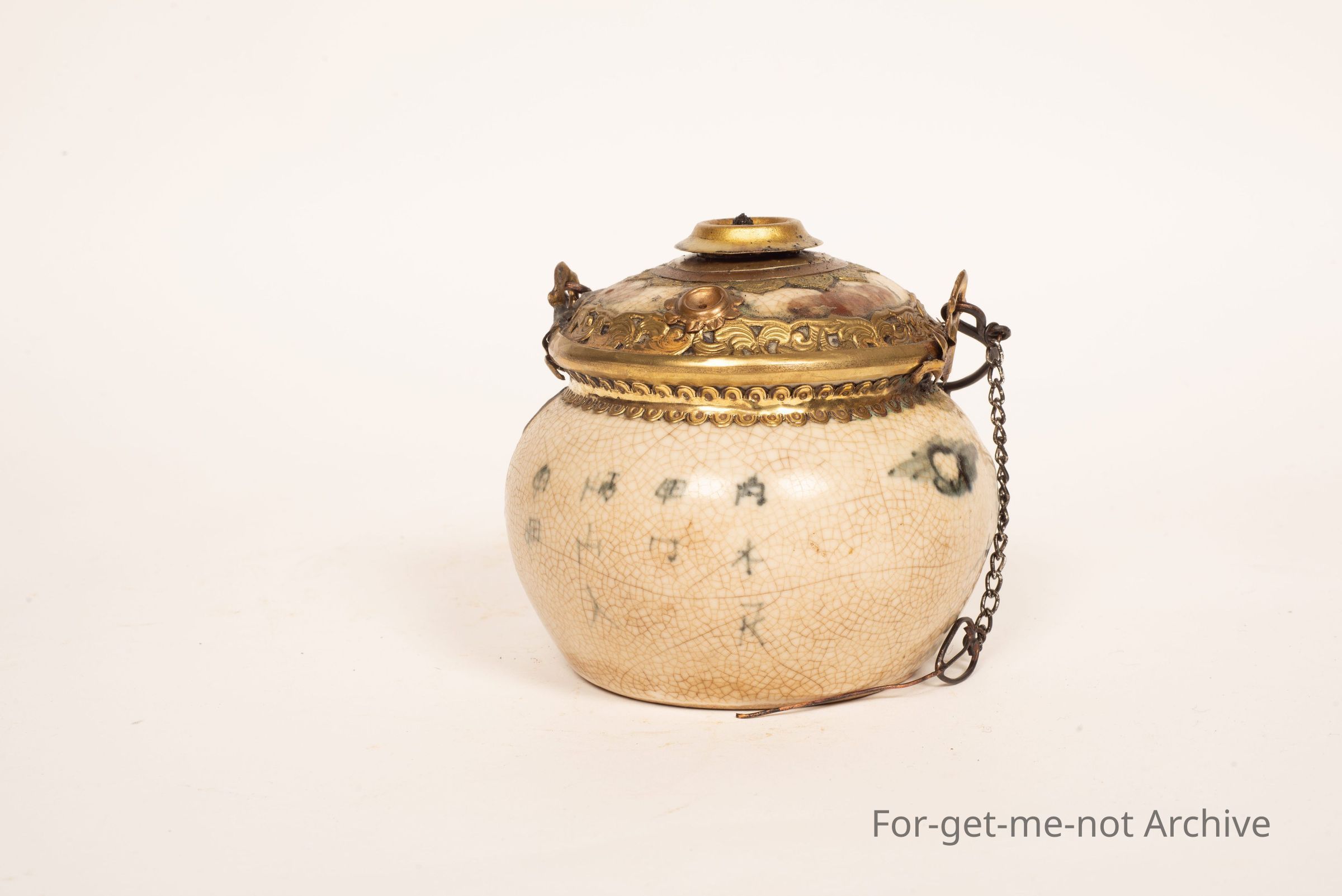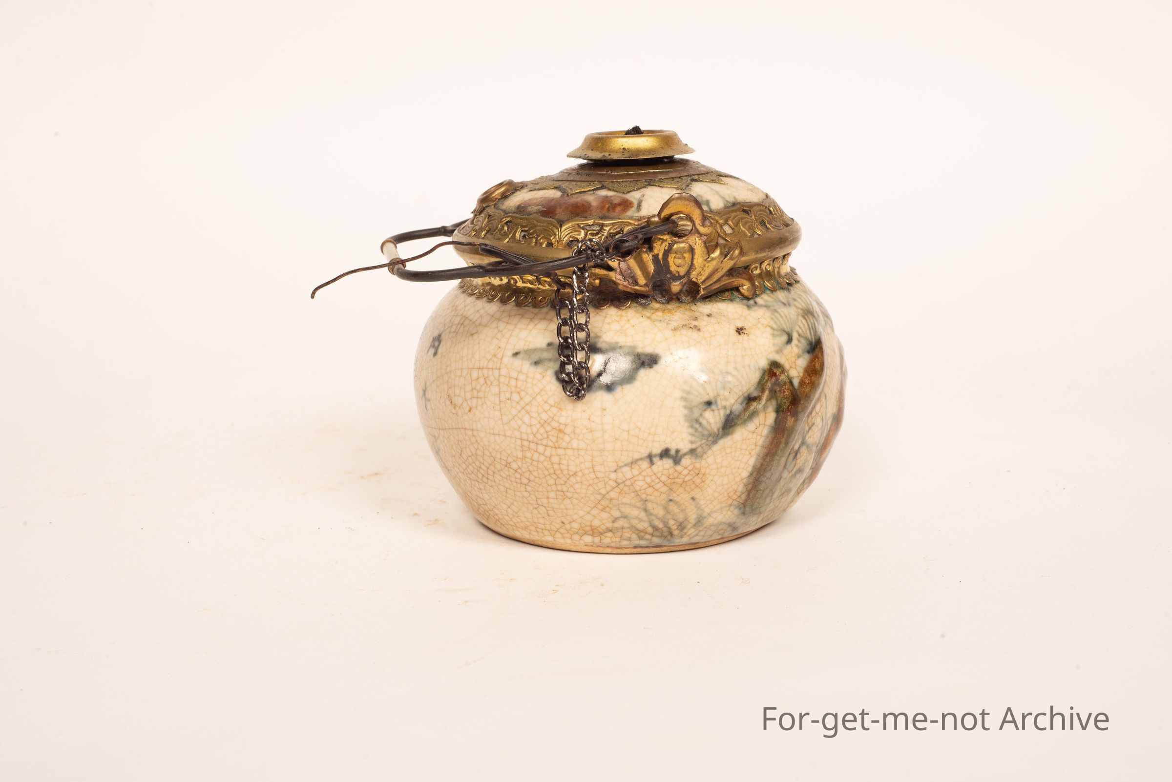 This is a ceramic front on a Chinese oil lamp. It's got a chain for the pricker, a little handle, still with the wick. I have lit this. It does work,