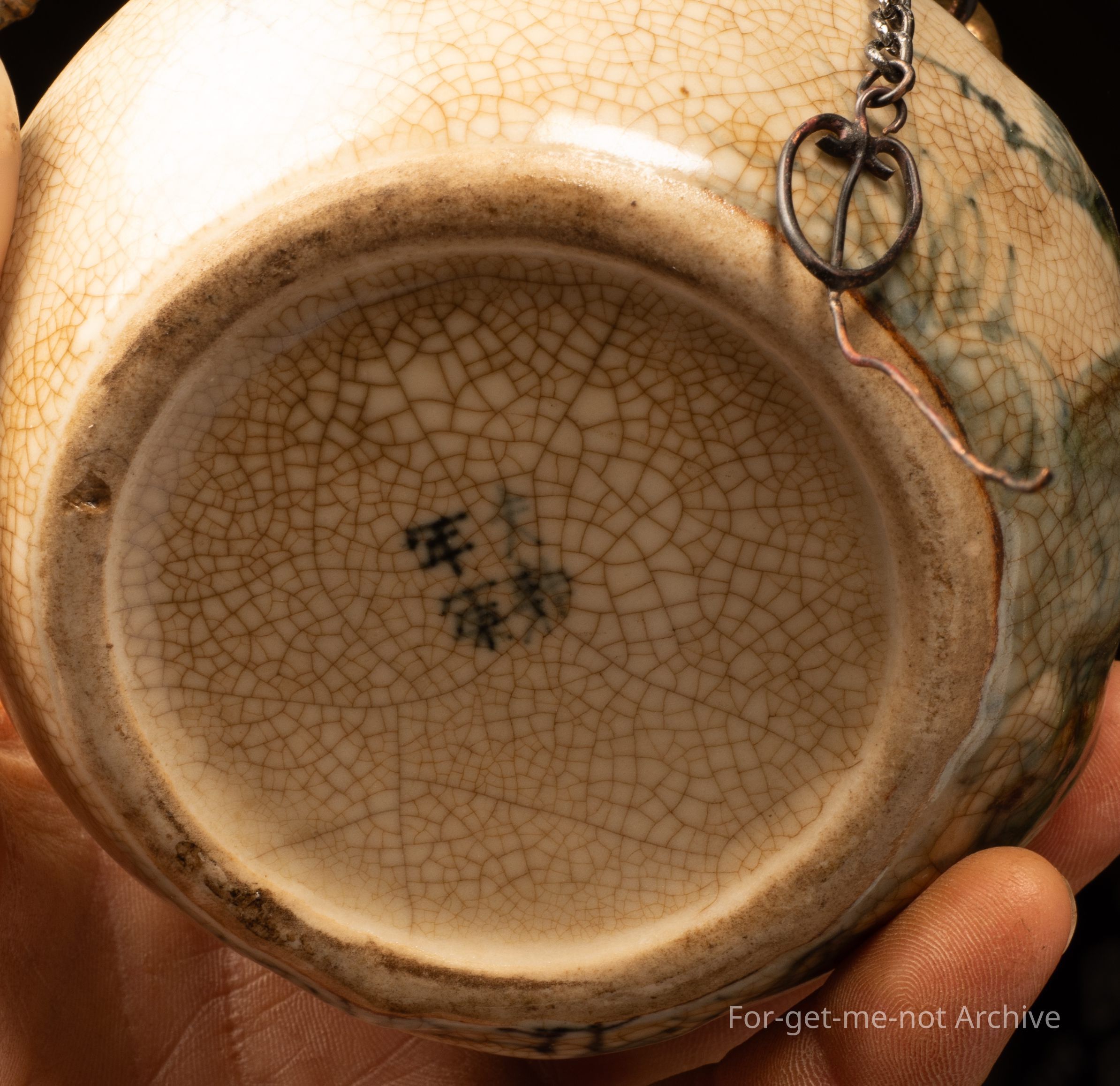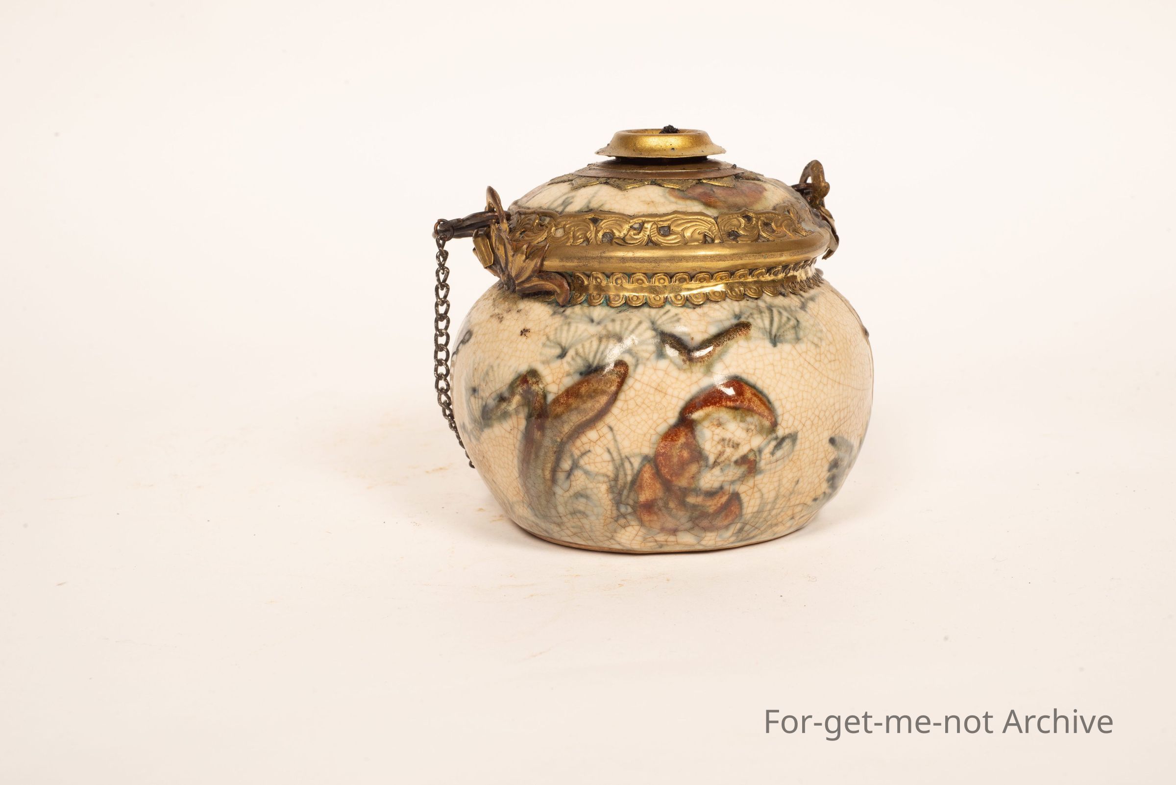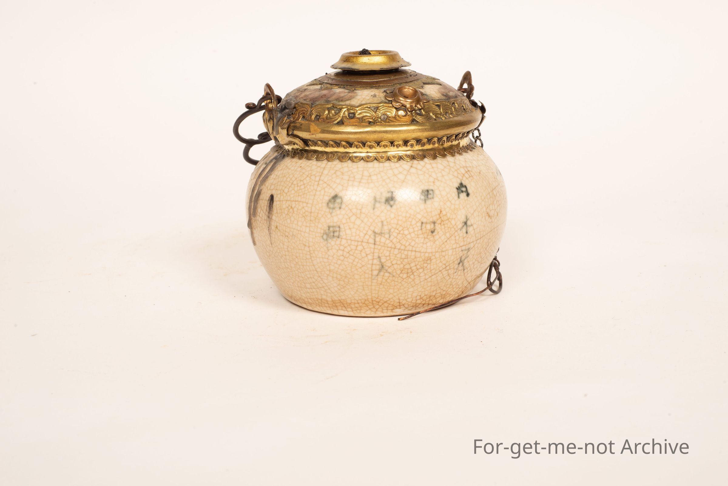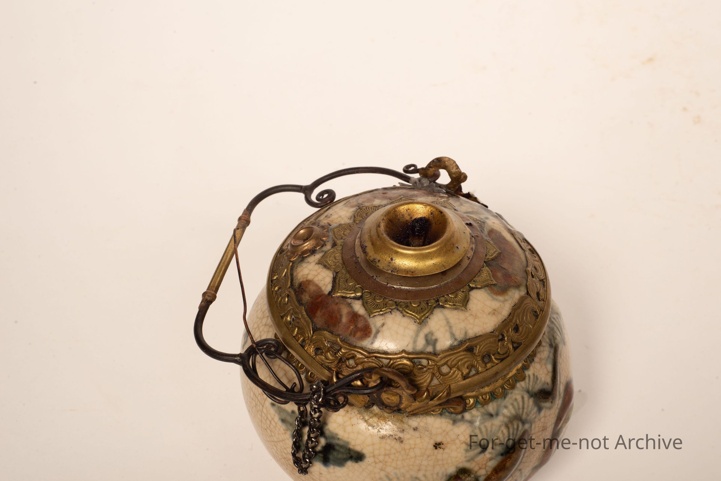 This is a ceramic front on a Chinese oil lamp. It's got a chain for the pricker, a little handle, still with the wick. I have lit this. It does work,