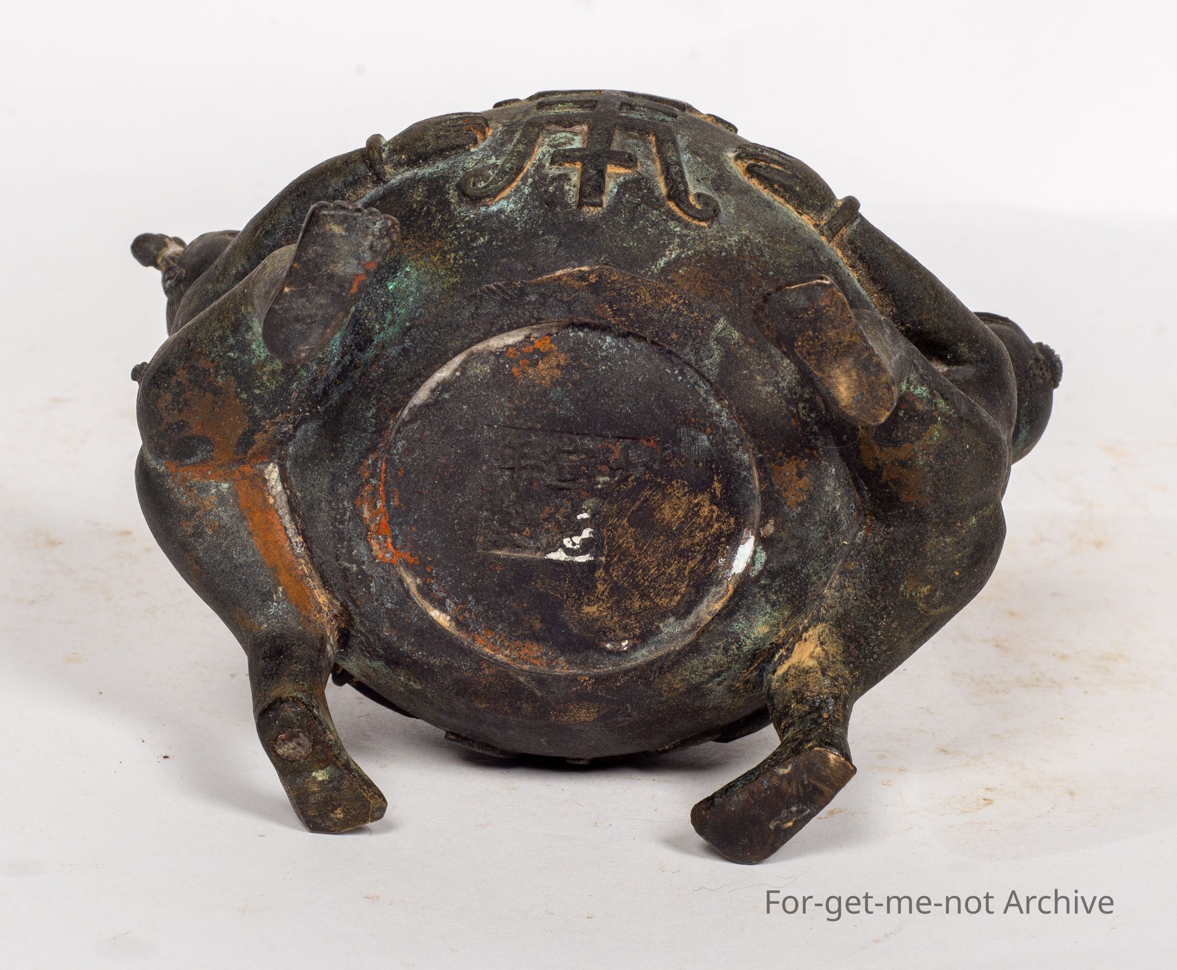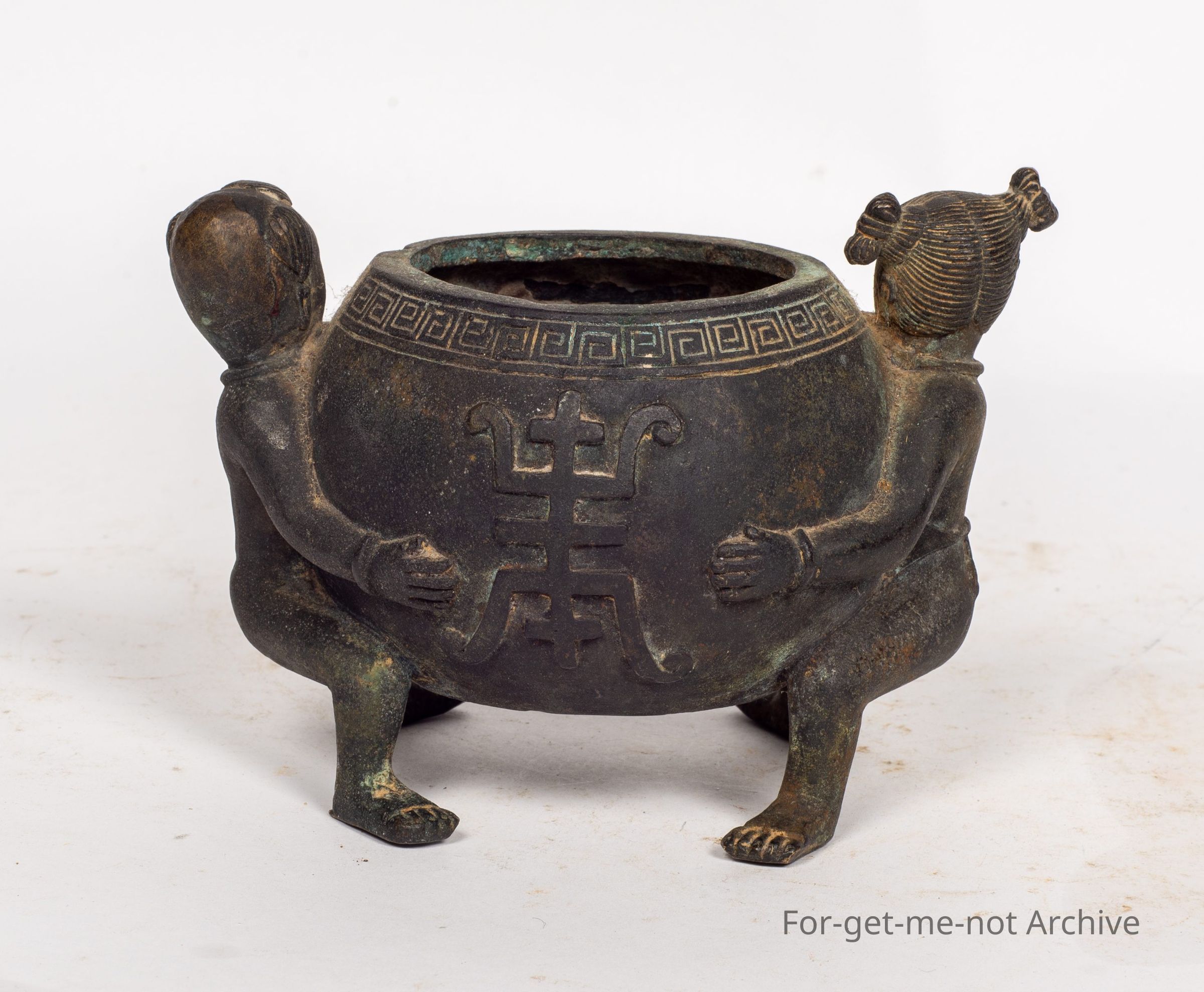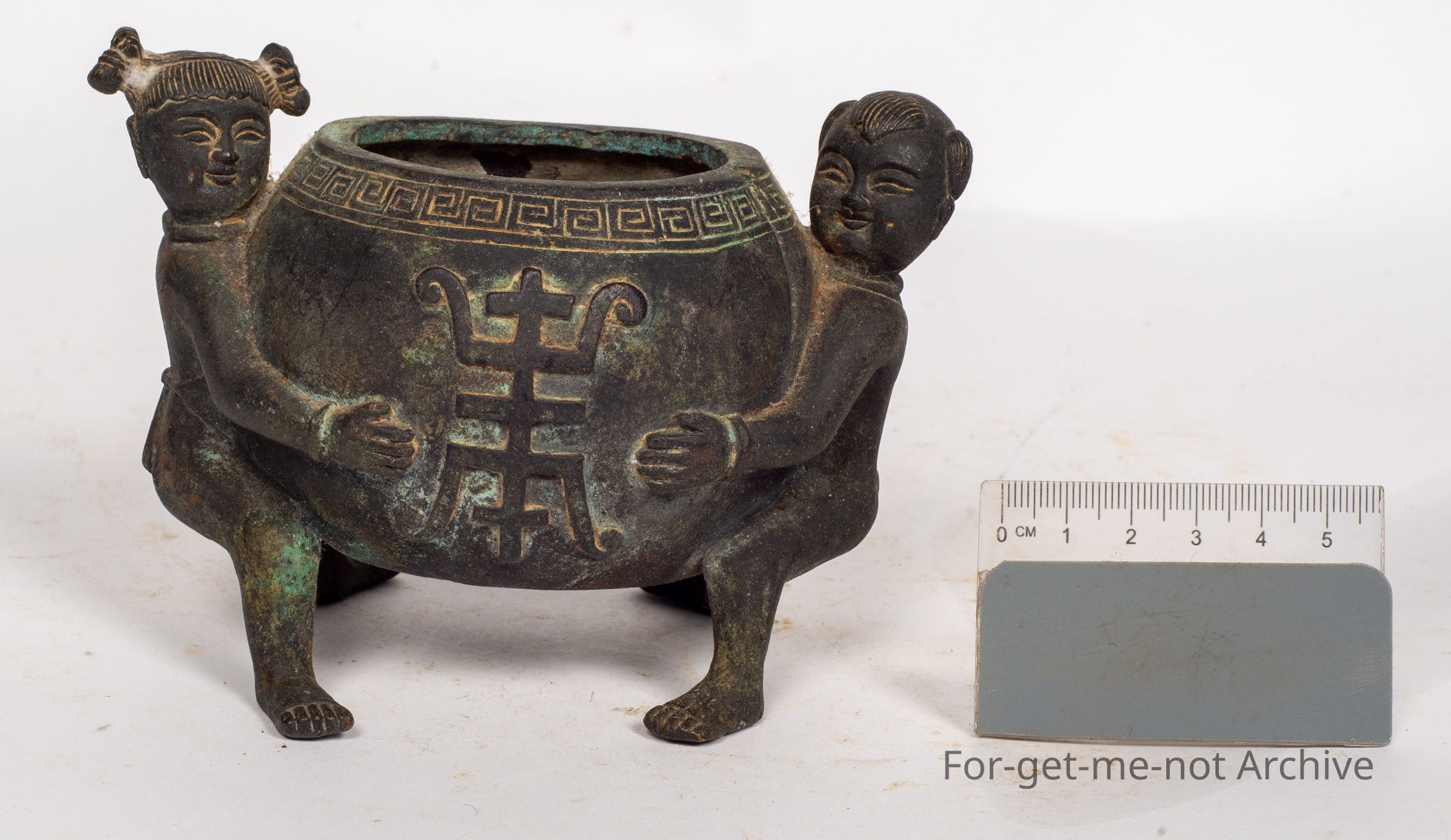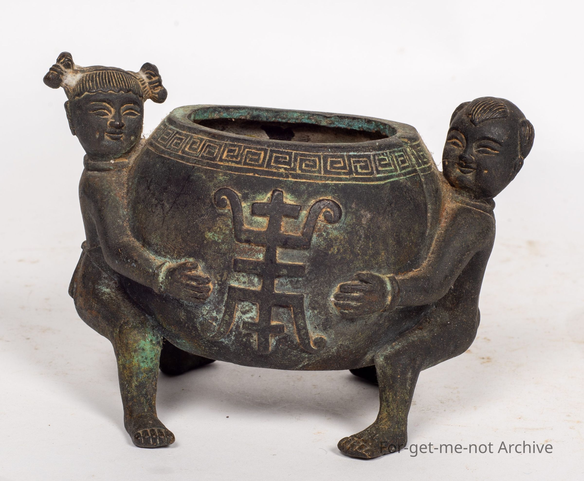 is a Chinese pot, with a figure either side. 1 of a girl, 1 of a boy. This prop is stamped on the base and believed to be 800 years old. It is minus its lid