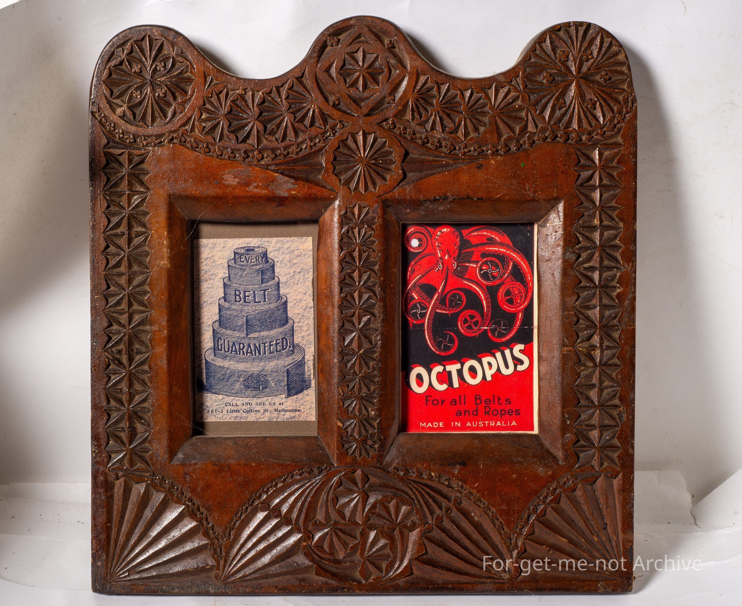 This is framed advertising in a trampart in a chip craft frame. Very decorative. Description, beautiful wooden Chipcraft Frame. An advertising piece on one side for Octopus, Belting and the other one is for Guaranteed Belting for Machinery. Both unusual pieces and original. They're not copies.Collection