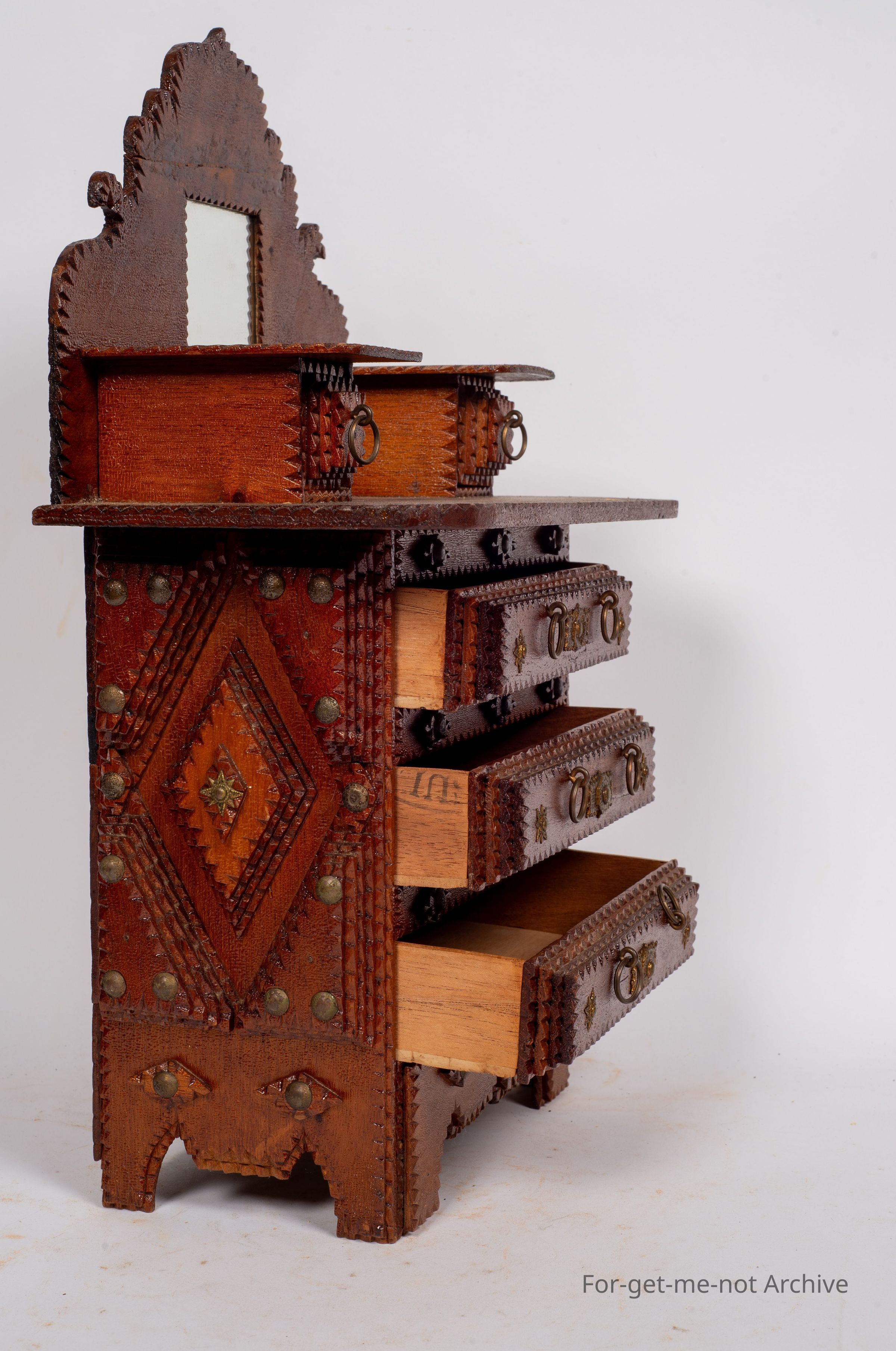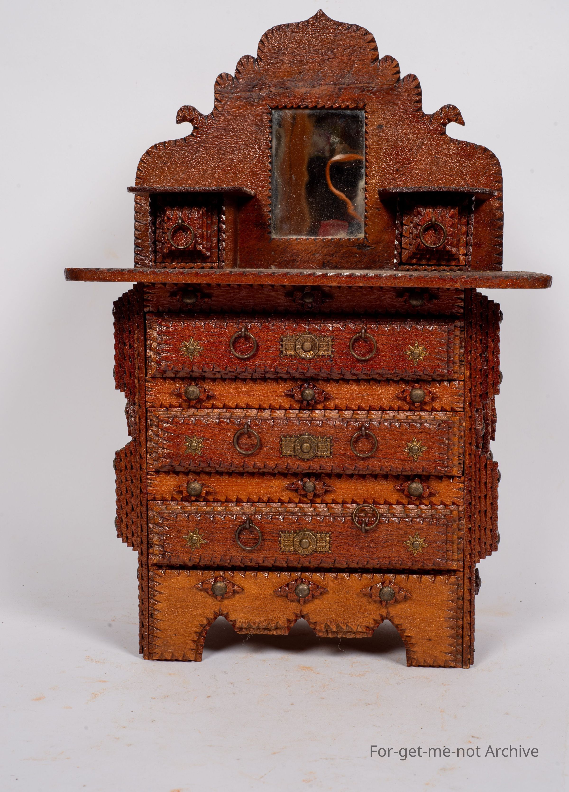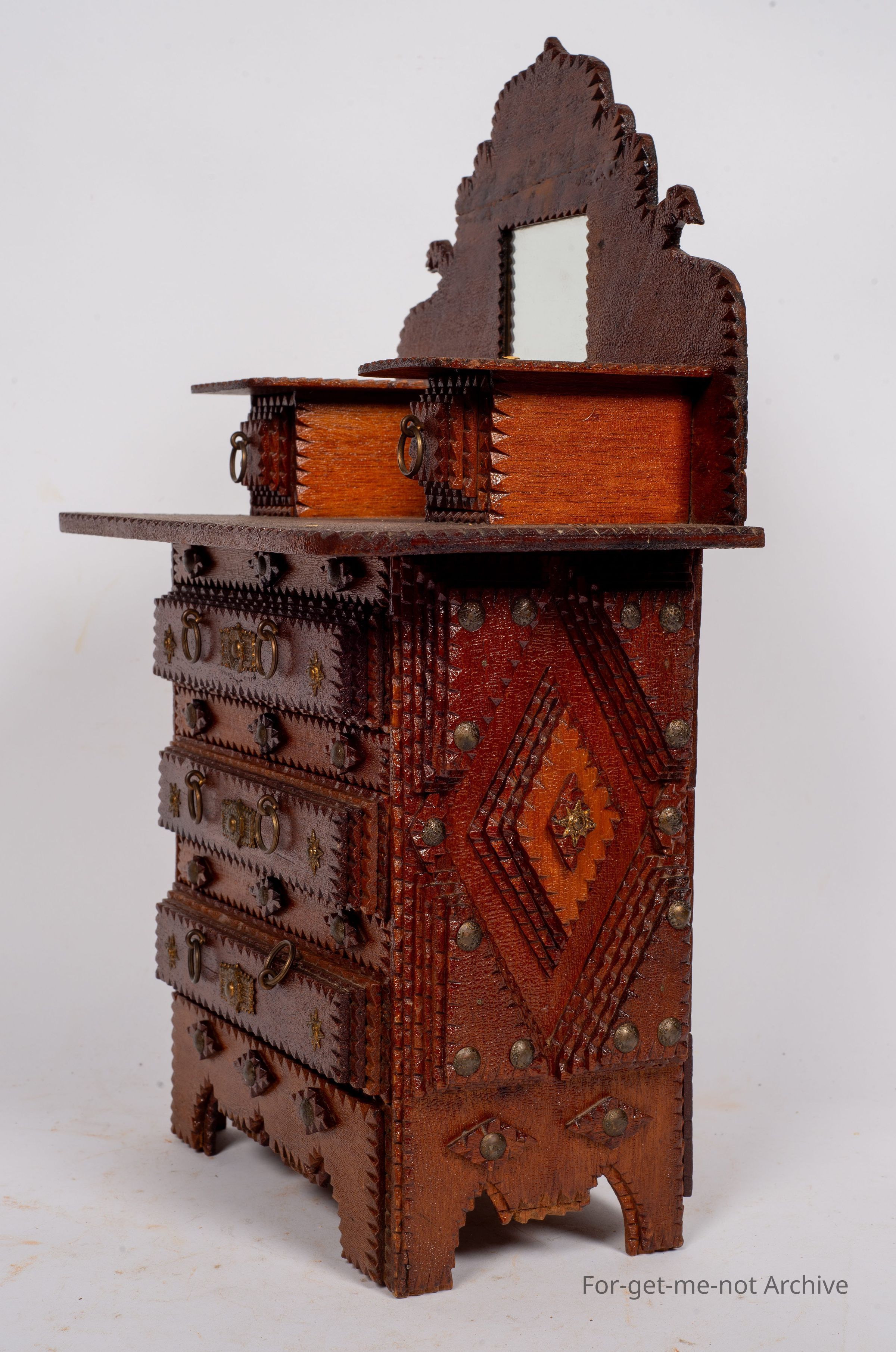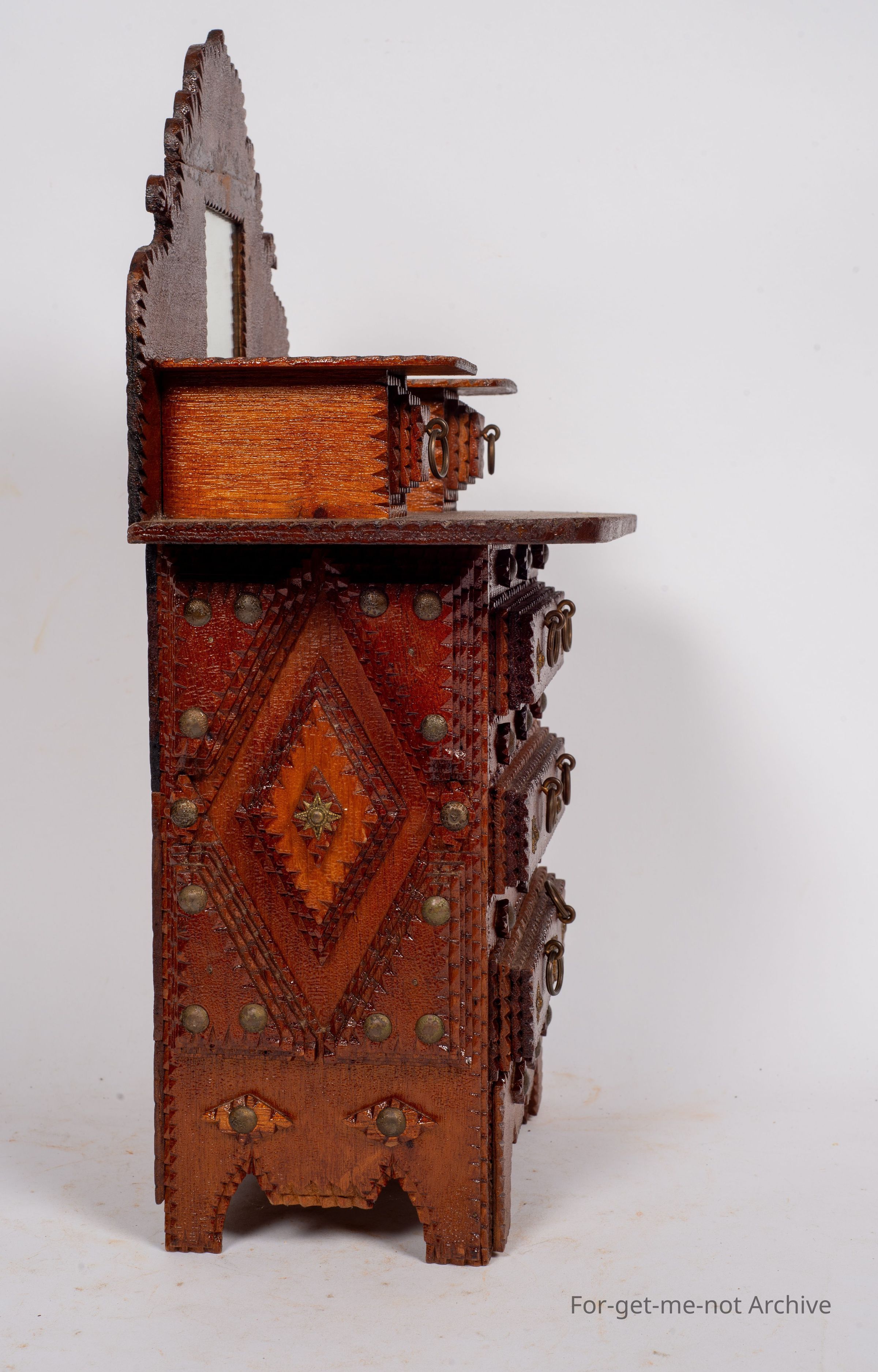 Chip craft dresser. This one has 3 drawers that go across at the base with 2 small ones at the top. This also has a backing board with a mirror. This is all in beautiful condition. A lot of work in it. This one wouldCollection