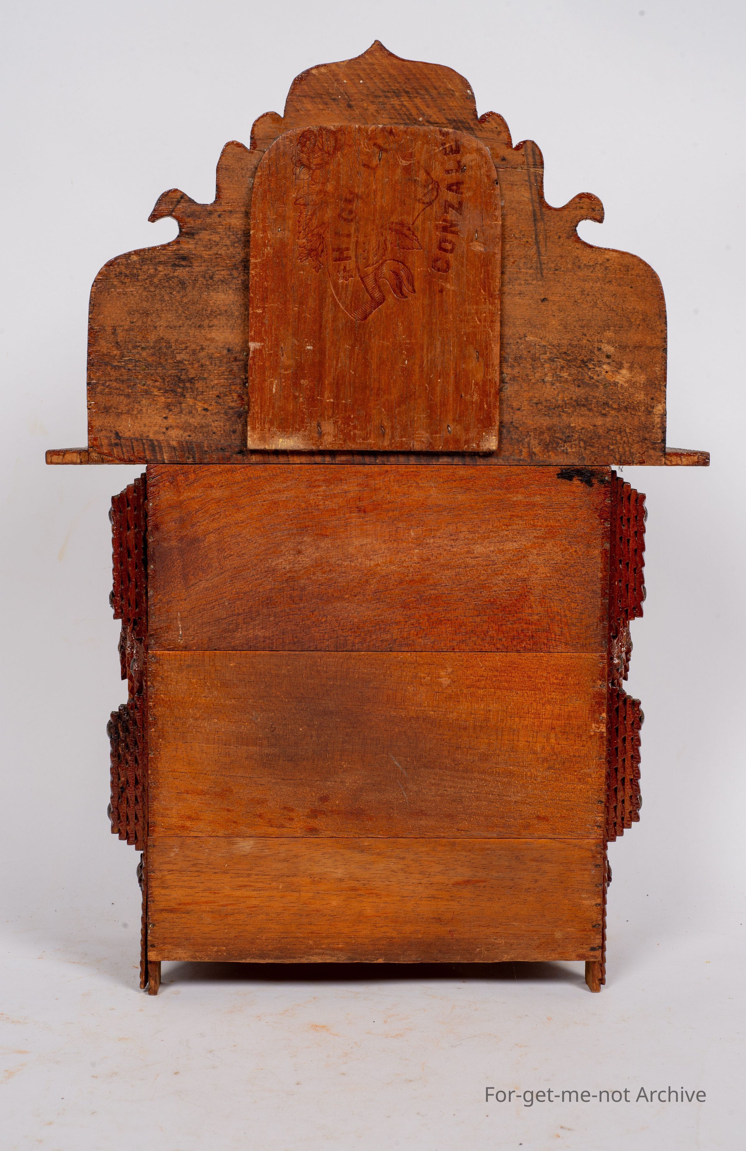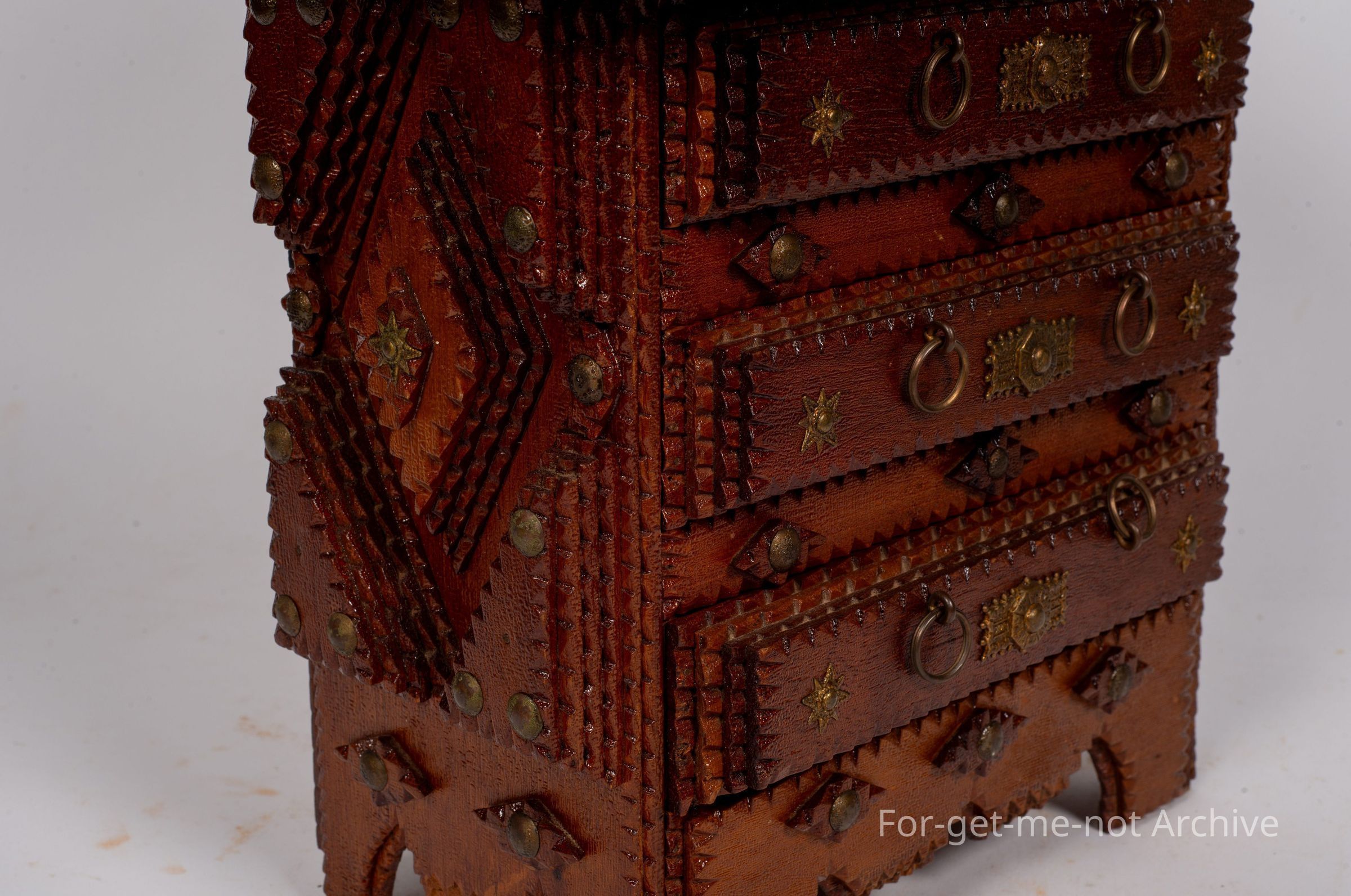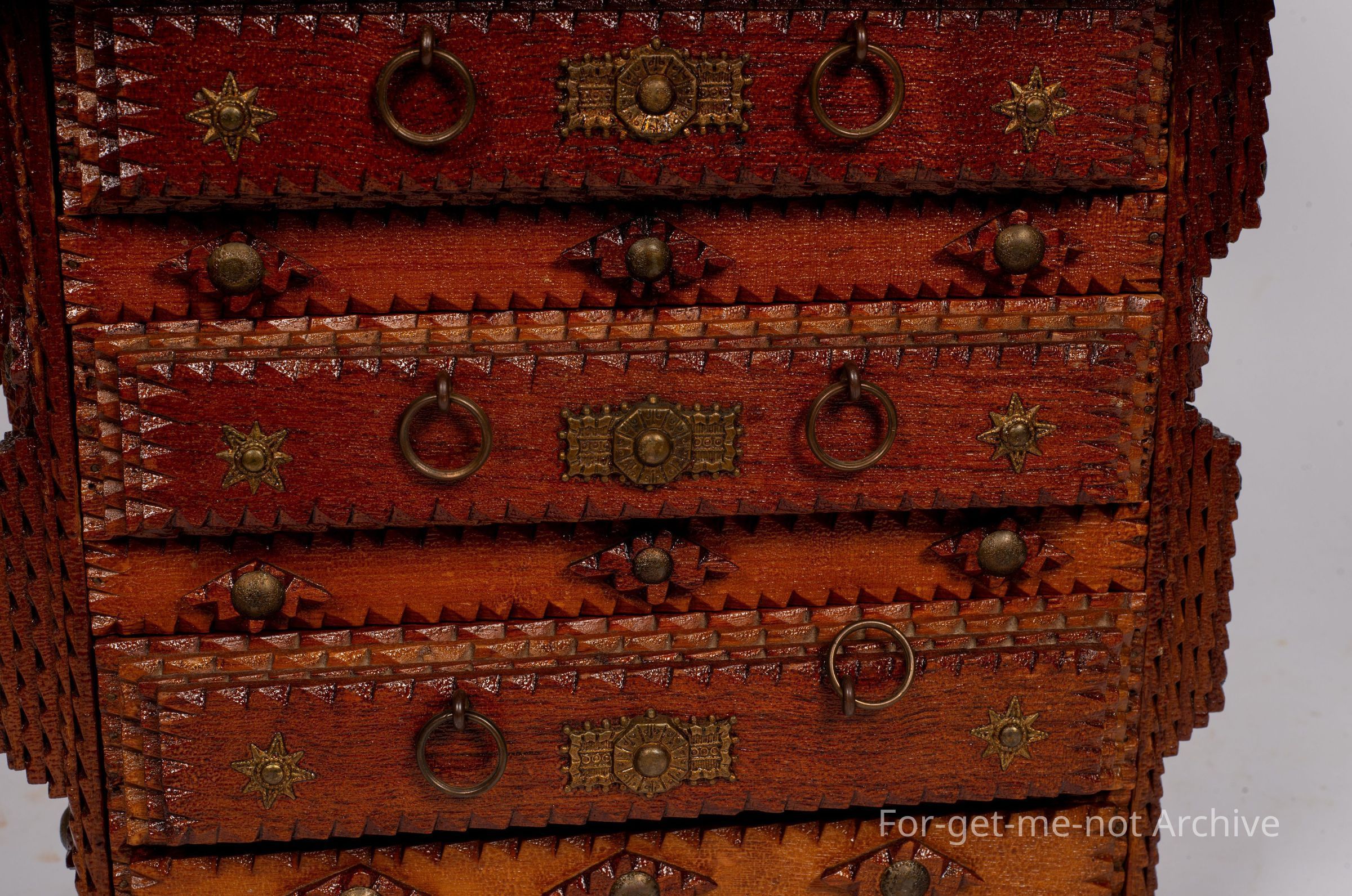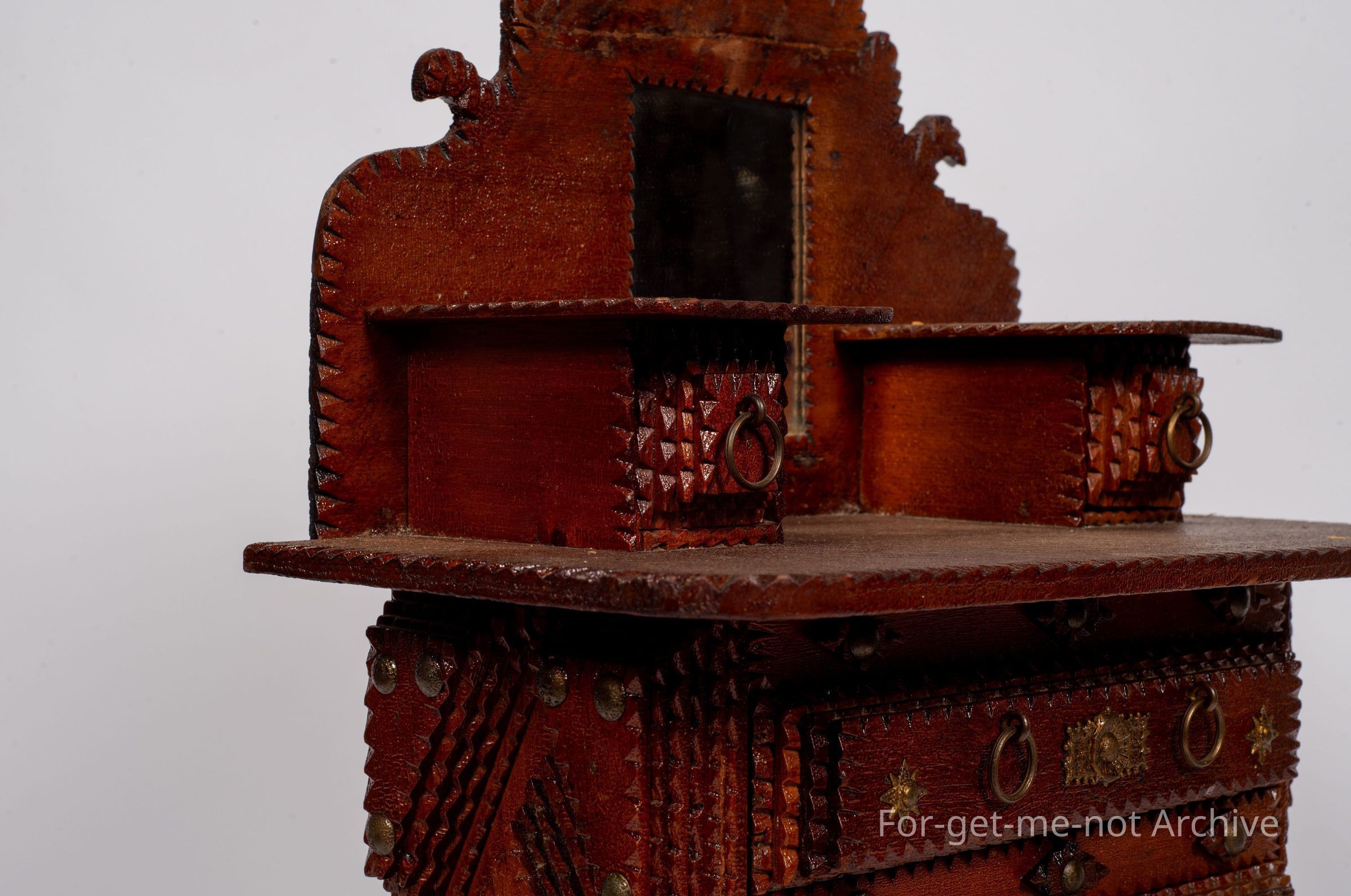 Chip craft dresser. This one has 3 drawers that go across at the base with 2 small ones at the top. This also has a backing board with a mirror. This is all in beautiful condition. A lot of work in it. This one wouldCollection