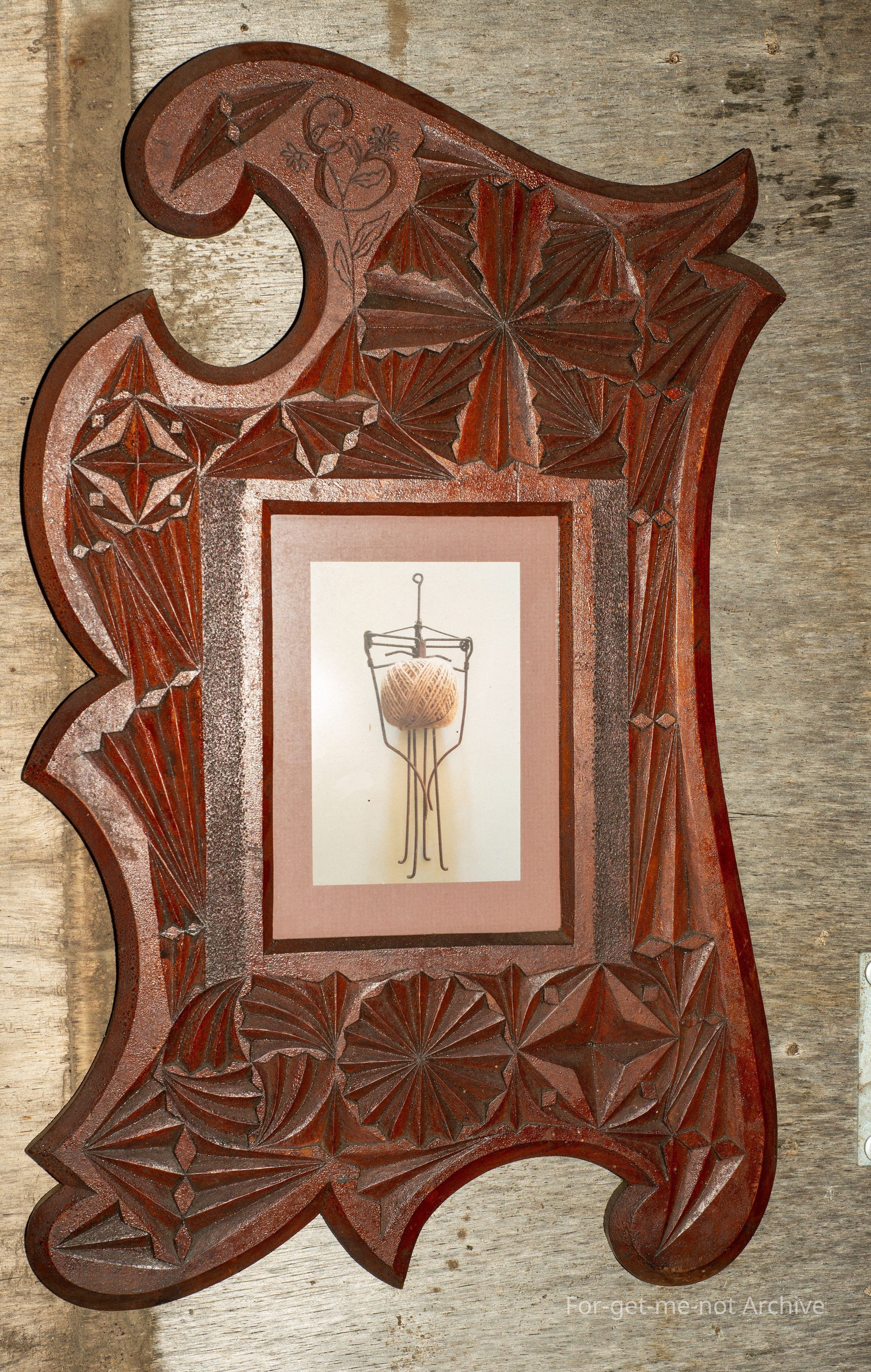A beautifully ornate, cut piece, with a glorious design and a very high quality work as far as a chip craft goes, with a, a frame in the middle of a photograph of a wire work string dispenser.Collection