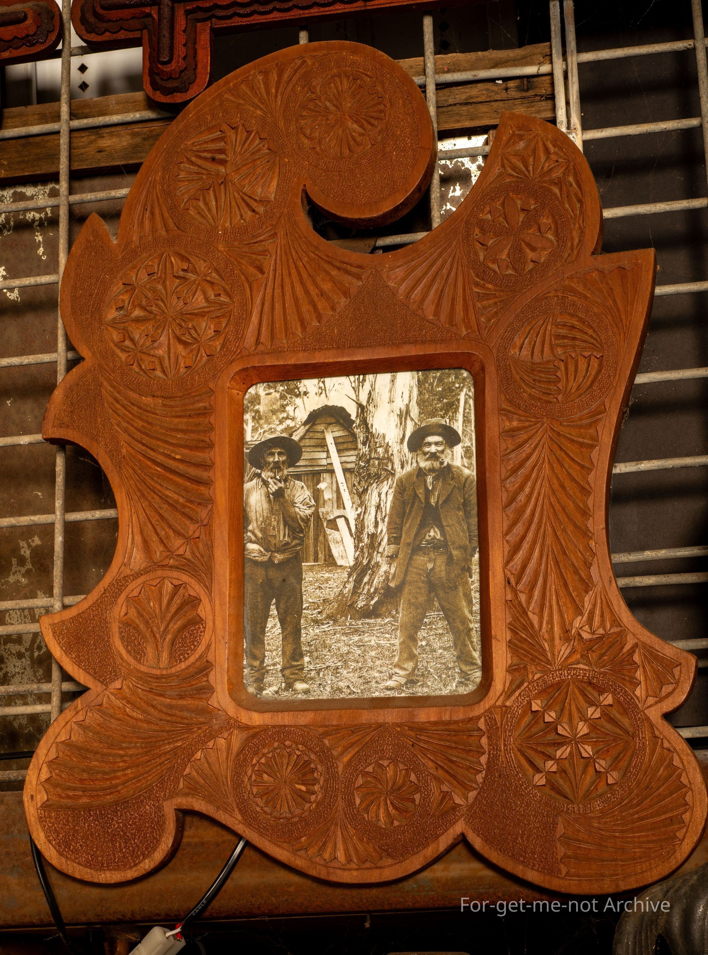 This is a chip craft, very ornate picture frame, beautiful carvings, very artistic design with a photograph of early, timber cutters